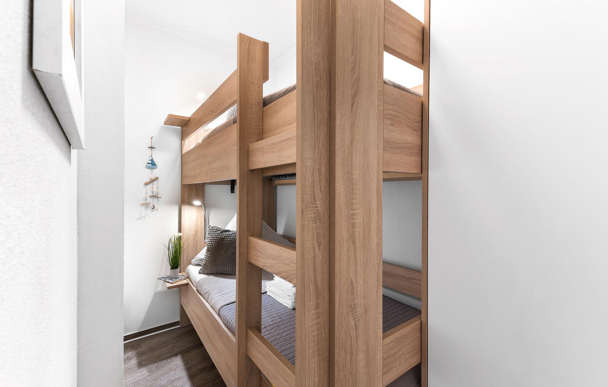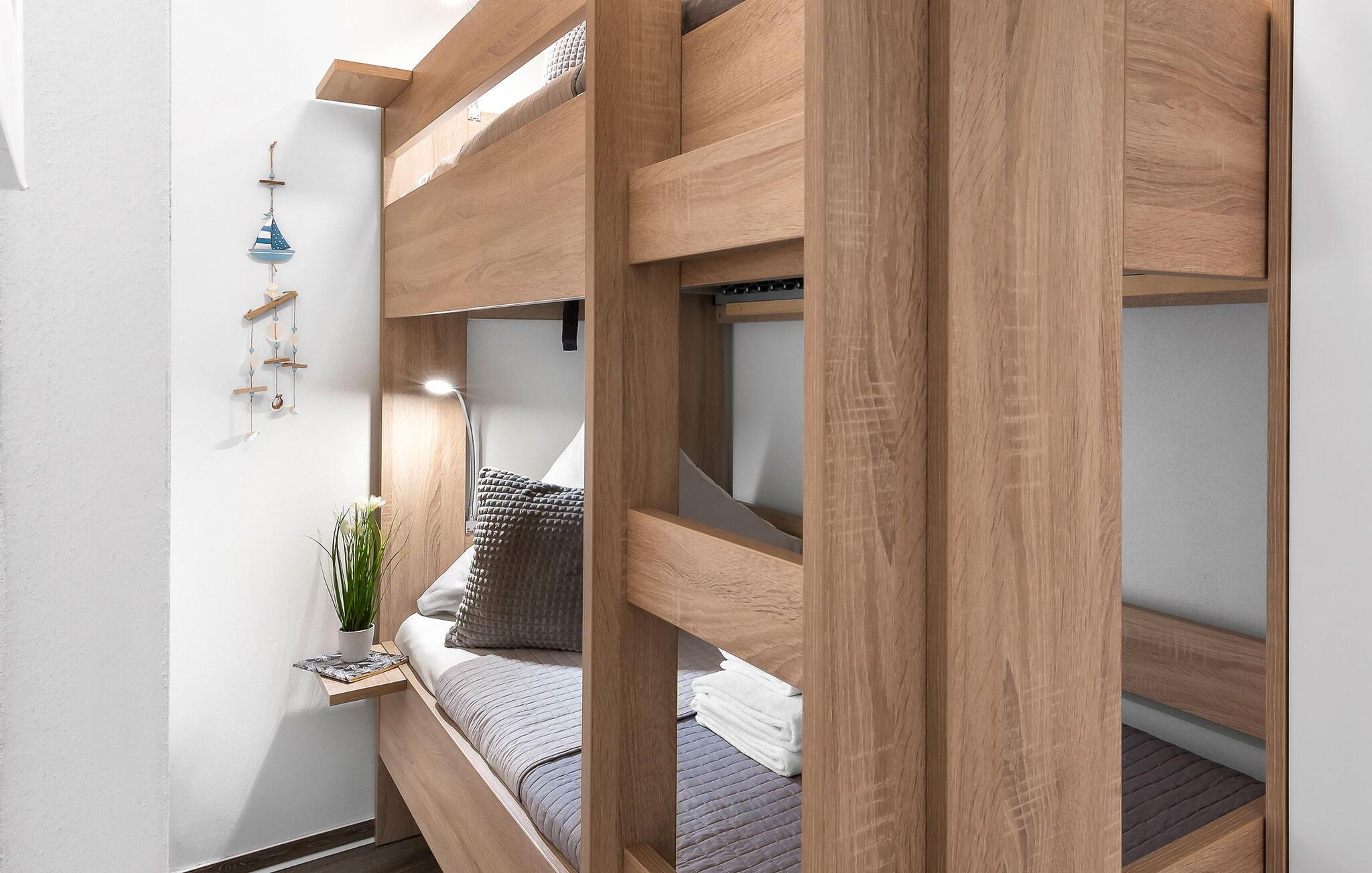 Soveværelset byder på en komfortabel dobbeltseng (180 cm x 200 cm) og et andet 40 tommer fjernsyn samt et pengeskab til personlige ejendele. Et ekstra værelse med en køjeseng (90 cm x 200 cm) giver plads til børn eller ekstra gæster.