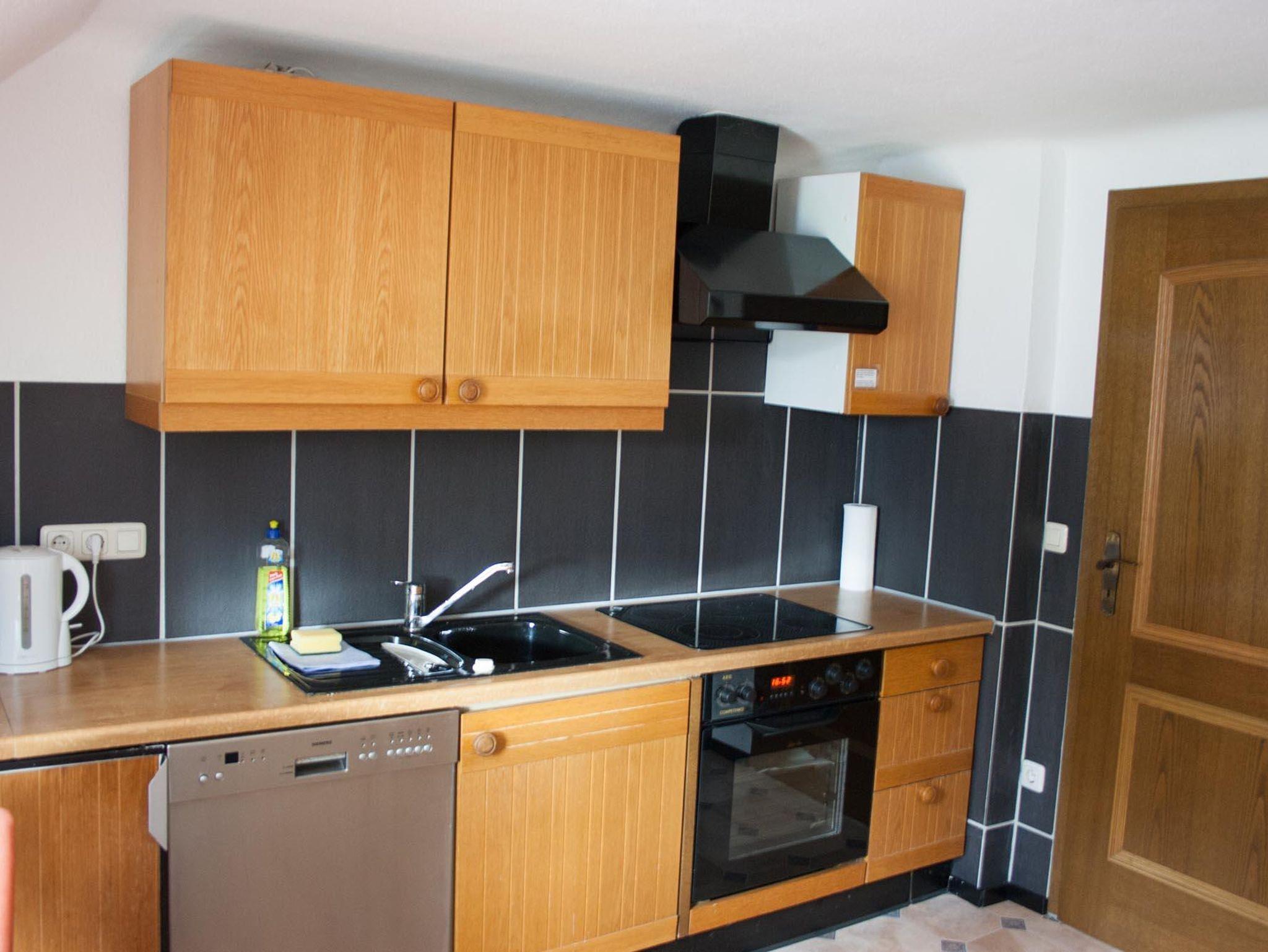 Die 55 m² große Ferienwohnung in einem typischen Eifeler Fachwerkhaus verfügt über eine komplett eingerichtete Küche mit Essecke, einem Schlafzimmer mit Doppelbett, einem Wohnraum mit Sitzecke und Sat-TV und einem geräumigen Bad mit Dusche.