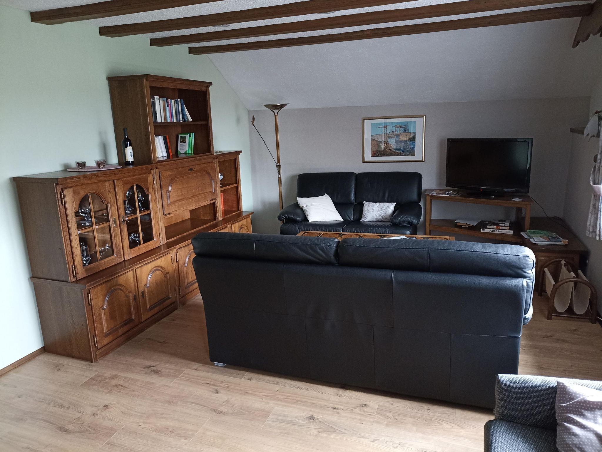Die Ferienwohnung ist circa 85 m² groß und besteht aus Küche, Wohn/Esszimmer, Schlafzimmer, Bad und einem separatem WC. Zur Wohnung gehört zusätzlich eine ungefähr 20 m² große Terrasse. Die Wohnung wurde bis vor kurzer Zeit von uns selbst bewohnt. Wir haben früher sehr viel Holz verbaut, das Badezimmer und das separate WC wurden vor acht Jahren generalsaniert.