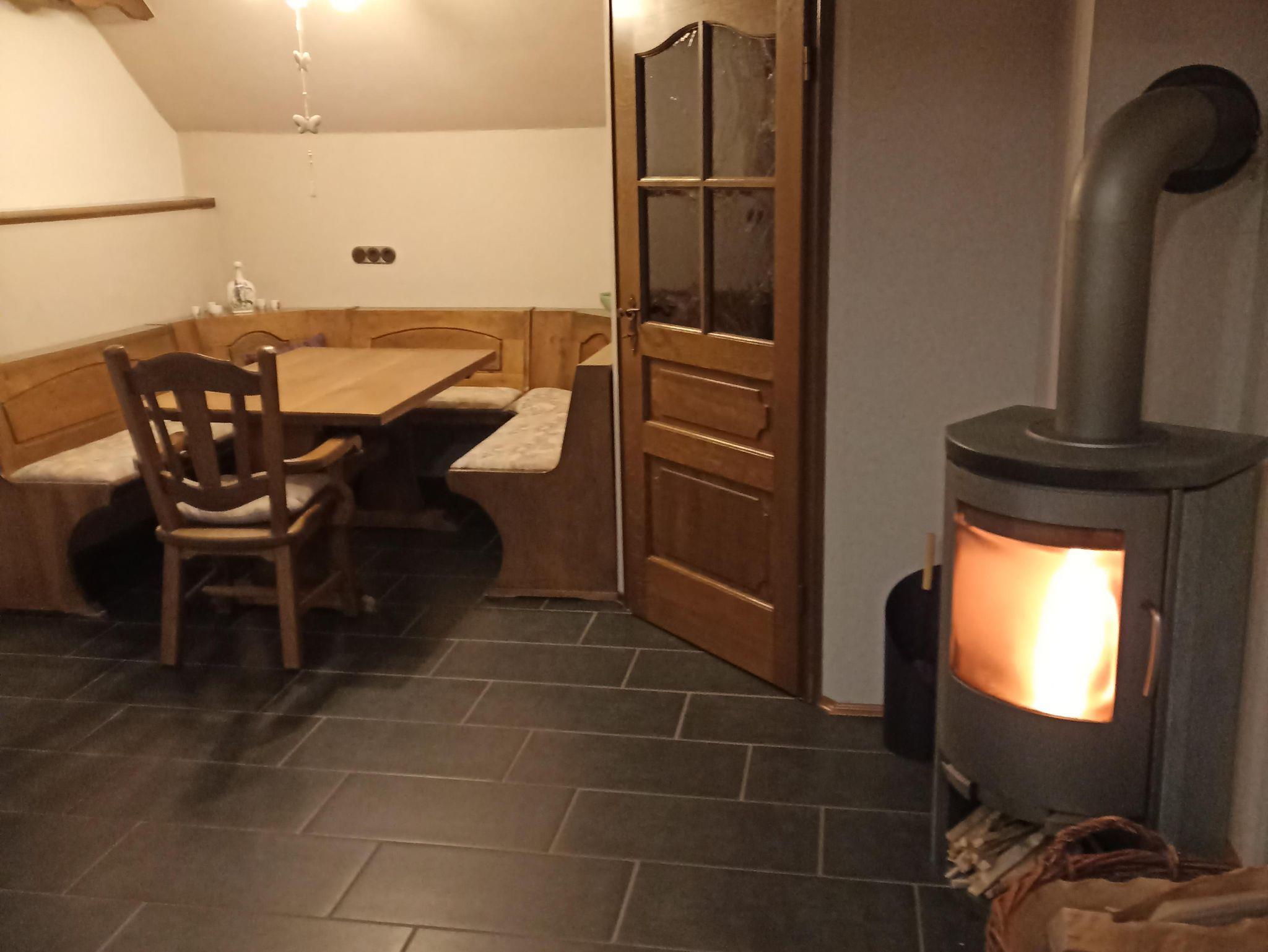 Die Ferienwohnung bietet Platz für 2-4 Personen. Es gibt ein Schlafzimmer und im Wohnzimmer zusätzlich zu den Sitzmöbeln eine Schlafcouch. Seit kurzem ist ein Specksteinofen aufgestellt. Hier könnt Ihr, wenn ihr wollt, abends dem loderndem Feuer zusehen.