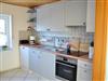 Die helle Küche bietet eine Spülmaschine, Backofen, Ceran-Kochfeld und einen Kühlschrank mit Gefrierfach.