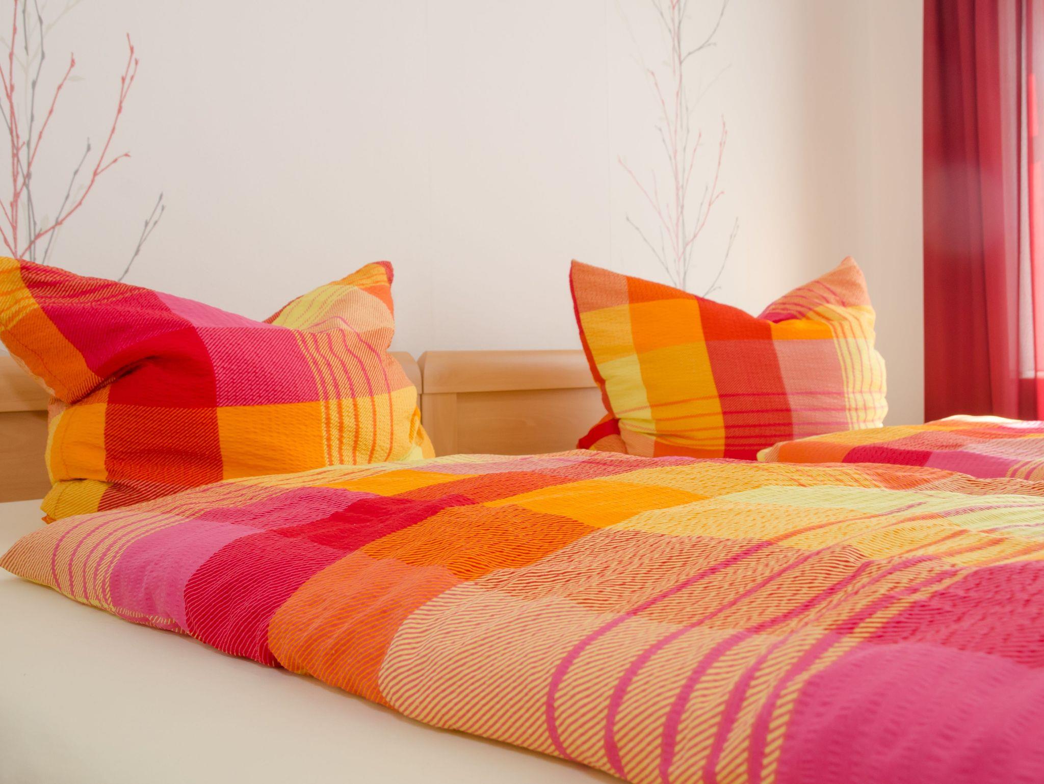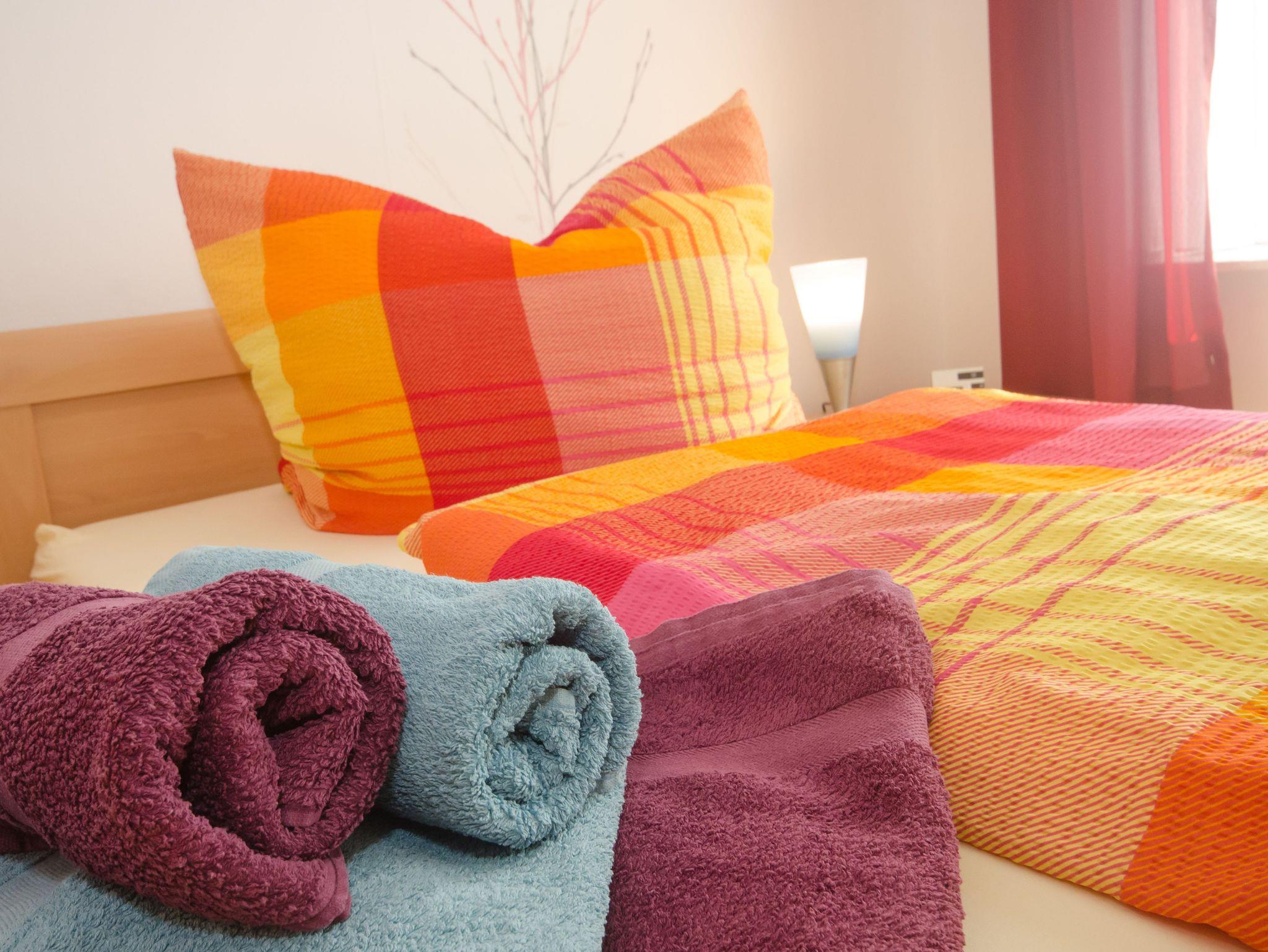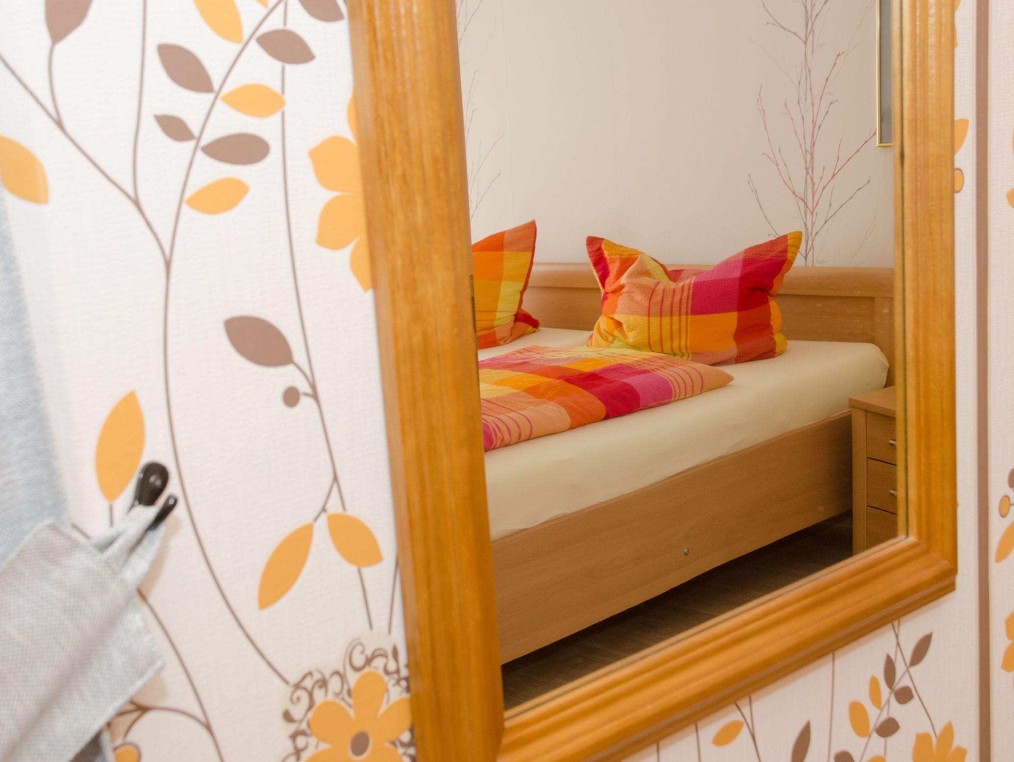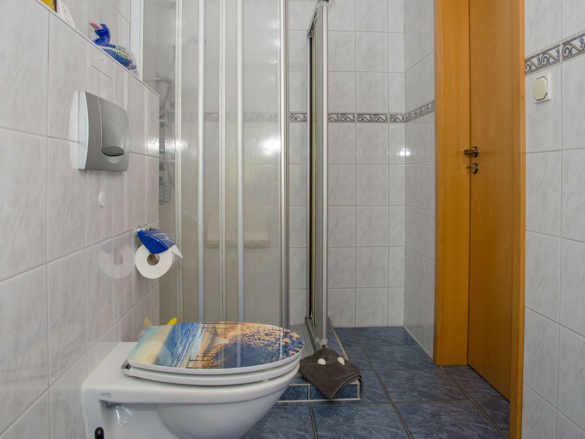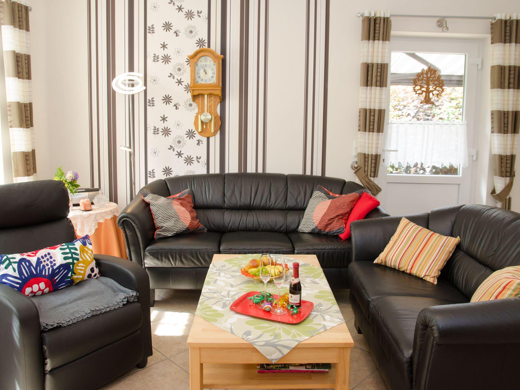 In dem großen, hellen Wohnzimmer steht eine Couchgarnitur mit einem Fernsehsessel mit Tisch und eine Schrankwand mit großem Flachbildschirm. Außerdem können Sie ein einer kleinen Stuhl-und-Tisch-Combi gemütlich ein Buch lesen. In der Küche finden Sie alles was Sie benötigen: Wasserkocher, Kaffeemaschine, kleiner Backofen sowie einen Kühlschrank und eine 2 Herdplatte. Im geräumigen Schlafzimmer steht ein Doppelbett, ein großer Wandschrank sowie zwei Stühle. Badezimmer mit Dusche und WC. Maximal 2 Erwachsene Personen und 1 Kleinkind sind unterzubringen.