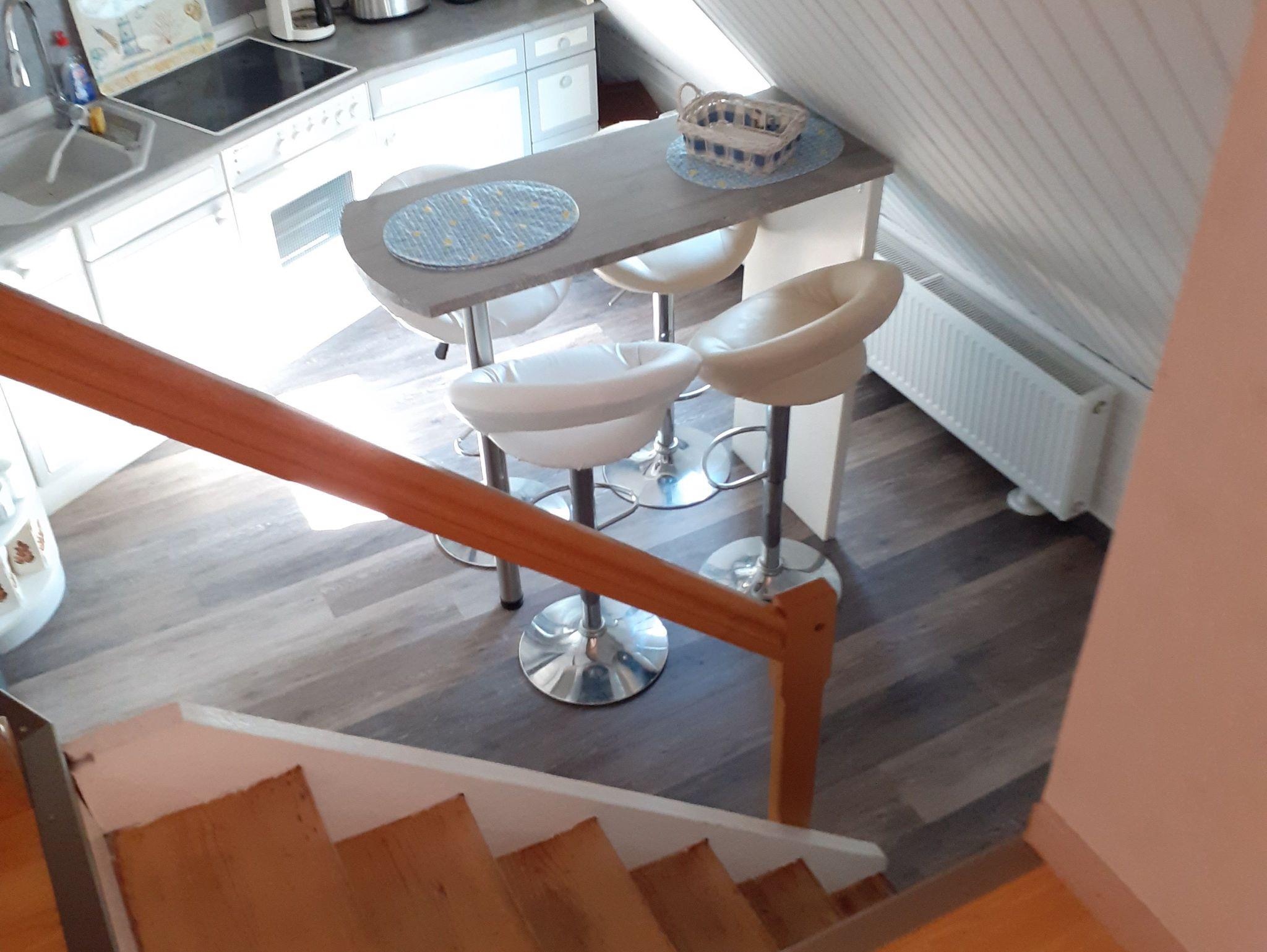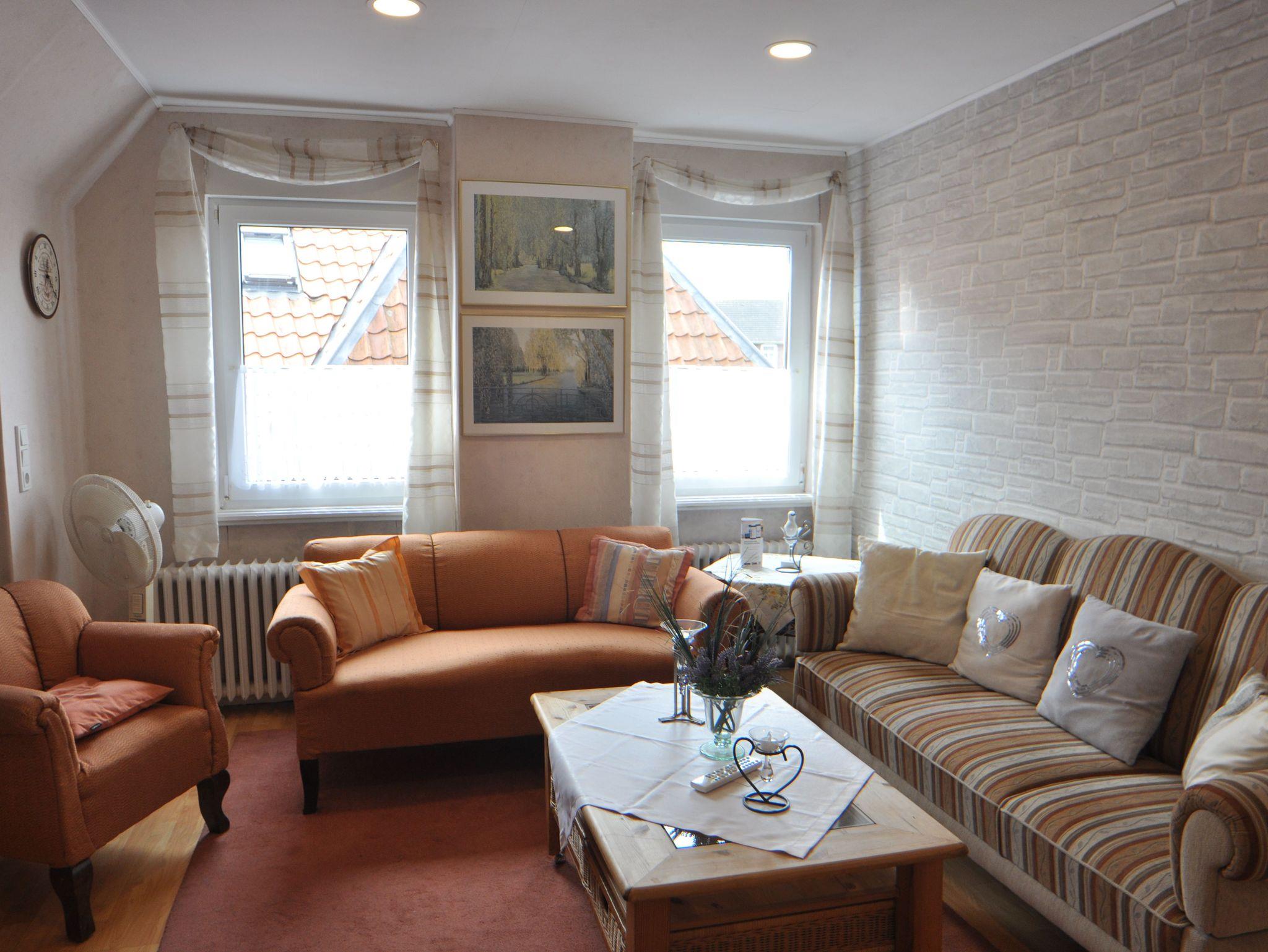 2020 renovierte, 52 qm große Oberwohnung für 2 bis 4 Personen in zentraler Lage Oldersums. Idealerweise geeignet für zwei Erwachsene und zwei Kinder. Das Bett in dem Schlafzimmer ist 1,80 x 1,90 m, das Bett im kombinierten Wohn/-Schlafzimmer ist 1,60 x 2 m groß. Die Dusche hat eine Stehhöhe von 1,82 m.