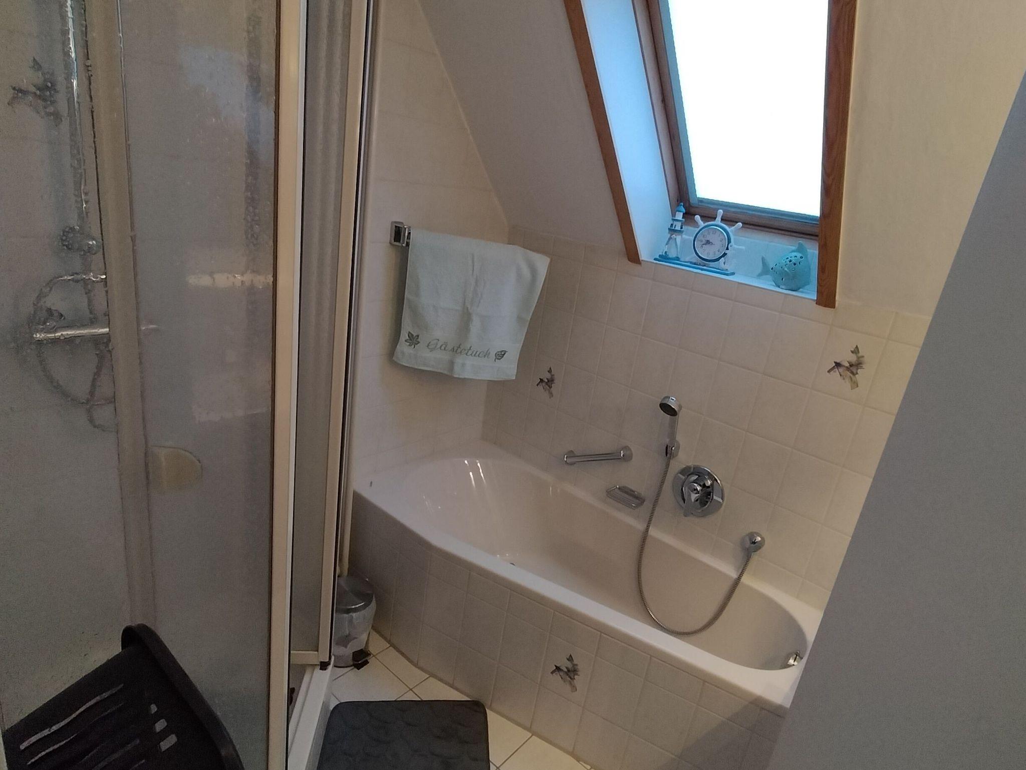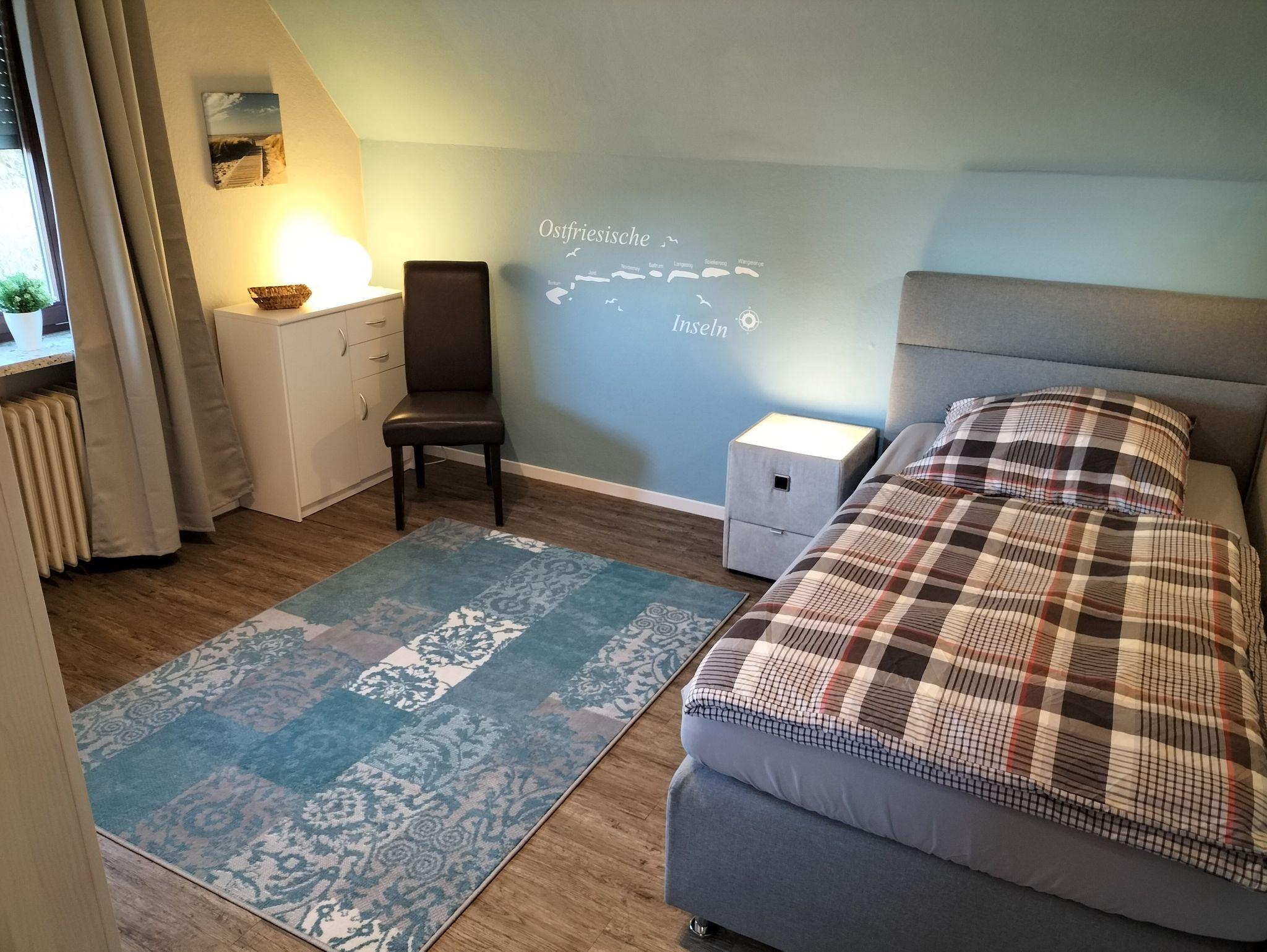 Großzügige Oberwohnung mit separater Küche mit Essbereich, Wohnzimmer mit Polstergarnitur und TV, Badezimmer mit Dusche und Badewanne, WC separat sowie drei Schlafzimmern. Ein Doppelzimmer mit zwei Einzelbetten, die aneinander oder getrennt gestellt werden können sowie zwei Einzelzimmer mit jeweils einem Einzelbett. Balkon mit Blick auf den Ems-Seitenkanal vorhanden. Eine Fahrrad-Abstellmöglichkeit ist gegeben. Maximal ein Hund (30 cm Schulterhöhe) erlaubt. Bitte beachten Sie, dass es sich um eine Oberwohnung mit Zugang über eine Treppe handelt.