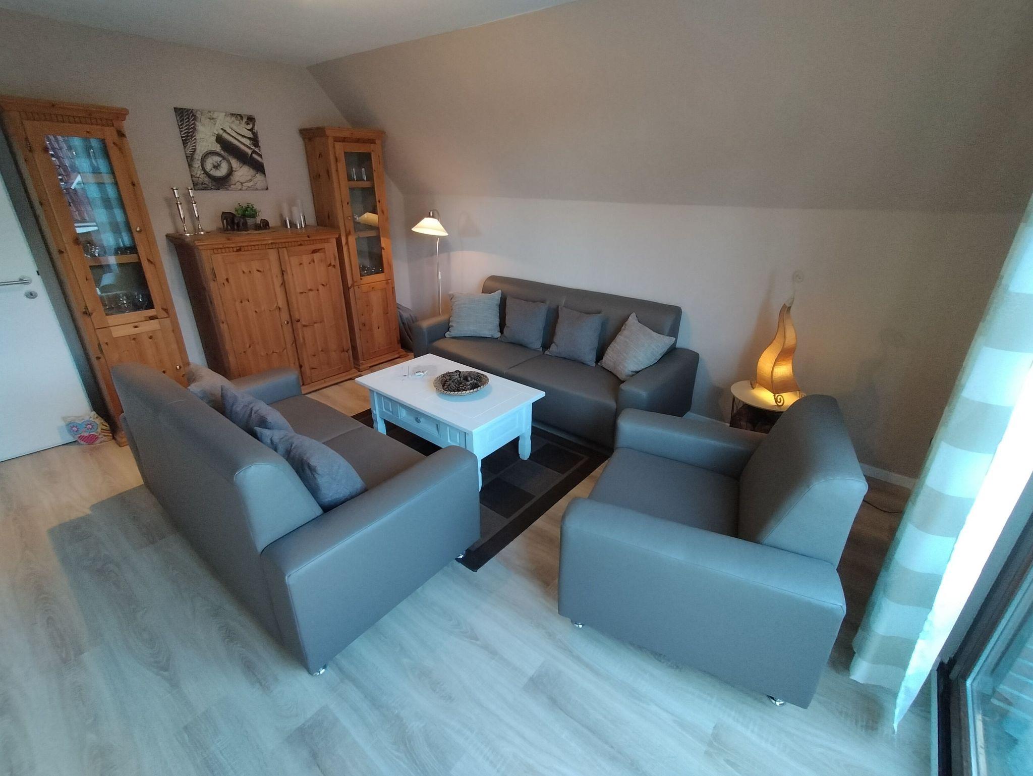 Ferienwohnung mit separater Küche mit Essbereich, Wohnzimmer mit Polstergarnitur und TV, Badezimmer mit Dusche und Badewanne, WC separat sowie drei Schlafzimmern. Ein Doppelzimmer mit zwei Einzelbetten, die aneinander oder getrennt gestellt werden können sowie zwei Einzelzimmer mit jeweils einem Einzelbett.