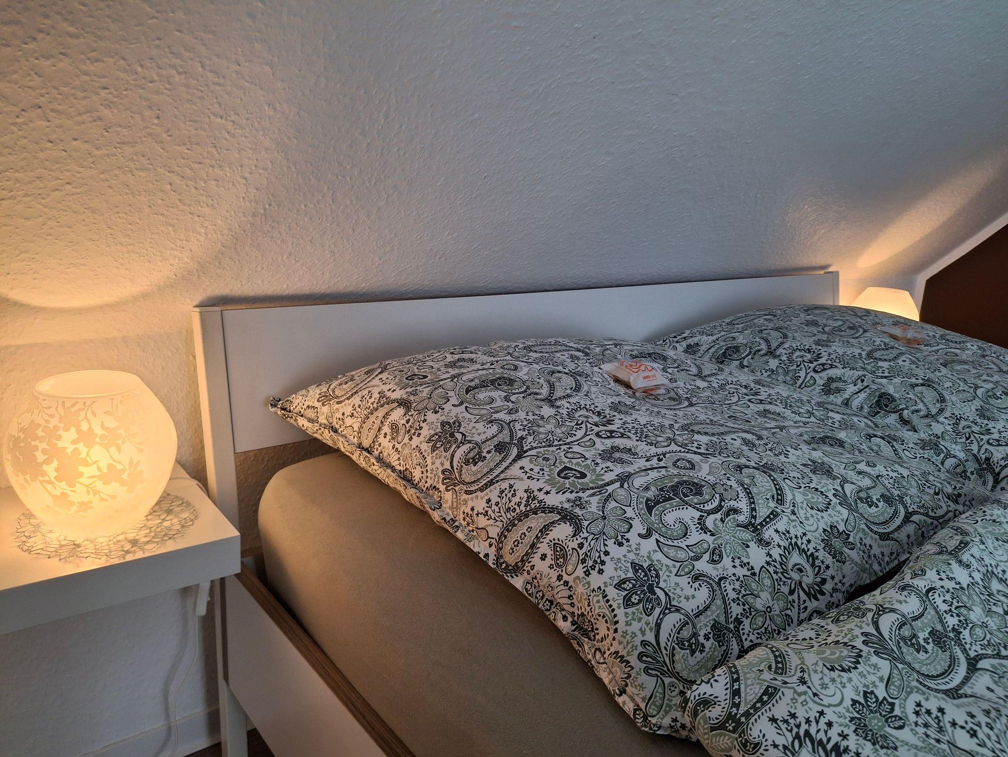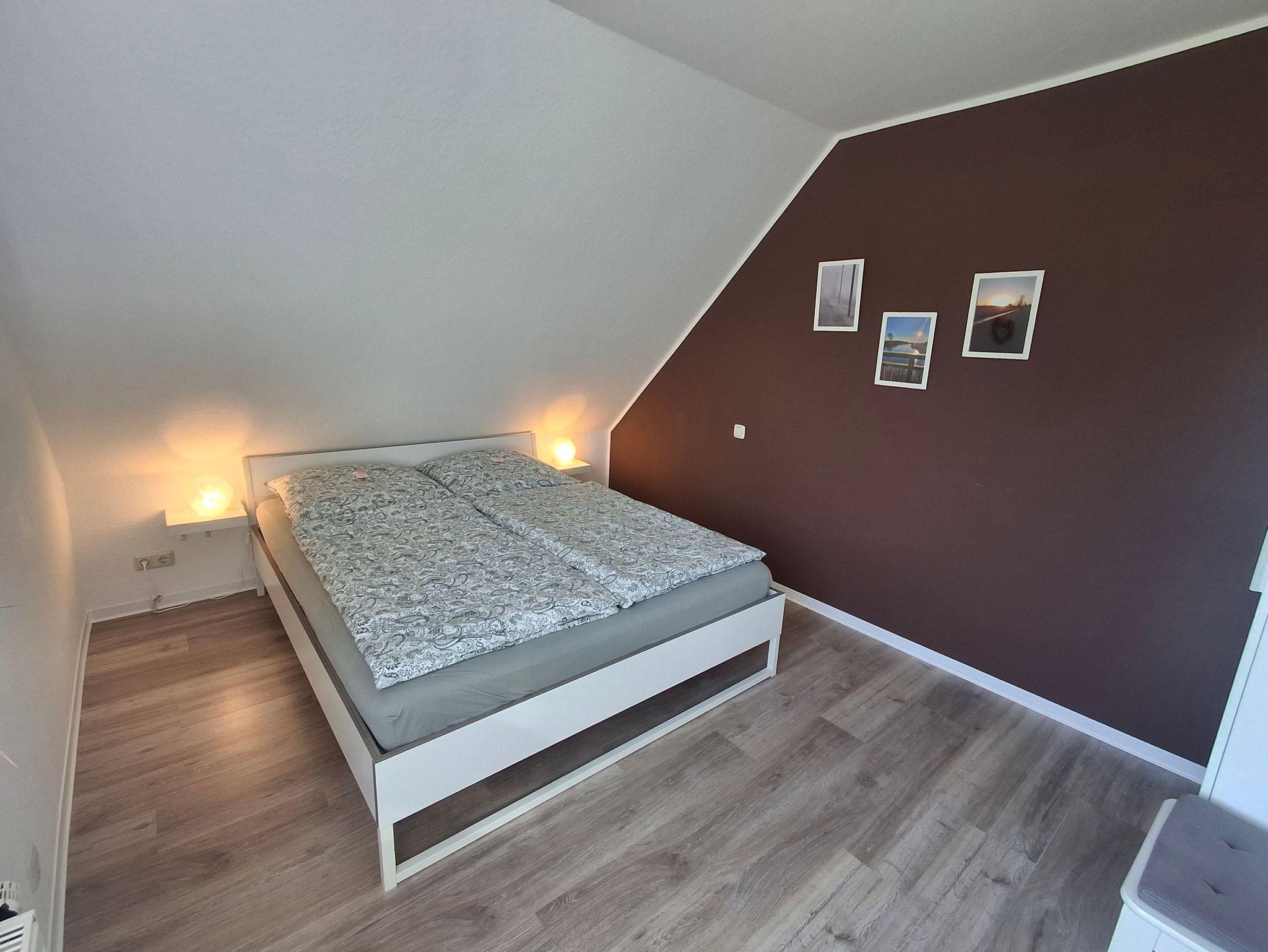 70 qm große Ferienwohnung im Obergeschoss für vier Personen. Anfang 2022 renovierte, modern und mit viel Liebe zum Detail eingerichtete helle Räume. Ihnen stehen ein Schlafzimmer mit französischem Bett (1,60 x 2 m) sowie ein Schlafzimmer mit zwei getrennt stehenden Betten (0,90 x 2 m) zur Verfügung. In der hellen Küche mit voll ausgestatteter Küchenzeile und Essbereich können Sie morgens ausgiebig frühstücken und ruhig und erholt in den Tag starten. Das Wohnzimmer bietet Ihnen eine gemütliche Sofa-Garnitur mit Flachbild-Fernseher. Das Badezimmer ist mit einer ebenerdigen Dusche und einem WC ausgestattet.