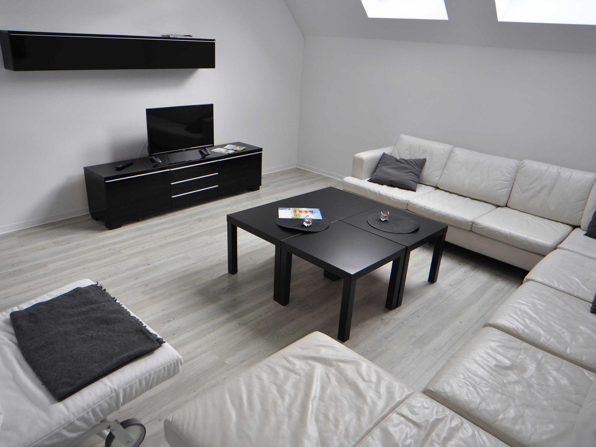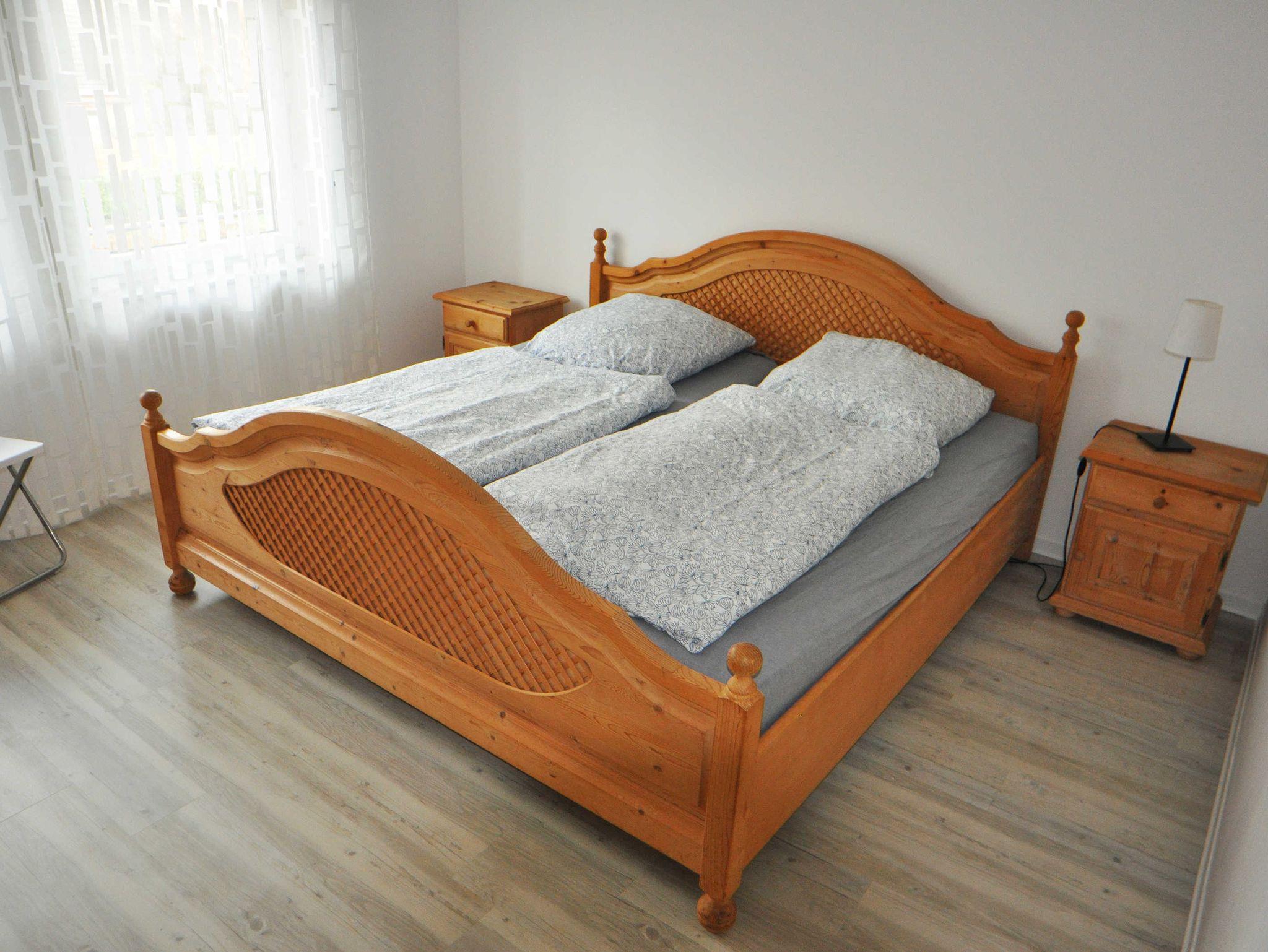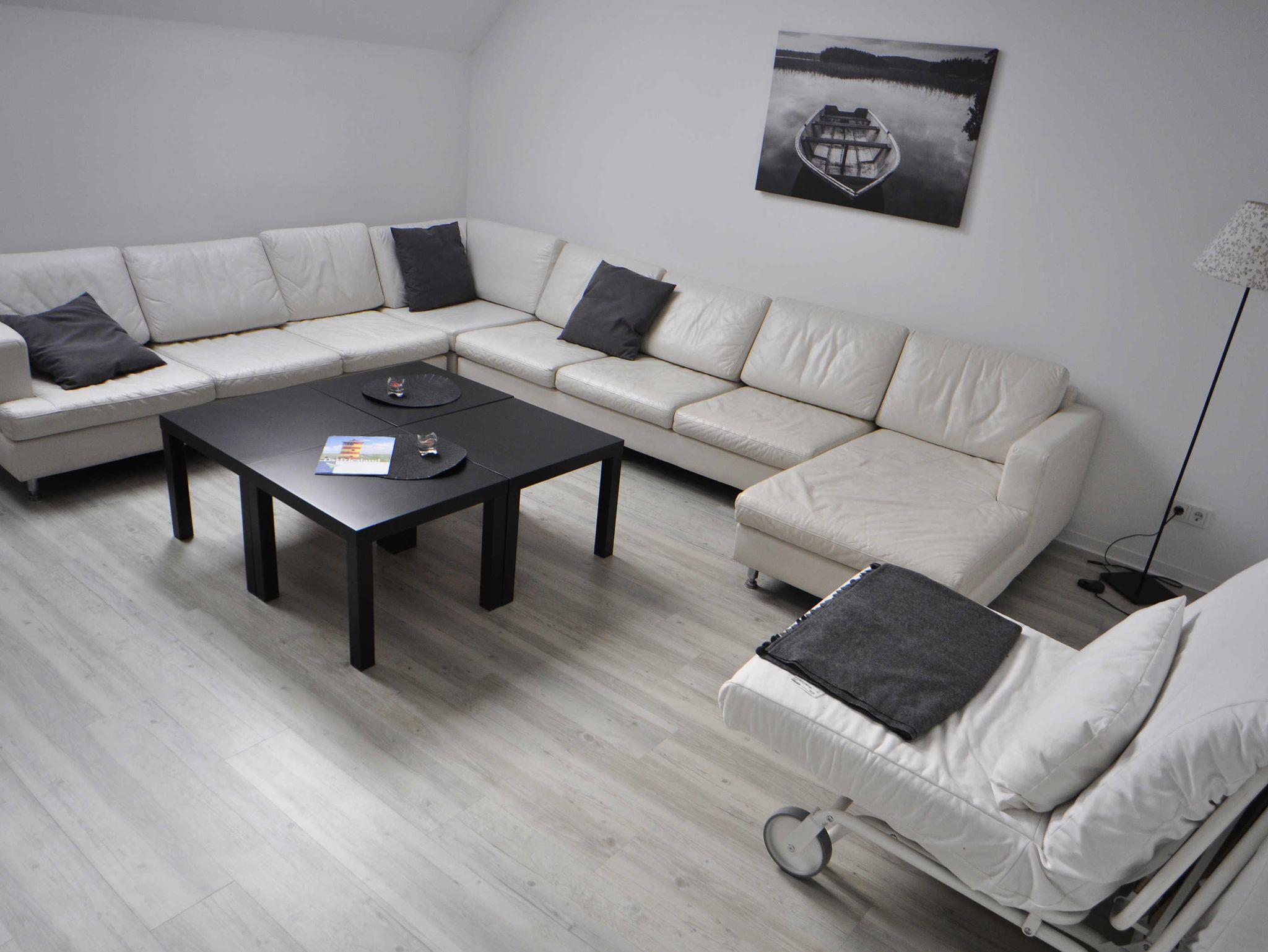 Die Wohnung im Obergeschoss verfügt über ein Schlafzimmer mit Doppelbett, ein Schlafzimmer mit Einzelbett, ein Badezimmer mit Dusche und WC, eine Küche (Küchenzeile mit E-Herd, Geschirrspülmaschine, Kühlschrank mit Gefrierfach, Wasserkocher und Kaffeemaschine) sowie ein Wohnzimmer mit moderner Ledergarnitur, Sessel mit Schlaffunktion und TV. Von der Küche aus ist der Balkon erreichbar. Balkonmöbel sind vorhanden.