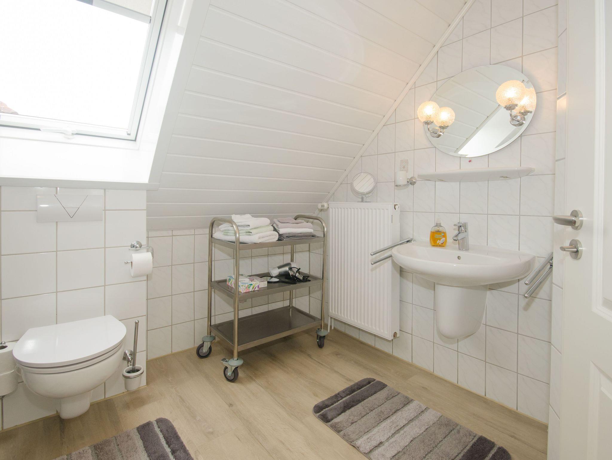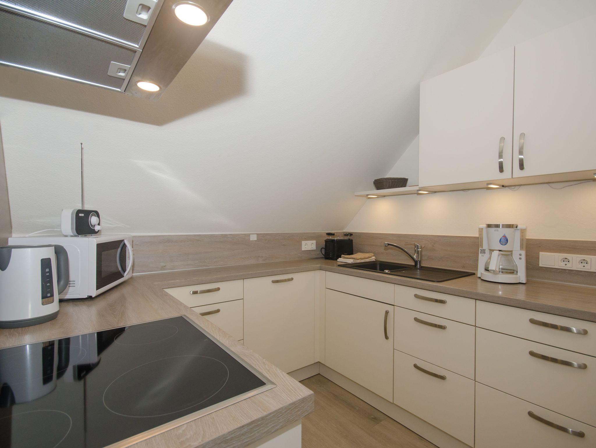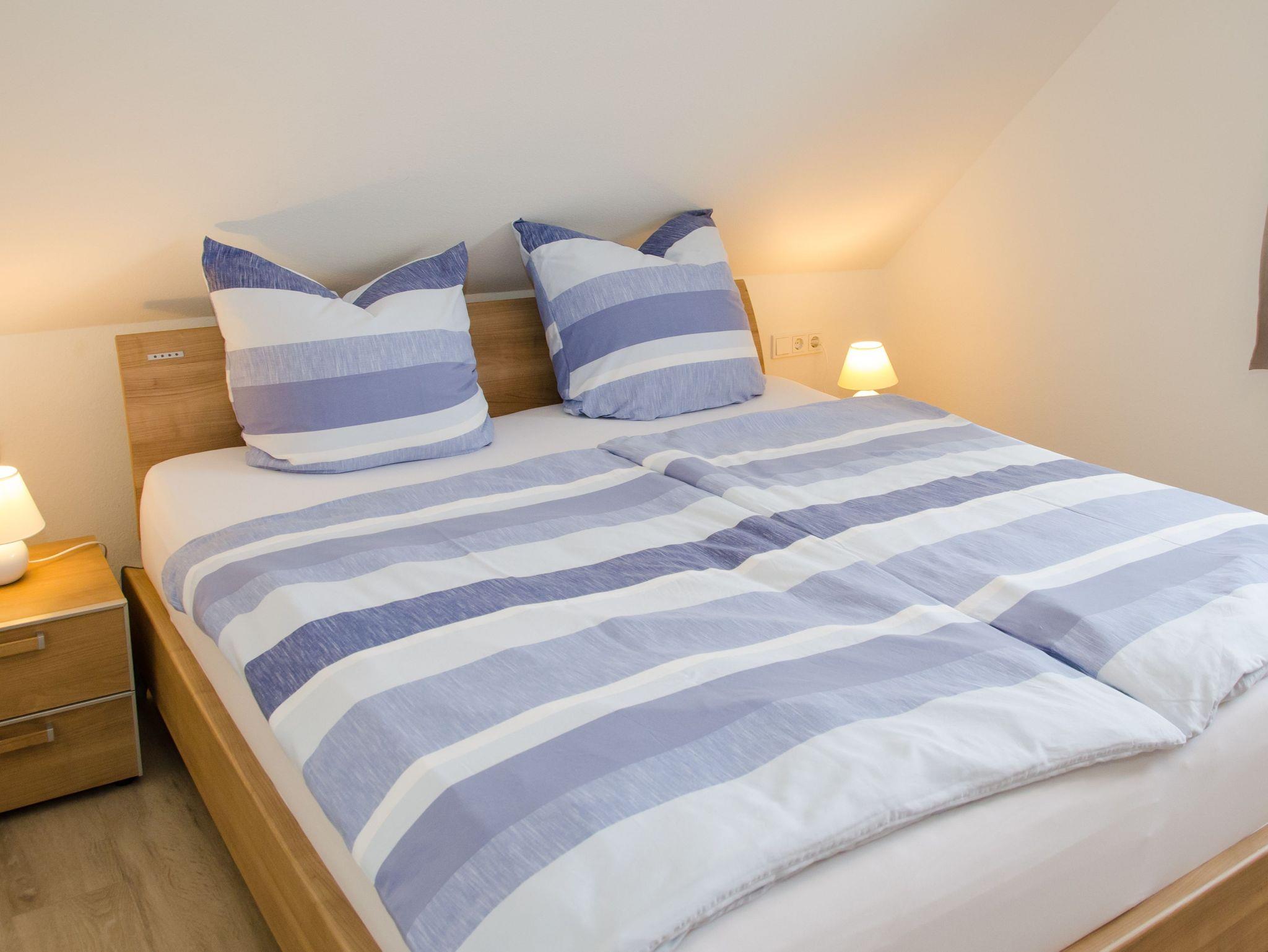 Die Ferienwohnung liegt im Obergeschoss und verfügt über eine separate Eingangstür. Mit einem Schlafzimmer mit Doppelbett und einer großen gemütlichen Schlafcouch im Wohnzimmer bietet sie Platz für maximal vier Personen. Die Wohnung überzeugt durch ihre hellen und modern eingerichteten Räume. Direkt neben der Küche befindet sich ein Esszimmer mit Zugang zum Balkon. Das Badezimmer verfügt über eine Dusche und ein WC. Fön, Waschmaschine und Wäschetrockner sind vorhanden.
