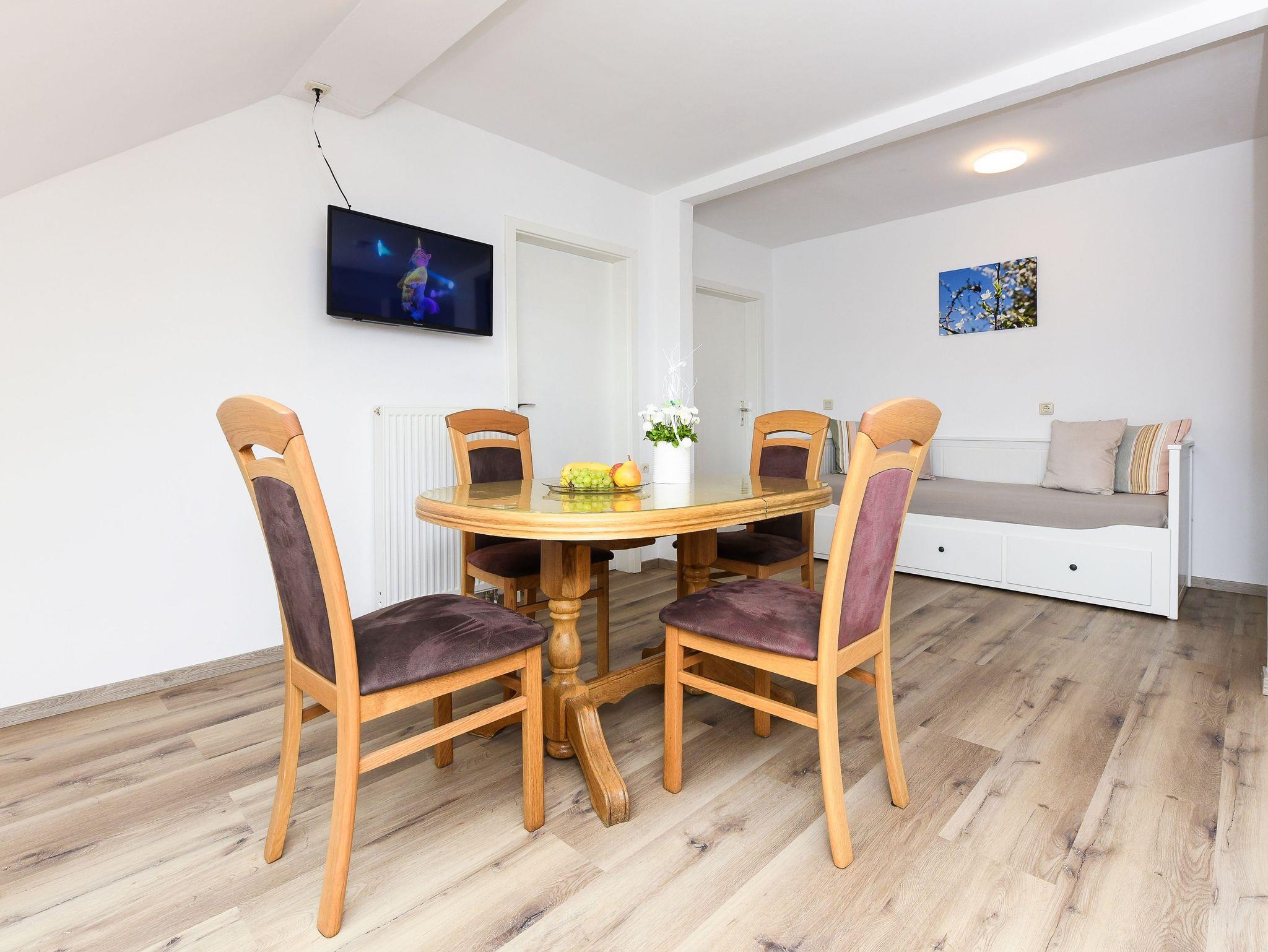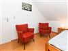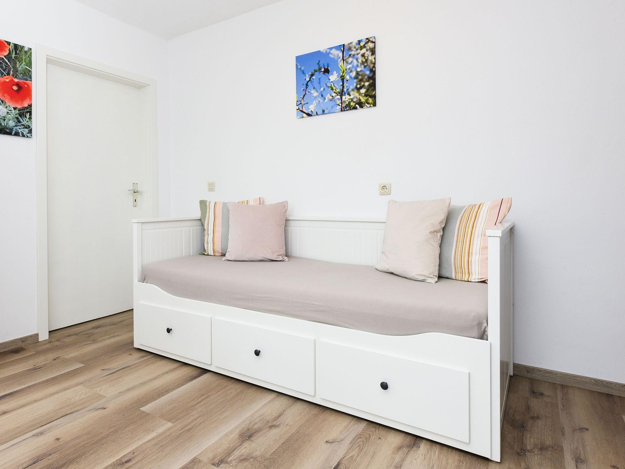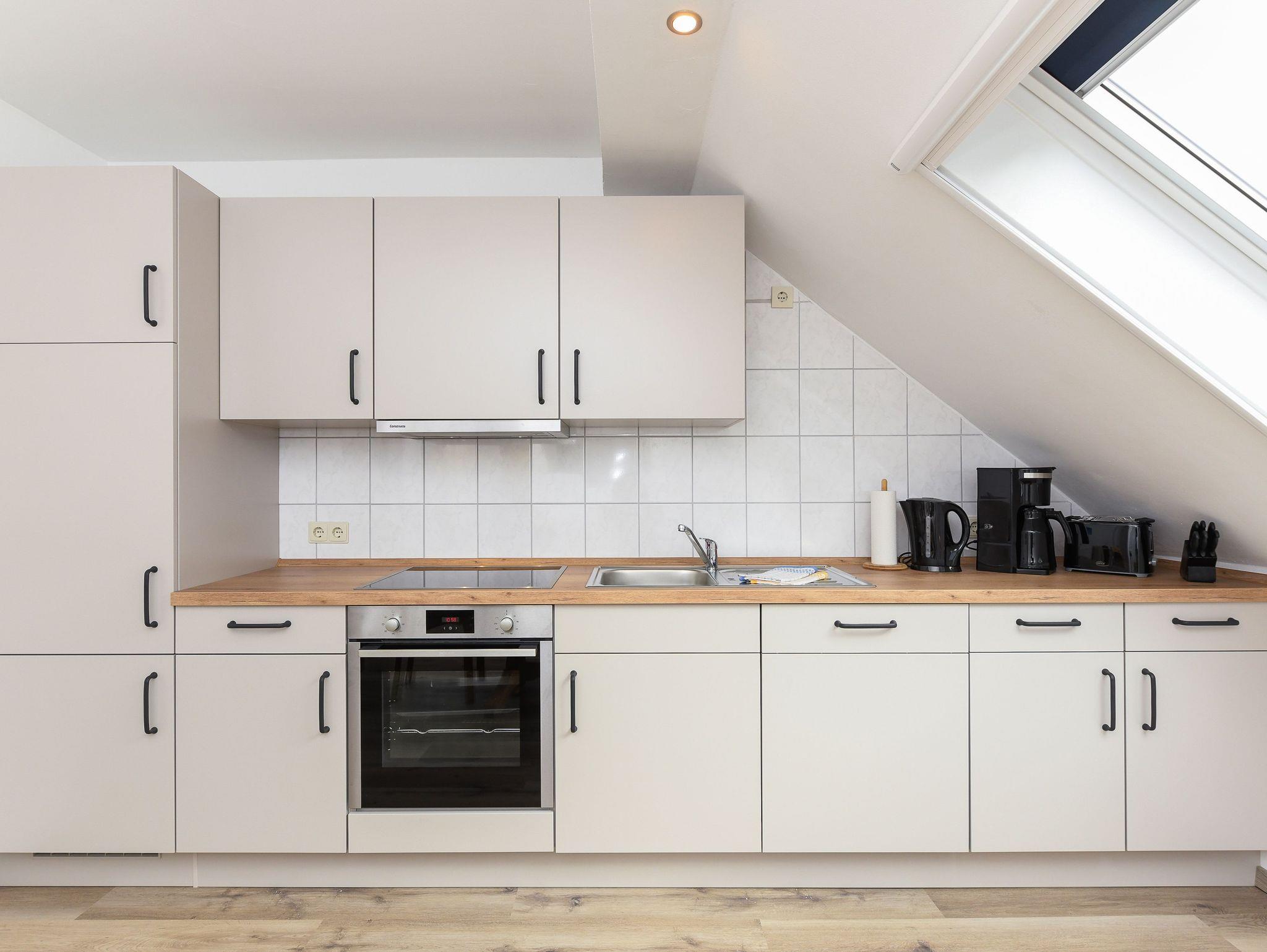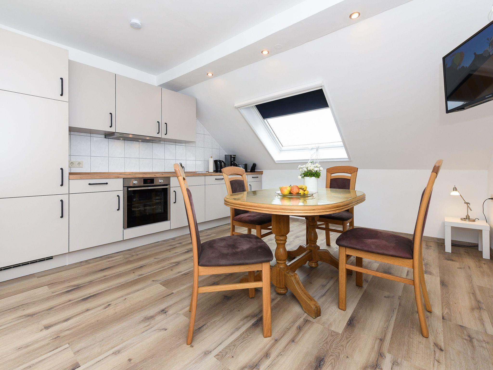 Größe ca. 55 Quadratmeter, Wohnraum mit integrierter Küche und mit Schlafmöglichkeit, Schlafzimmer, zweites, separates Schlafzimmer/Kinderzimmer, Badezimmer mit Dusche, Waschtisch und WC, Obergeschoss, optimal für 2 bis 5 Personen und zusätzlich ein Kleinkind.