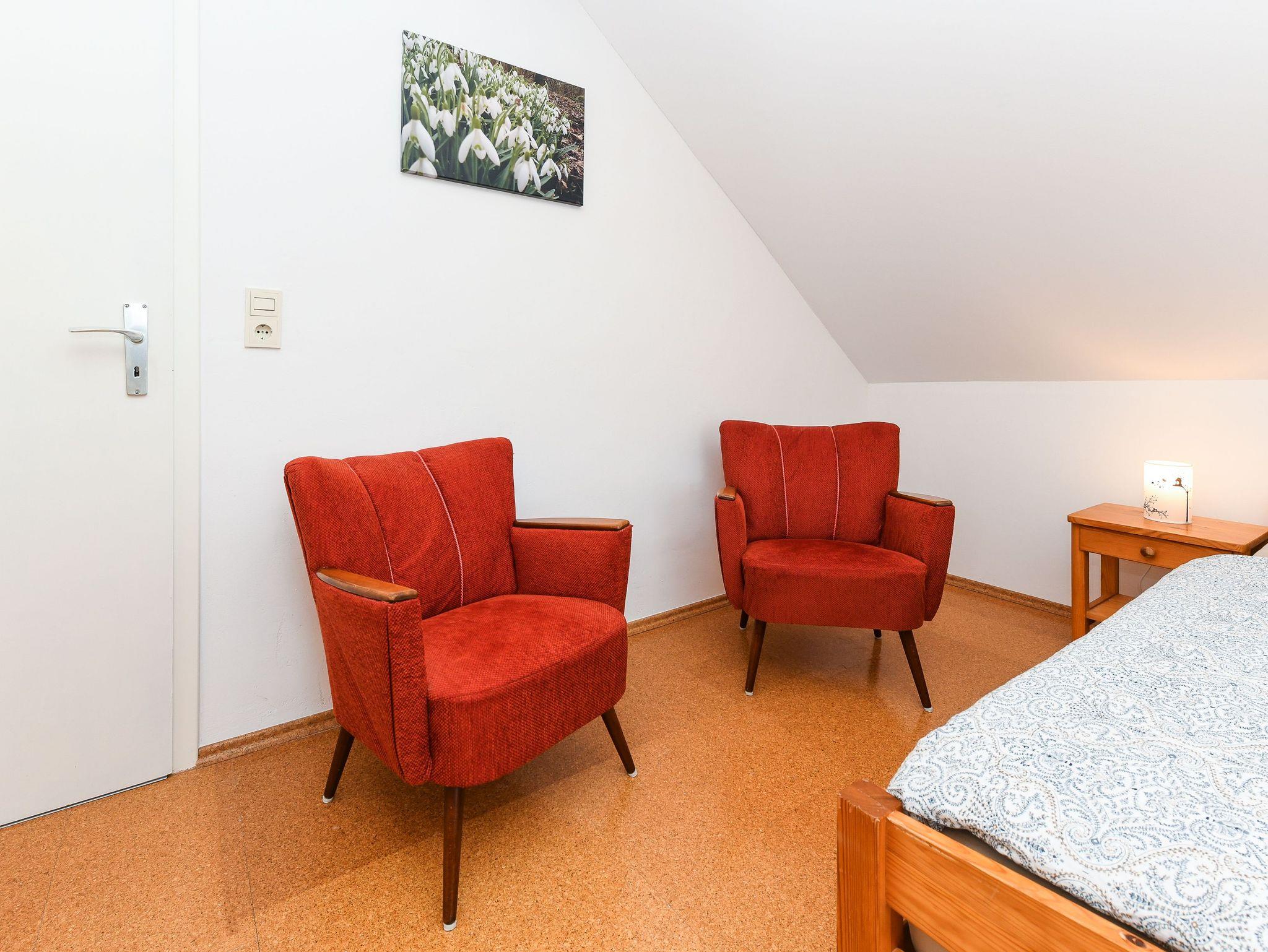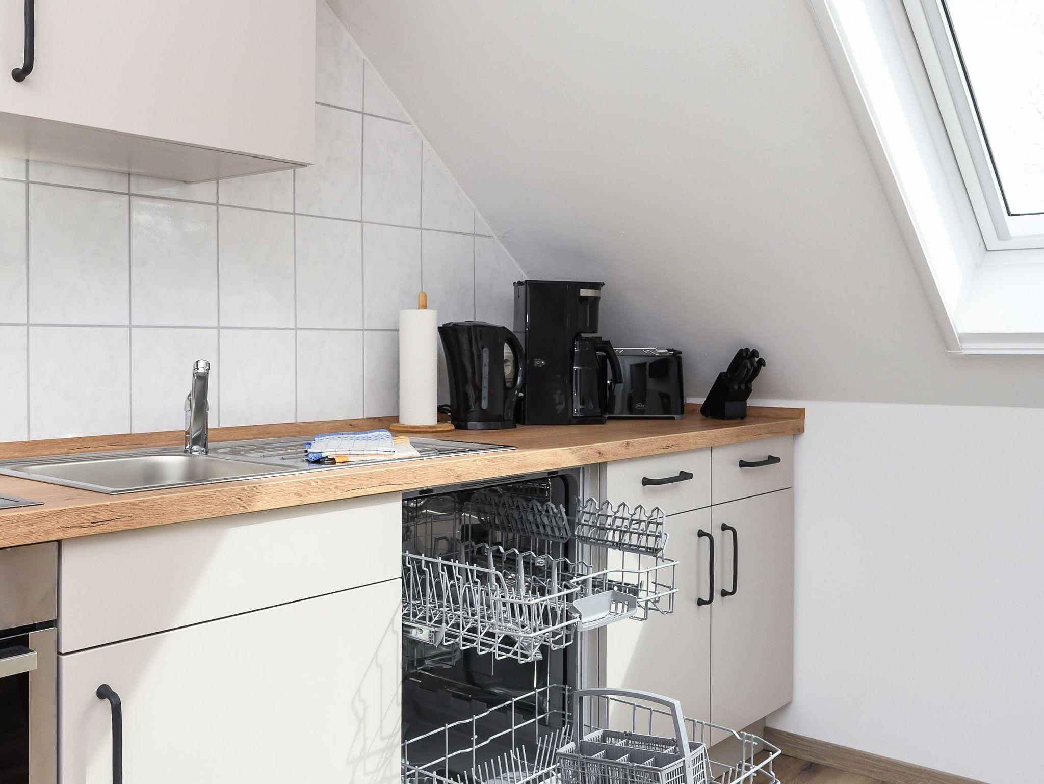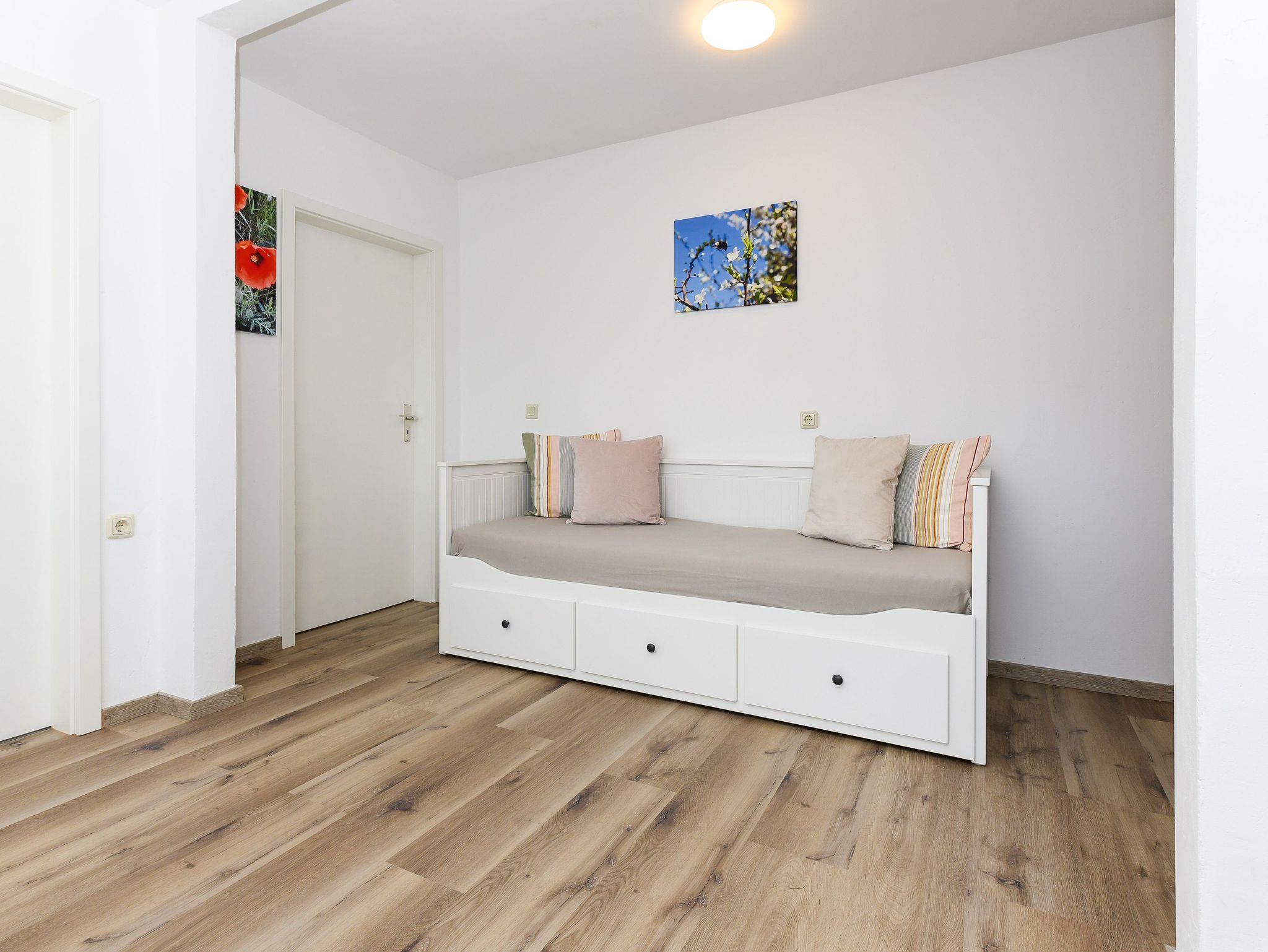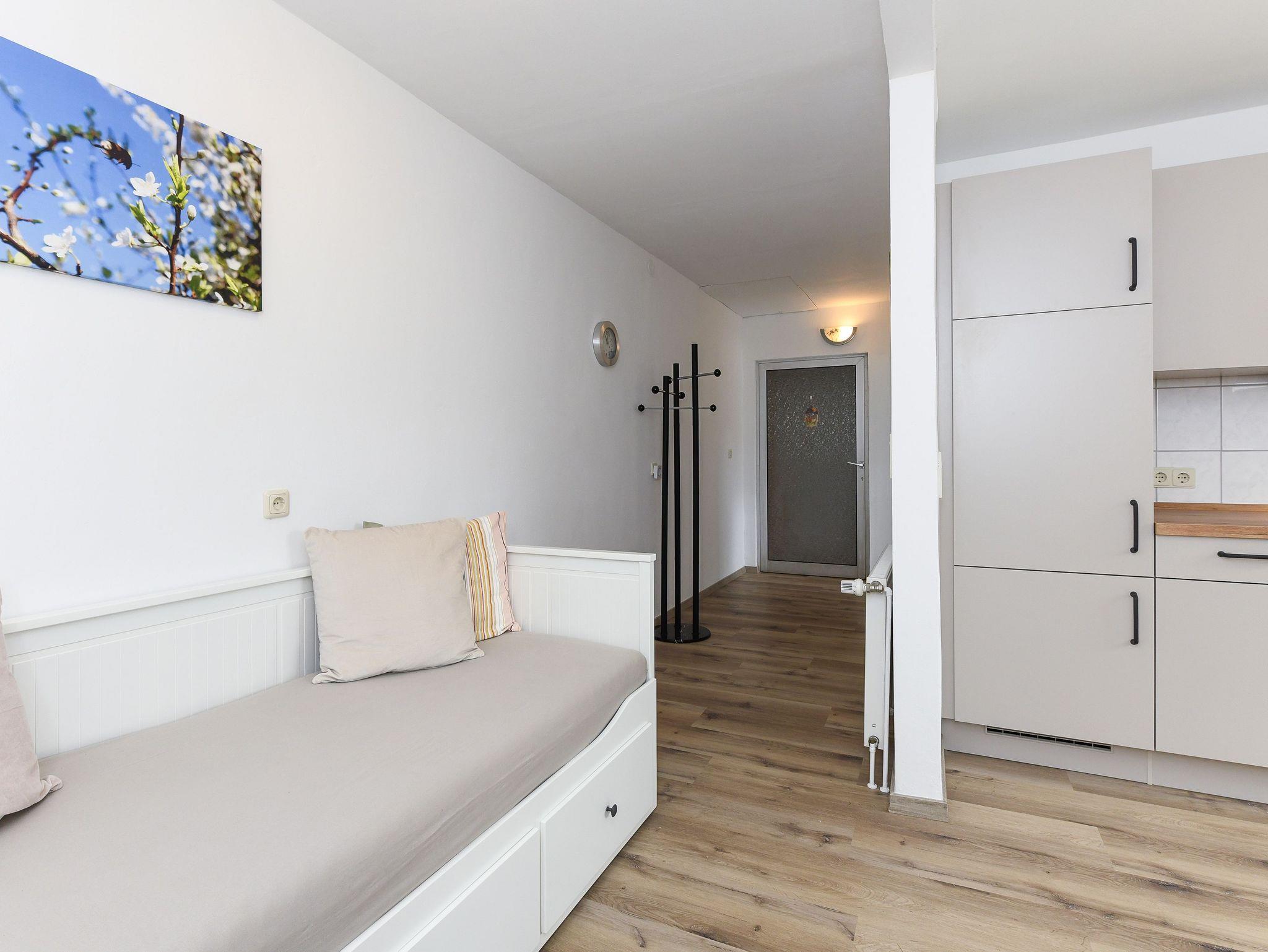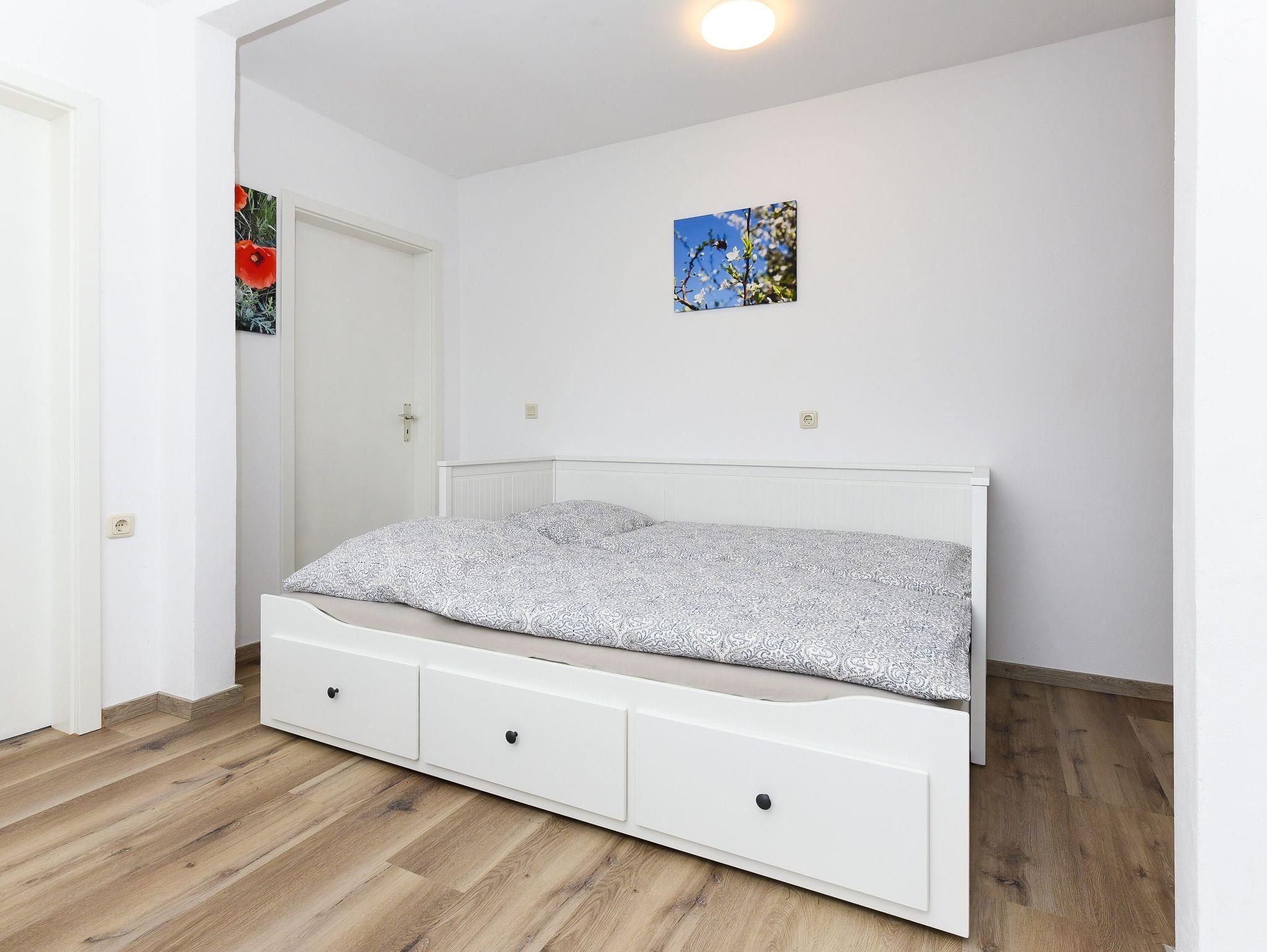 Größe ca. 55 Quadratmeter, Wohnraum mit integrierter Küche und mit Schlafmöglichkeit, Schlafzimmer, zweites, separates Schlafzimmer/Kinderzimmer, Badezimmer mit Dusche, Waschtisch und WC, Obergeschoss, optimal für 2 bis 5 Personen und zusätzlich ein Kleinkind.