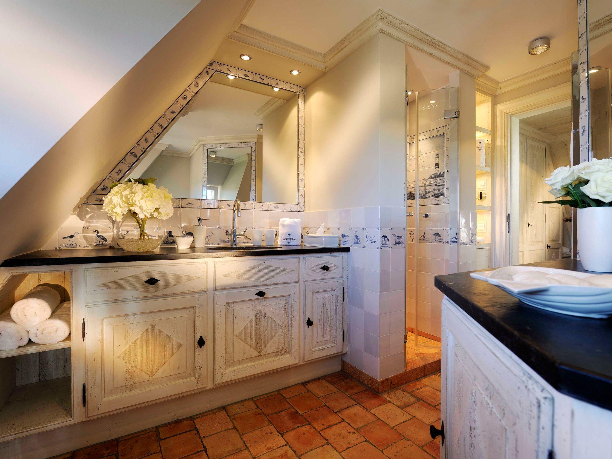 Über 145 m2 Wohnfläche erstreckt sich das Ferienhaus „SalzWasserHerz“ auf zwei Etagen und bietet im Obergeschoss zwei Schlafzimmer (Betten 2x2m) mit SAMINA Schlafsystem in weißem Nordish-Vollholz-Design, SAMINA Kissenbar, sowie zwei Badezimmer mit Ausblick und Regendusche oder Badewanne.