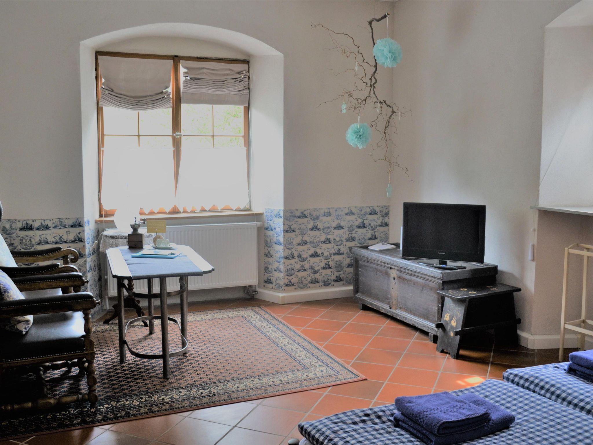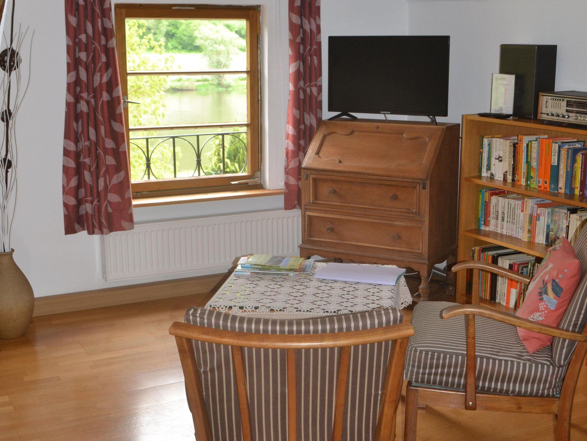 Doppelzimmer in einem denkmalgeschützten Fachwerkhaus in Flussnähe. Eigener Außensitzplatz, Parkplatz und Fahrradunterbringung.