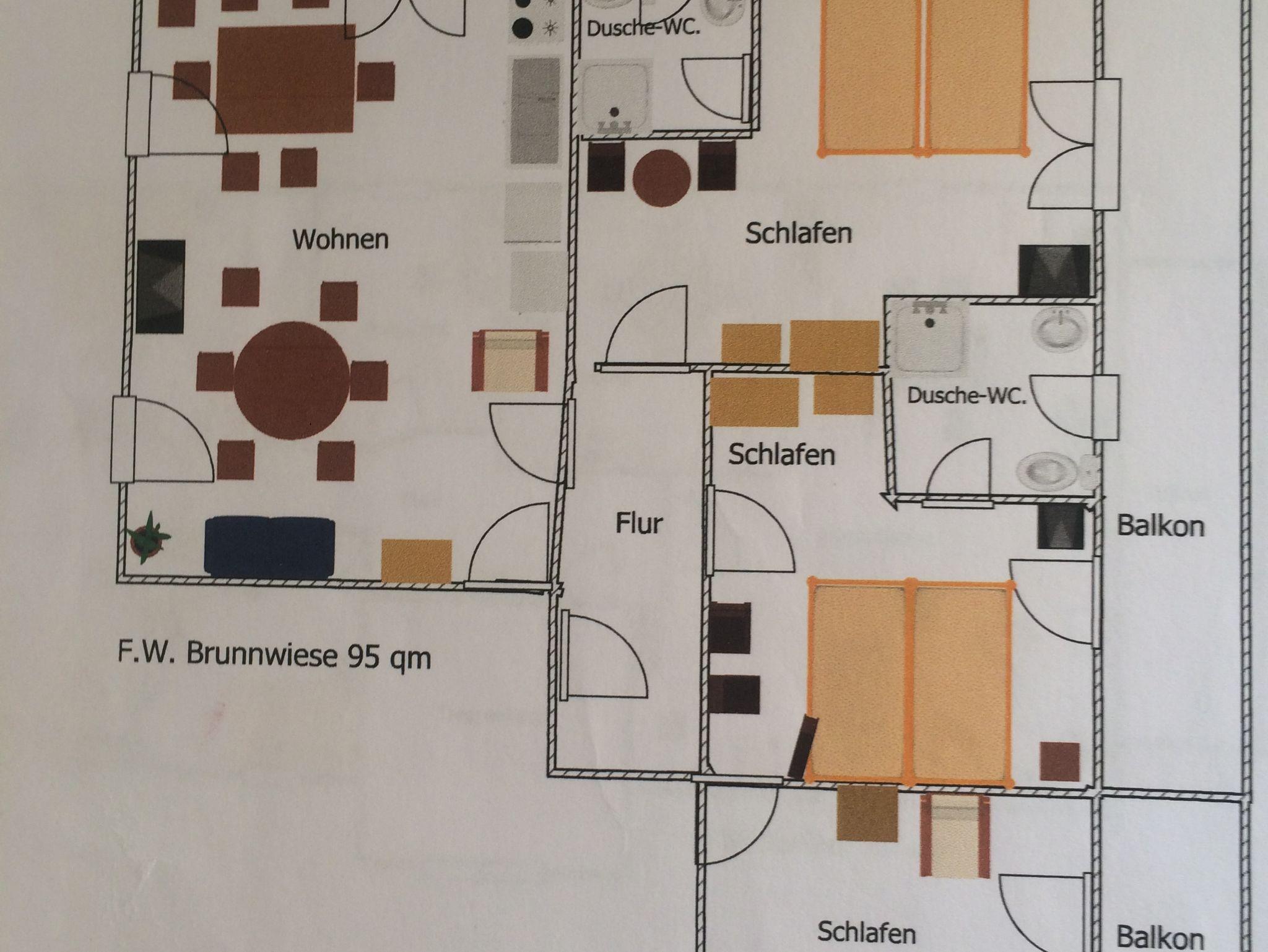 Unsere Ferienwohnung Brunnwiese befindet sich im Obergeschoss des Hauses und beträgt ca. 80qm. Die Ferienwohnung mit Balkon bietet Platz für bis zu 5 Personen. In der Wohnung gibt es 3 Schlafzimmer, 2 davon mit einem Doppelbett, eines mit einem Einzelbett. Jedes Schlafzimmer hat einen eigenen Fernseher und ein eigenes Badezimmer. Das Wohnzimmer verfügt über eine Couch, einen TV, einen großen Esstisch sowie eine Sitzgruppe. Die Küche ist voll ausgestattet u.a. mit einem Kühlschrank mit Gefrierfach, einer Mikrowelle, einem Toaster , Geschirrspüler . Im Badezimmer , Dusche, WC , Haarfön sowie ein Waschbecken. Parkplatz und Wlan stehen kostenfrei zur Verfügung. Die Wohnung ist eine Nichtraucherwohnung.