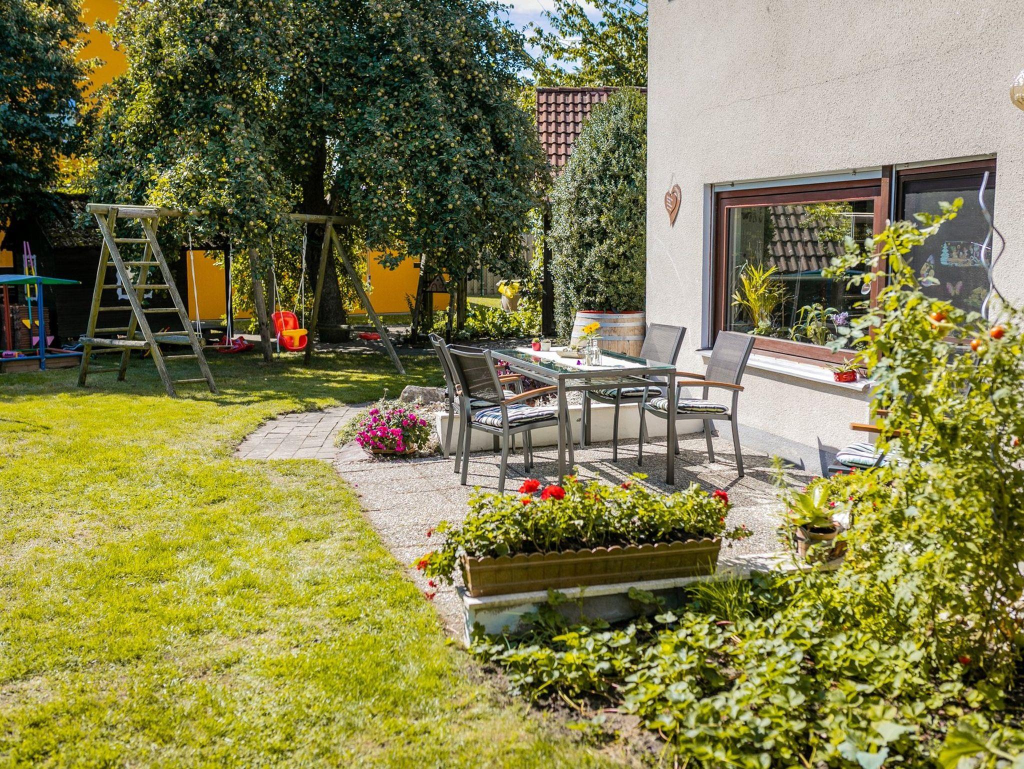 Der allein genutzte Garten hat eine Sitzgruppe und für die Kleinsten viel zu bieten: Spielhaus, Schaukel, Sandkasten, Planschbecken, Bobbycar etc.