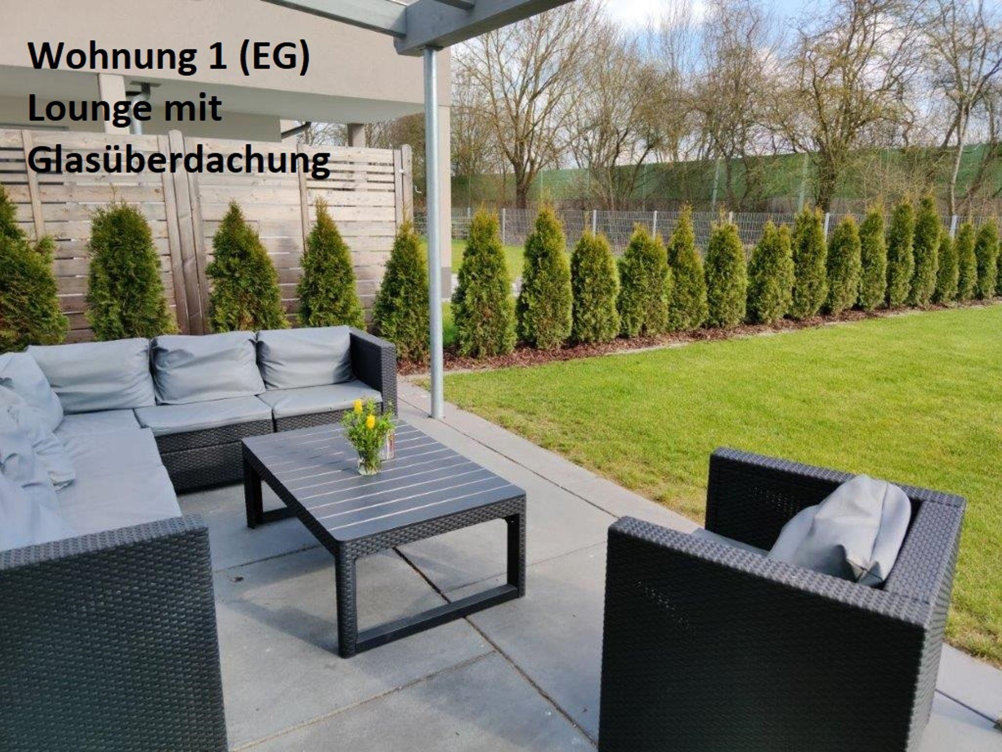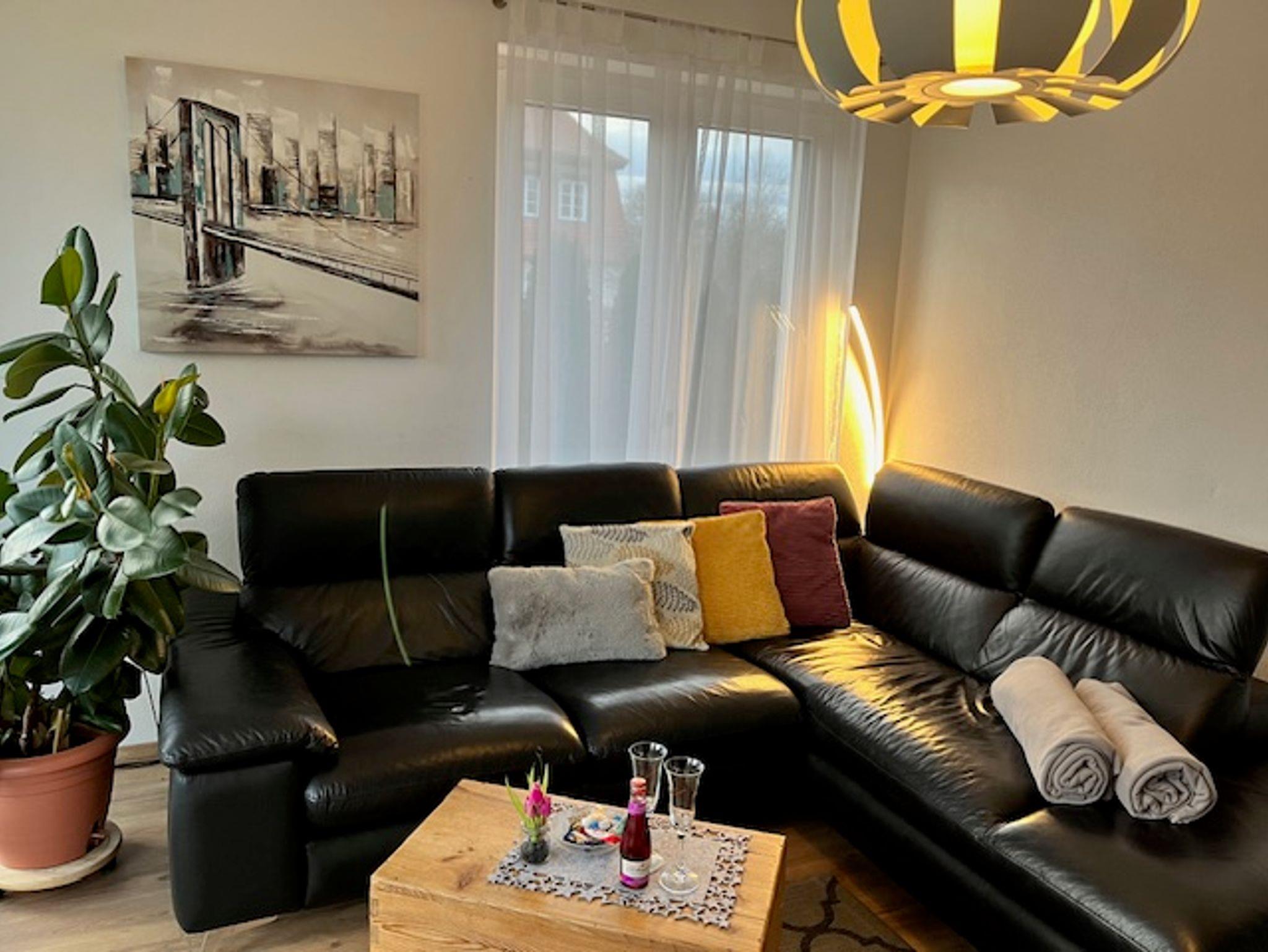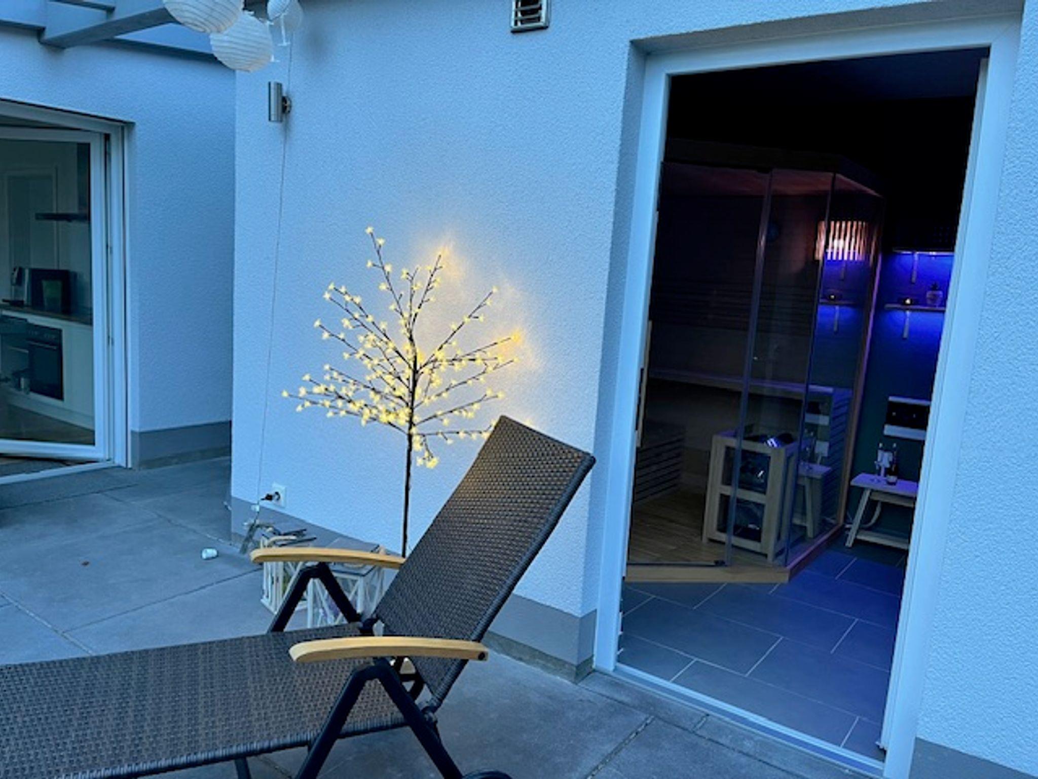 Die bedingt barrierefreie Ferienwohnung (92 m²) für 4 Personen liegt im Erdgeschoss. Sie ist geräumig und modern eingerichtet - hier fühlt man sich sofort Zuhause. Die moderne Küche ist mit einem zusätzlichen Kaffeevollautomat, Backofen, Gefrierfach, Wasserkocher, Toaster, Spülmaschine und Geschirrtüchern ausgestattet. An der Kücheninsel kann auf den Barhockern ein Snack eingenommen werden. Der große Holztisch strahlt neben zahlreichen Großpflanzen eine Gemütlichkeit aus. Im Wohnzimmer laden eine bequeme, große Eckcouch mit ausfahrbarer Fußstütze sowie einem großen SAT-TV zum Verweilen ein. Die Ferienwohnung hat 2 gemütliche Schlafzimmer mit Doppelbett (incl. Bettwäsche). Beide Schlafzimmer haben einen Fernsehr. Neben einem großen Bad (incl. Handtüchern) mit ebenerdiger Dusche, WC und Fön ist noch ein separates WC vorhanden. Im Außenbereich befindet sich in einem Nebenraum einer kleiner Spa-Bereich mit einer Sauna (Abrechnung nach Stromzähler). Der große Garten ist für Sie ganz alleine. Unter einer überdachten Essgruppe können Sie bequem essen und in der Loungeecke mit Glasüberdachung den Urlaubstag ausklingen lassen.
