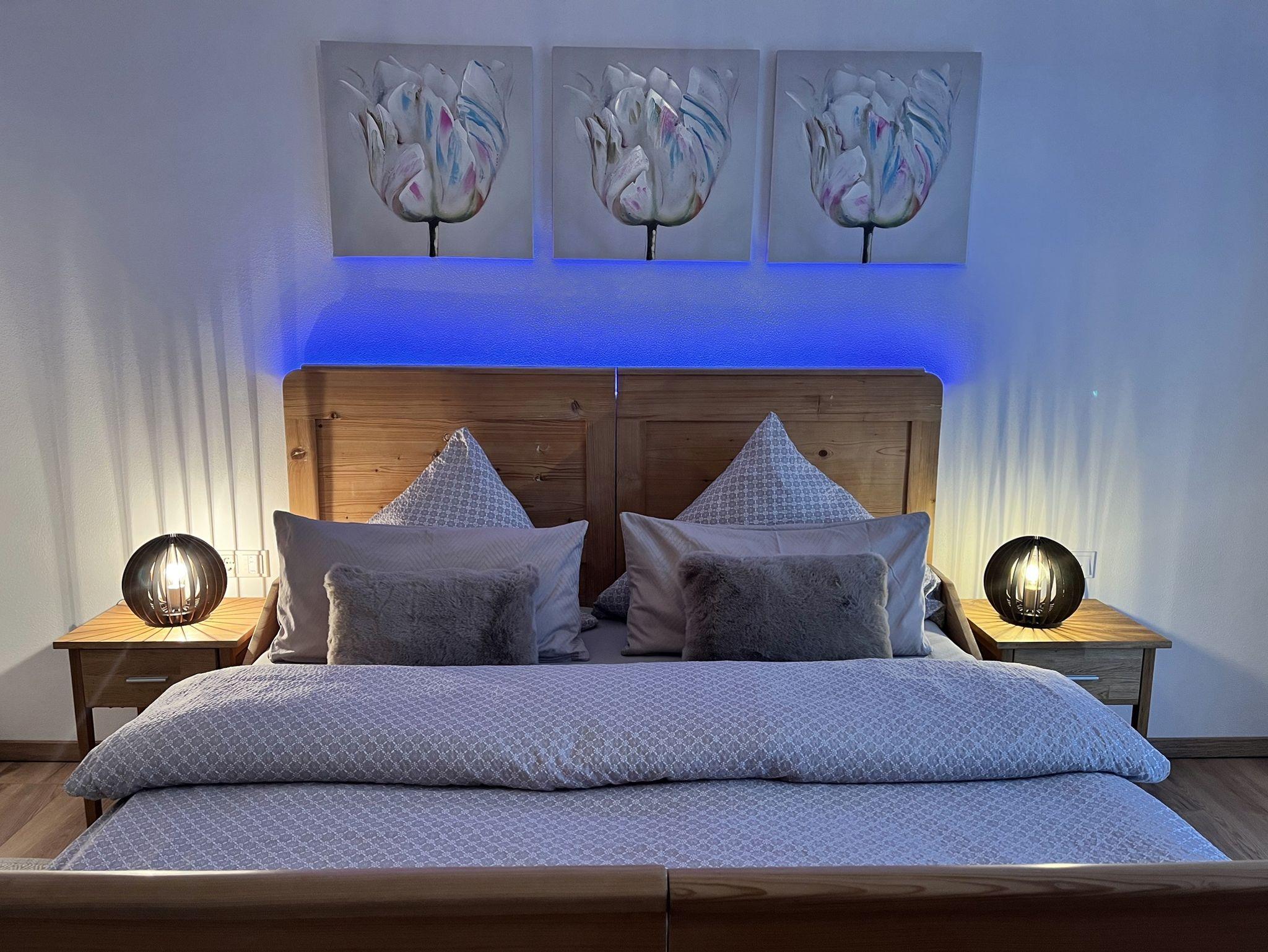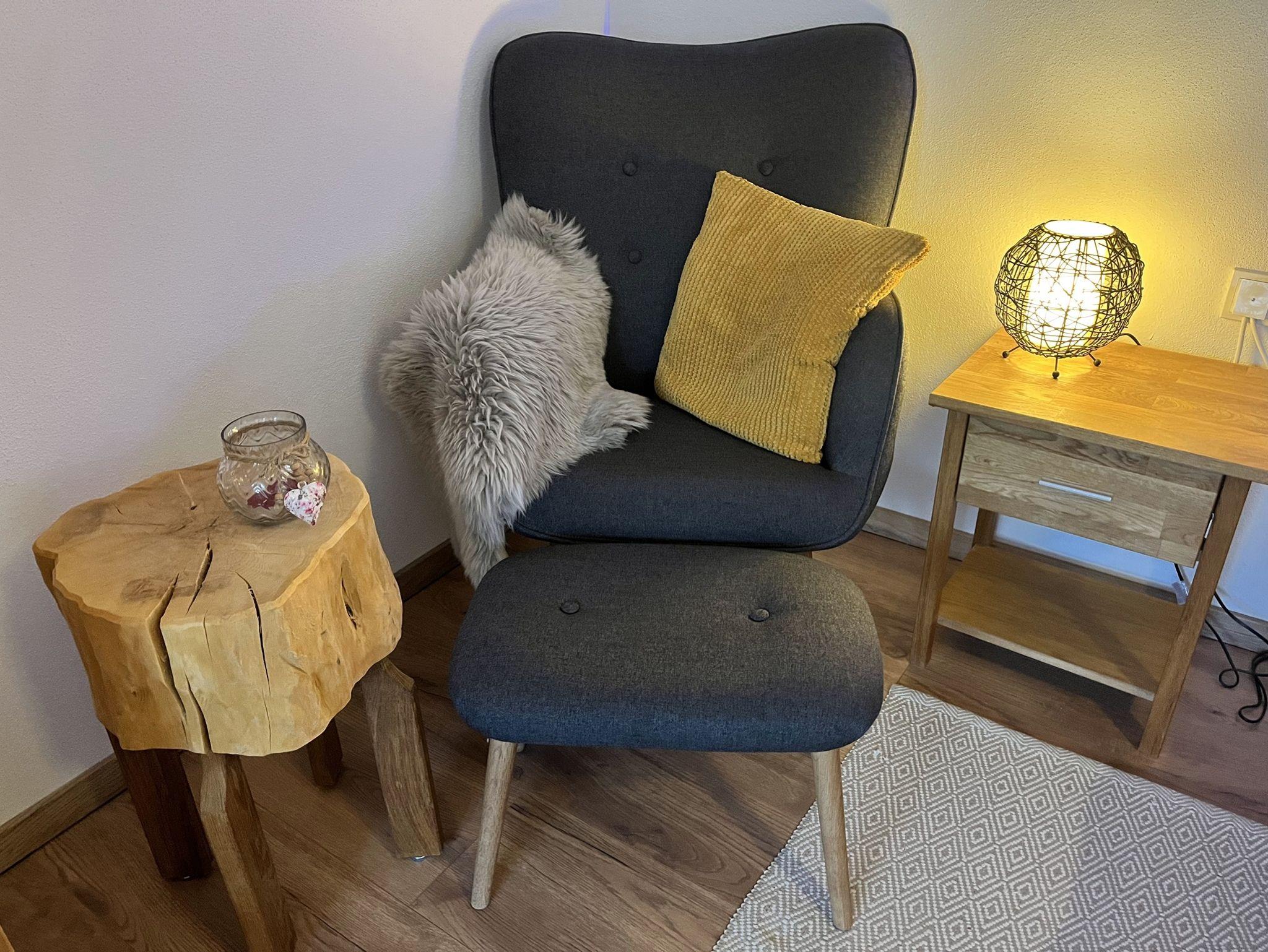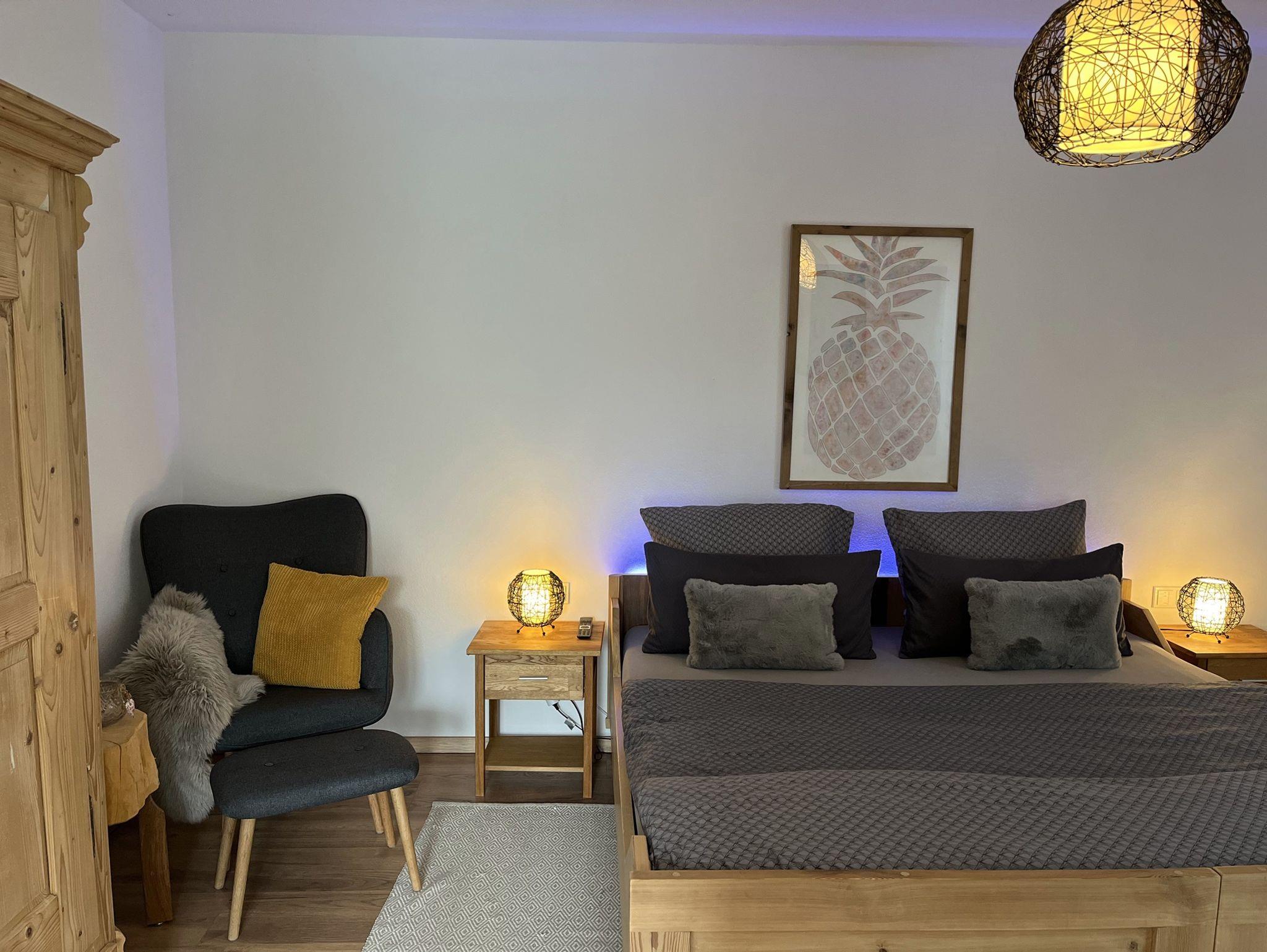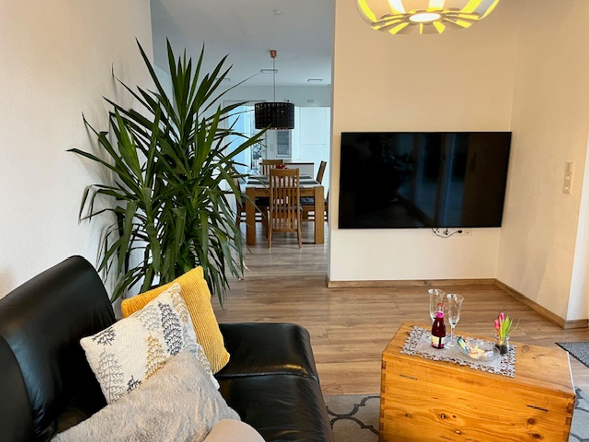 Die bedingt barrierefreie Ferienwohnung (92 m²) für 4 Personen liegt im Erdgeschoss. Sie ist geräumig und modern eingerichtet - hier fühlt man sich sofort Zuhause. Die moderne Küche ist mit einem zusätzlichen Kaffeevollautomat, Backofen, Gefrierfach, Wasserkocher, Toaster, Spülmaschine und Geschirrtüchern ausgestattet. An der Kücheninsel kann auf den Barhockern ein Snack eingenommen werden. Der große Holztisch strahlt neben zahlreichen Großpflanzen eine Gemütlichkeit aus. Im Wohnzimmer laden eine bequeme, große Eckcouch mit ausfahrbarer Fußstütze sowie einem großen SAT-TV zum Verweilen ein. Die Ferienwohnung hat 2 gemütliche Schlafzimmer mit Doppelbett (incl. Bettwäsche). Beide Schlafzimmer haben einen Fernsehr. Neben einem großen Bad (incl. Handtüchern) mit ebenerdiger Dusche, WC und Fön ist noch ein separates WC vorhanden. Im Außenbereich befindet sich in einem Nebenraum einer kleiner Spa-Bereich mit einer Sauna (Abrechnung nach Stromzähler). Der große Garten ist für Sie ganz alleine. Unter einer überdachten Essgruppe können Sie bequem essen und in der Loungeecke mit Glasüberdachung den Urlaubstag ausklingen lassen.