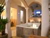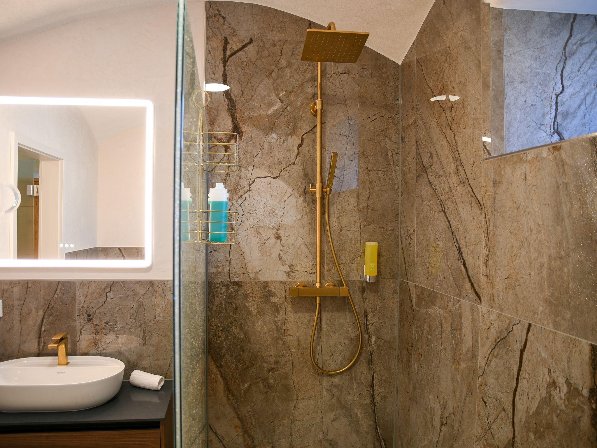 Im Badezimmer finden Sie eine große Regenschauerdusche mit goldenen Armaturen,