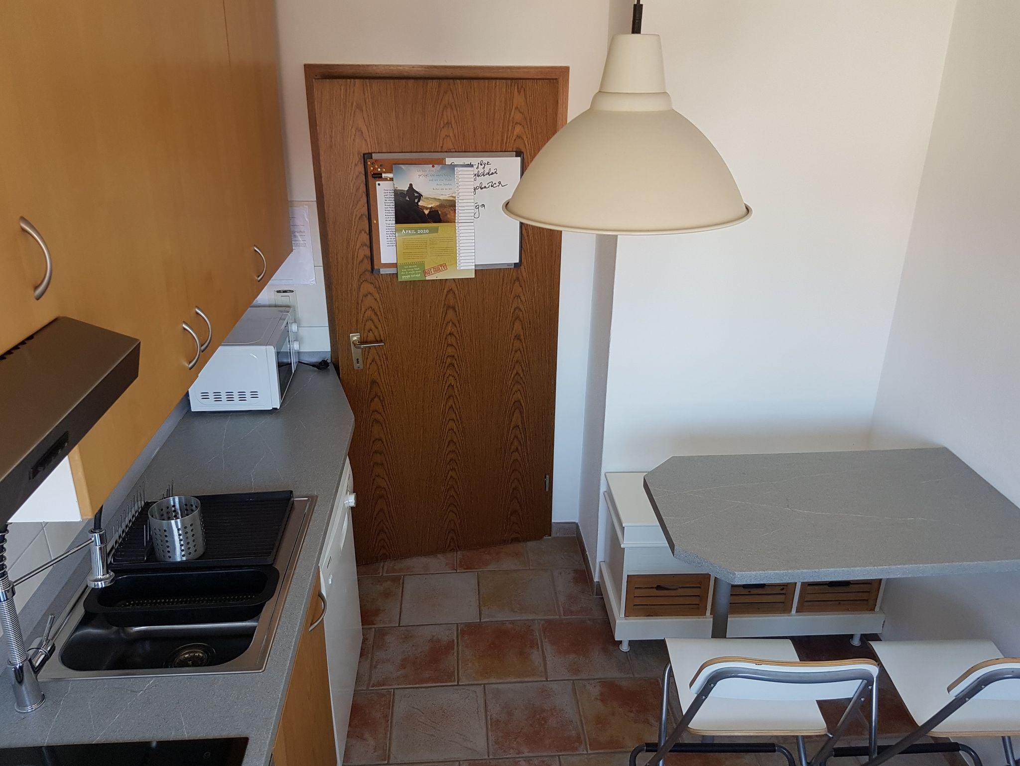 Bad mit Wanne, WC und Waschmaschine; vollausgestattete Küche mit Küchenzeile, Elektroherd mit Backofen, Spülmaschine, Kühlschrank mit kleinem Gefrierfach, Kaffeemaschine, Mikrowelle, Wasserkocher und Toaster. Schlafzimmer mit Doppelbett, Kinderzimmer mit einem Bett und einem Kinderbett, 2. Schlafzimmer mit 2 Betten, Wohnzimmer mit Polsterecke, Essecke, Sat-TV, großer überdachter Balkon mit Blick auf die Grünanlagen des benachbarten „Witwenschlösschens“. Die Fußböden sind gefliest oder mit Laminat ausgelegt.