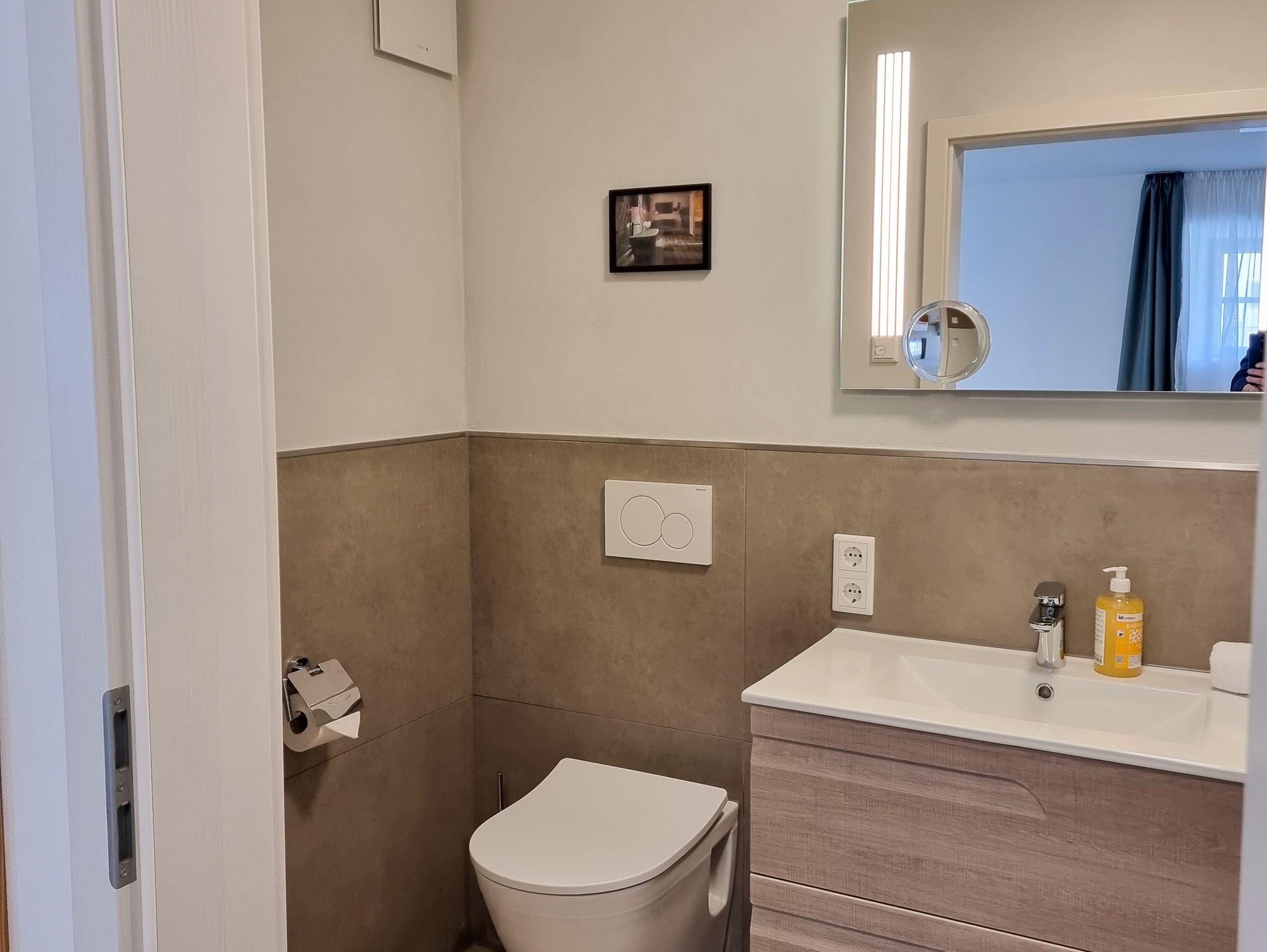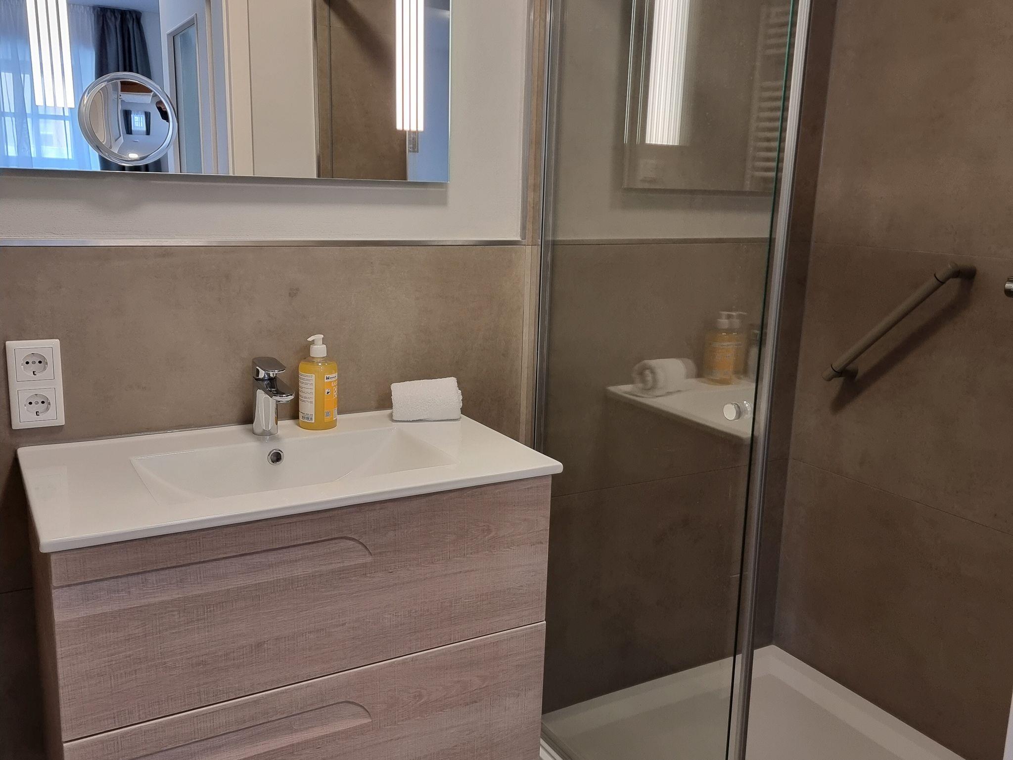 Duschbad im modernen Design mit Badmöbelanlage und Spiegel sowie Kosmetikspiegel, WC, Haartrockner und Handtuchheizkörper