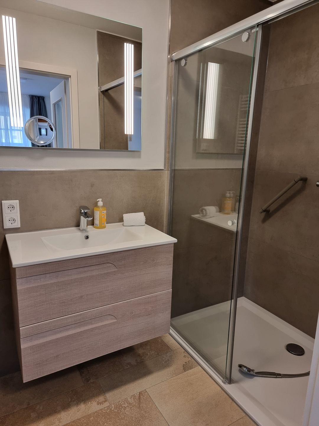 Duschbad im modernen Design mit Badmöbelanlage und Spiegel sowie Kosmetikspiegel, WC, Haartrockner und Handtuchheizkörper