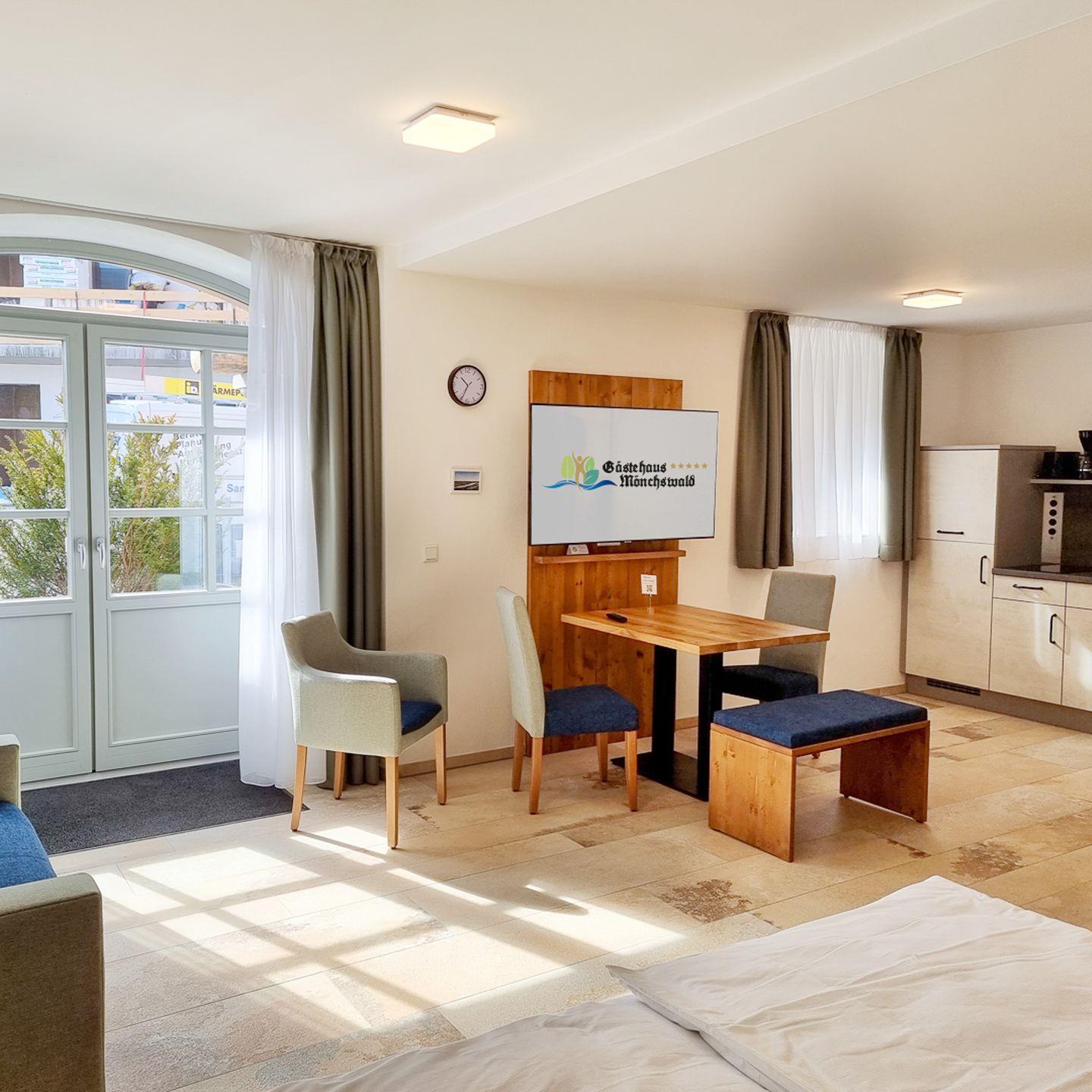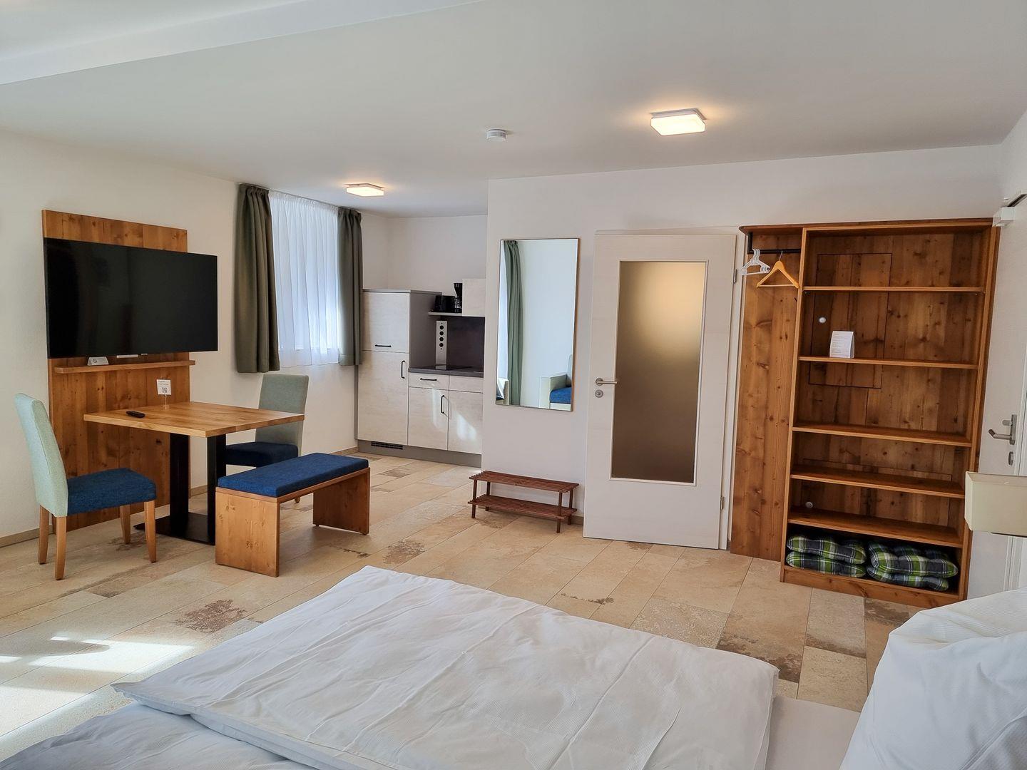 Das elegant mit Vollholzmöbel eingerichtete 45 qm Einzimmerapartment bietet Ihnen alles was Sie für einen Urlaub benötigen. Die Wohn- Schlafkombination lässt keine Wünschen offen. Blickfang des Raumes ist das elegante Kingsize Bett mit hochwertigen Bettwaren, auch das innen liegende Duschbad ist in einem modernen Design und mit Waschtisch, WC, Föhn und Handtuchheizkörpern ausgestattet.