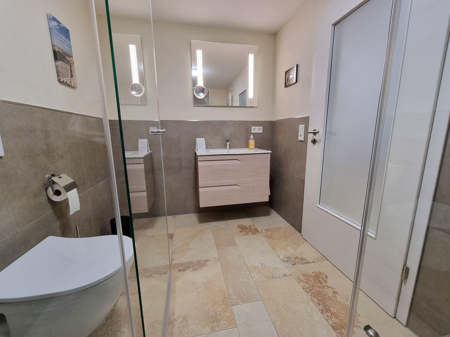 Duschbad im modernen Design mit Badmöbelanlage und Spiegel sowie Kosmetikspiegel, WC, Haartrockner und Handtuchheizkörper