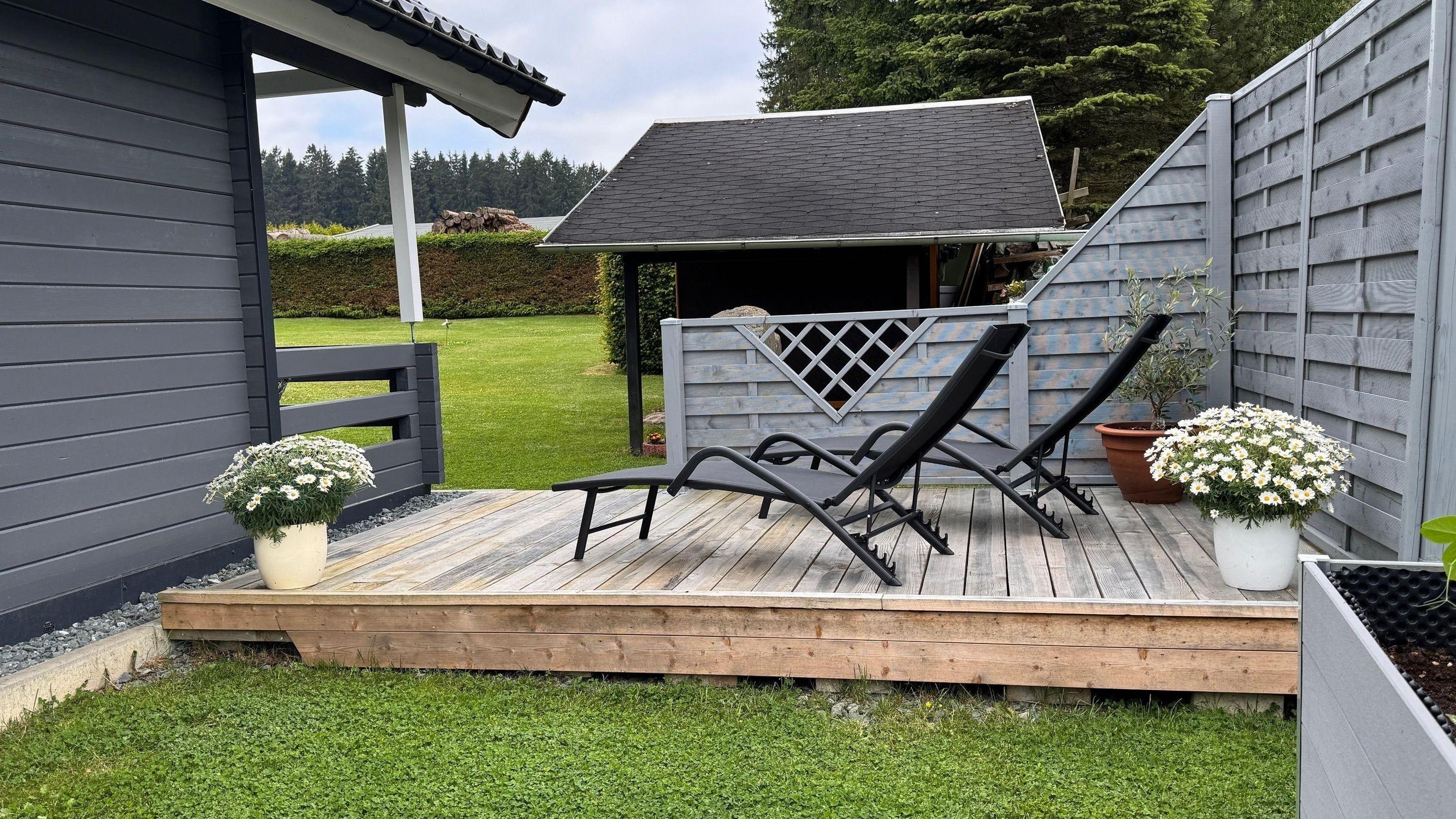 2023 NEUE ZUSÄTZLICHE TERRASSE seitlich am Haus mit 2 Liegestühlen ausgestattet.