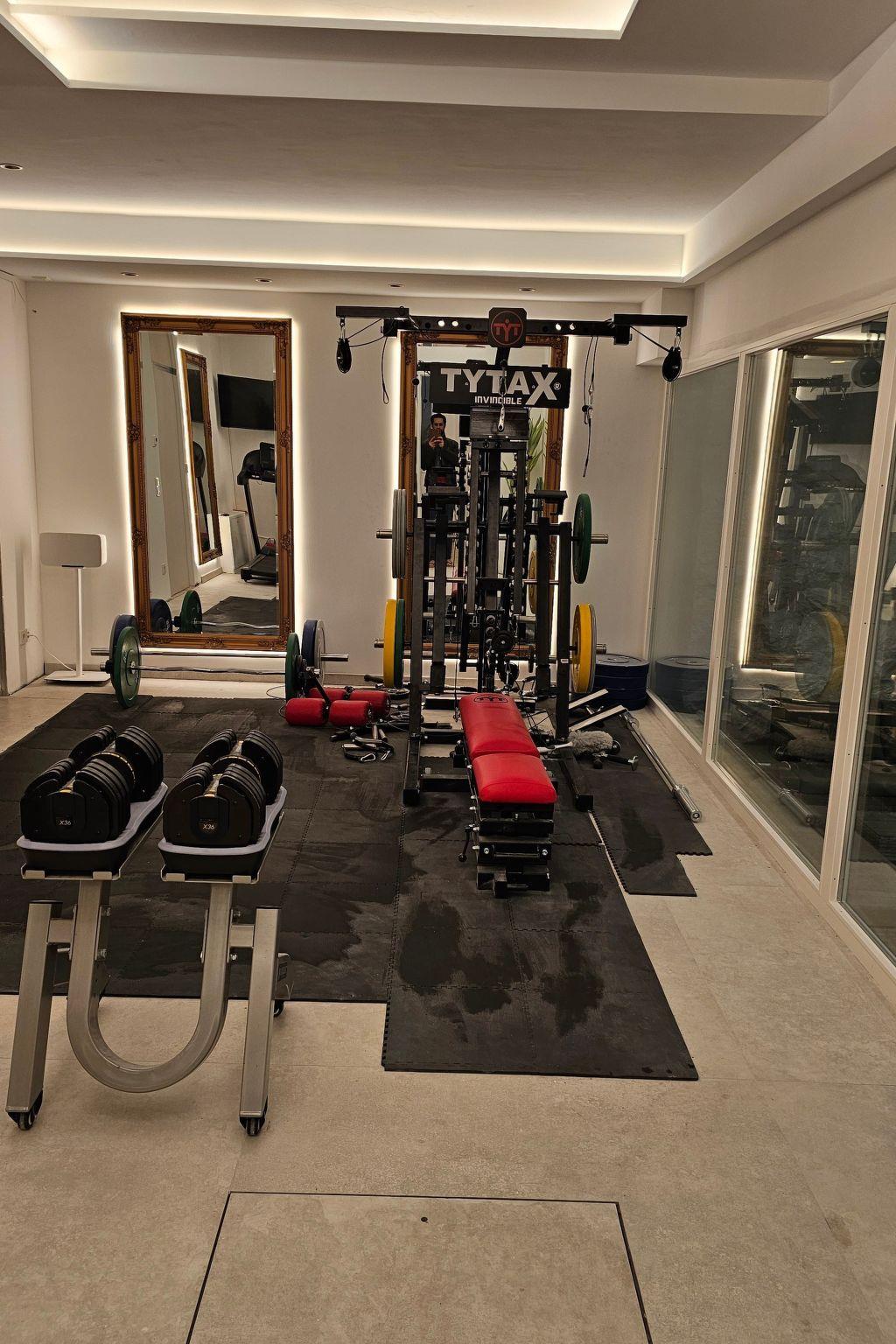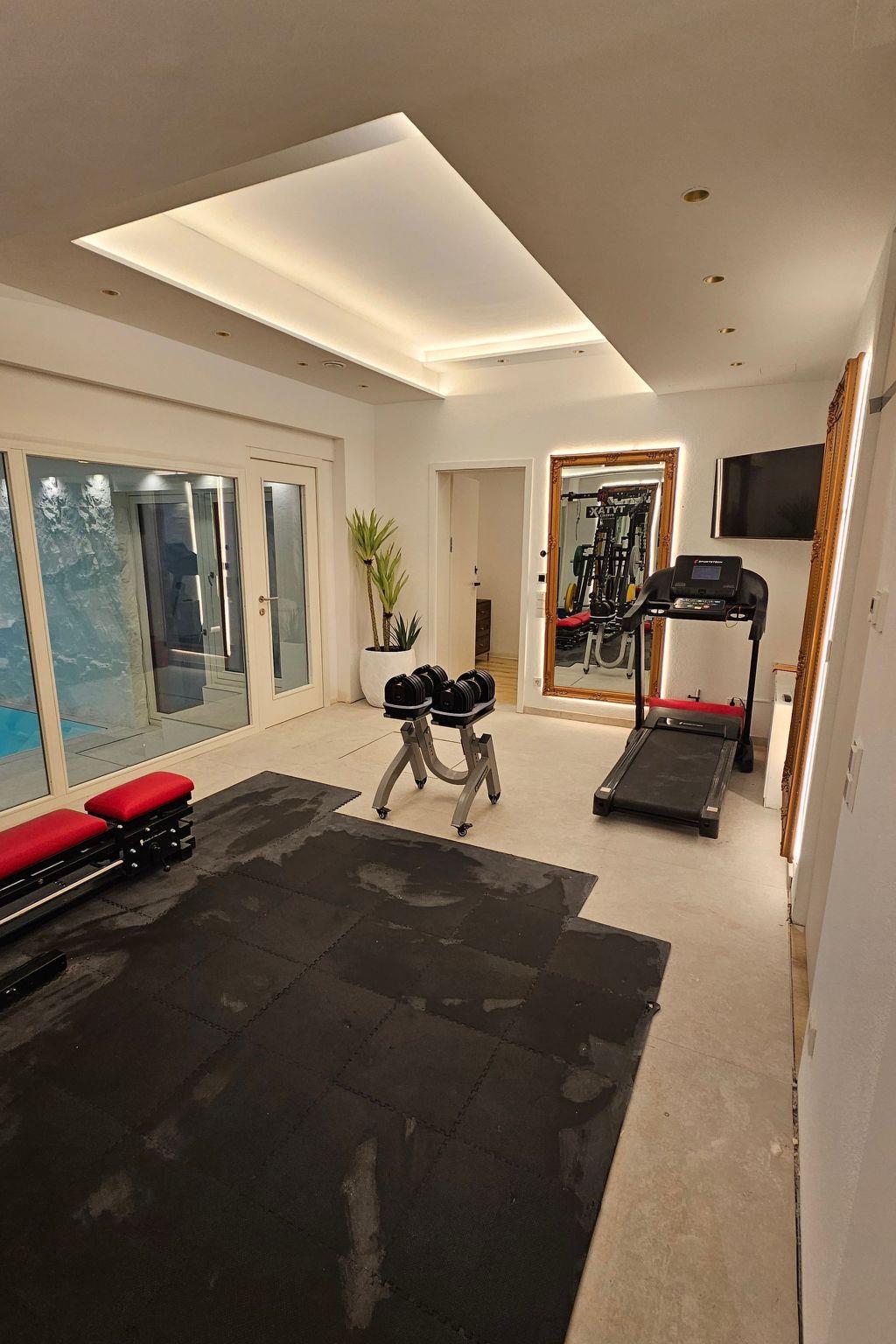 The flat has private access to a gym, a swimming pool and a second bathroom. Access to the private gym + heated swimming pool + second bathroom is only possible if an additional booking is made for 150 euros/day. If the area is not booked, the door is locked.