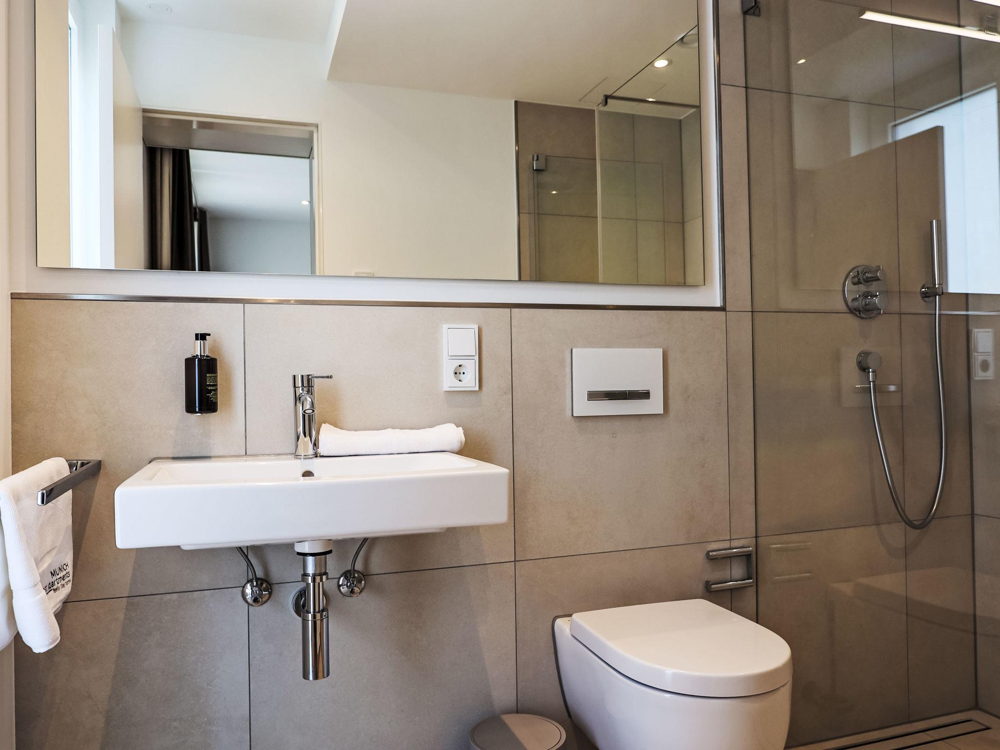 "Munich Finest Apartments Studio 11", 1-room apartment 28 m2 on 6th floor. Modern furnishings: 1 room with 1 double bed and TV. Exit to the balcony. Kitchenette (2 ceramic glass hob hotplates, toaster, kettle, microwave, electric coffee machine). Shower/WC. Electric heating. Balcony. Facilities: safe, children's high chair, baby cot, hair dryer. Internet (WiFi, free). Please note: non-smokers only. Smoke alarm. 244932