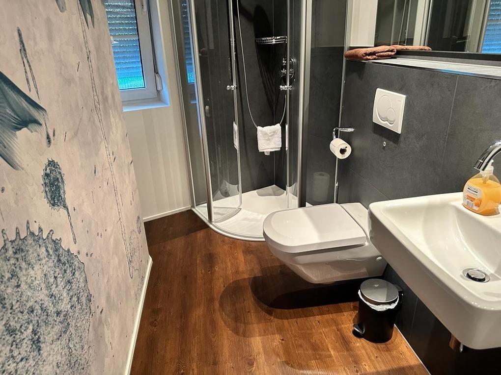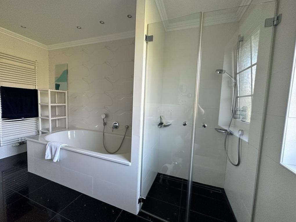 Vor den Garagen, von denen die rechte inkl. eines Abstellraumes (zum Garten hin) mitvermietet ist, befinden sich zwei bis drei PKW Stellplätze. In der rechen Garage ist ein Starkstromanschluß (ohne Wallbox) für das Aufladen eines Elektroautos (wird über den Gesamtstromverbrauch des Aufenthalts abgerechnet).