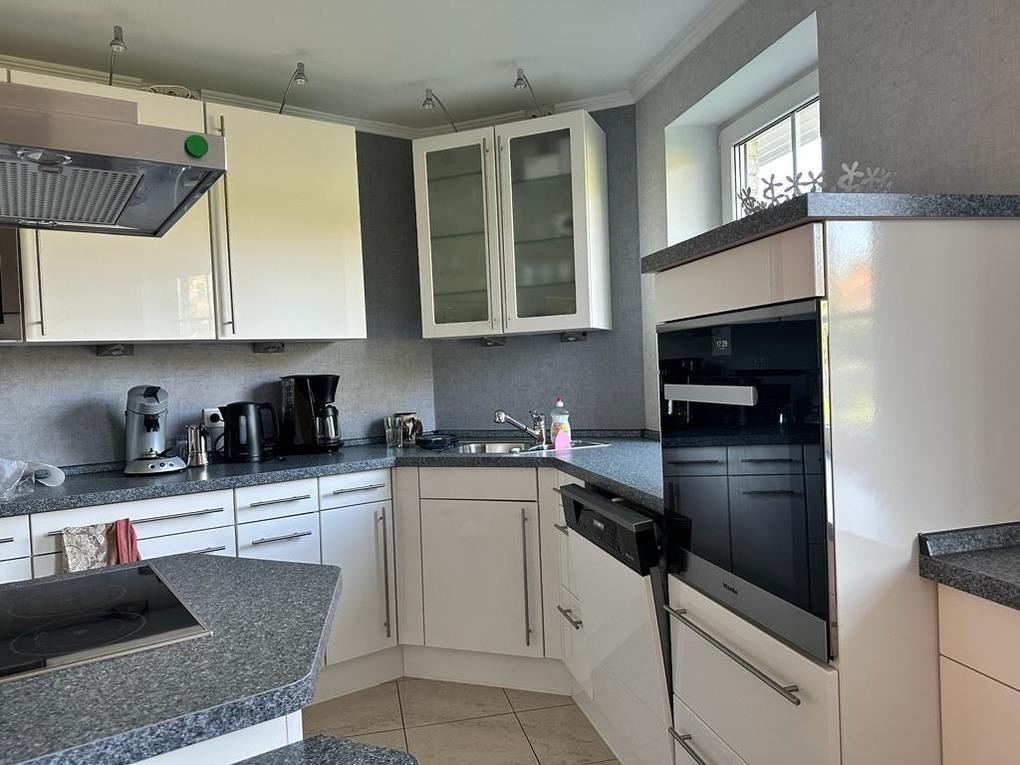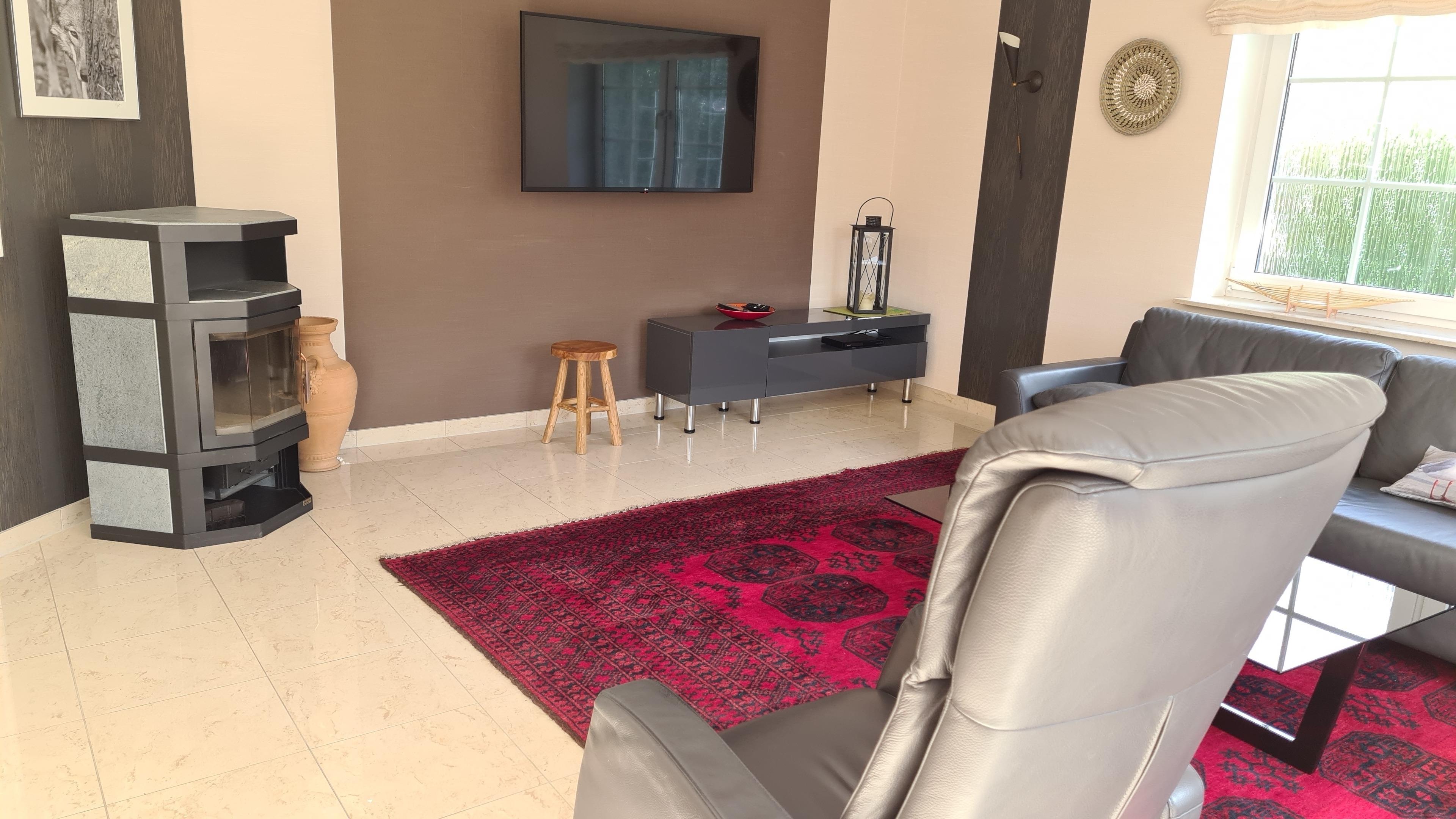 Das gesamt Haus ist gefliest oder mit Holzfußböden und Fußbodenheizung ausgestattet. Die Fenster haben meist automatische Rolläden. Die drei mit Doppelbetten versehenen Schafzimmer sind zum Garten hin gelegen und haben wie das Wohnzimmer bodentiefe Fenster. Aus zweien der Zimmer wie aus dem Wohnzimmer gelangen Sie direkt auf die große Südwestterrasse, die an einen kleinen mit Fischen besetzten Teich grenzt, in den ein kleiner Zufluß plätschert. Kühle Abende können Sie gemütlich vom Kaminofen im Wohnzimmer genießen. Das Haus verfügt über zwei Badezimmer. Eines mit Bidet, Badewanne und Dusche und ein weiteres mit Dusche. In der mit Siemens und Miele Geräten ausgestatteten Küche mit Induktionskochfeld, Backofen mit Dampffunktion, Mikrowelle, Geschirrspüler, Kühl- und Gefrierschrank können Sie leckere Speisen und Getränke zubereiten, für Hobbyköche ideal. Für Kaffee sind eine Filterkaffeemaschine und eine Senseo Maschine vorhanden. Im Wohnzimmer und in zwei Schlafzimmern befinden sich Flachbildfernseher, im Wohnzimmer mit DVD-CD Player und Smart TV. Das Haus verfügt über kostenloses Internet mit WLAN.