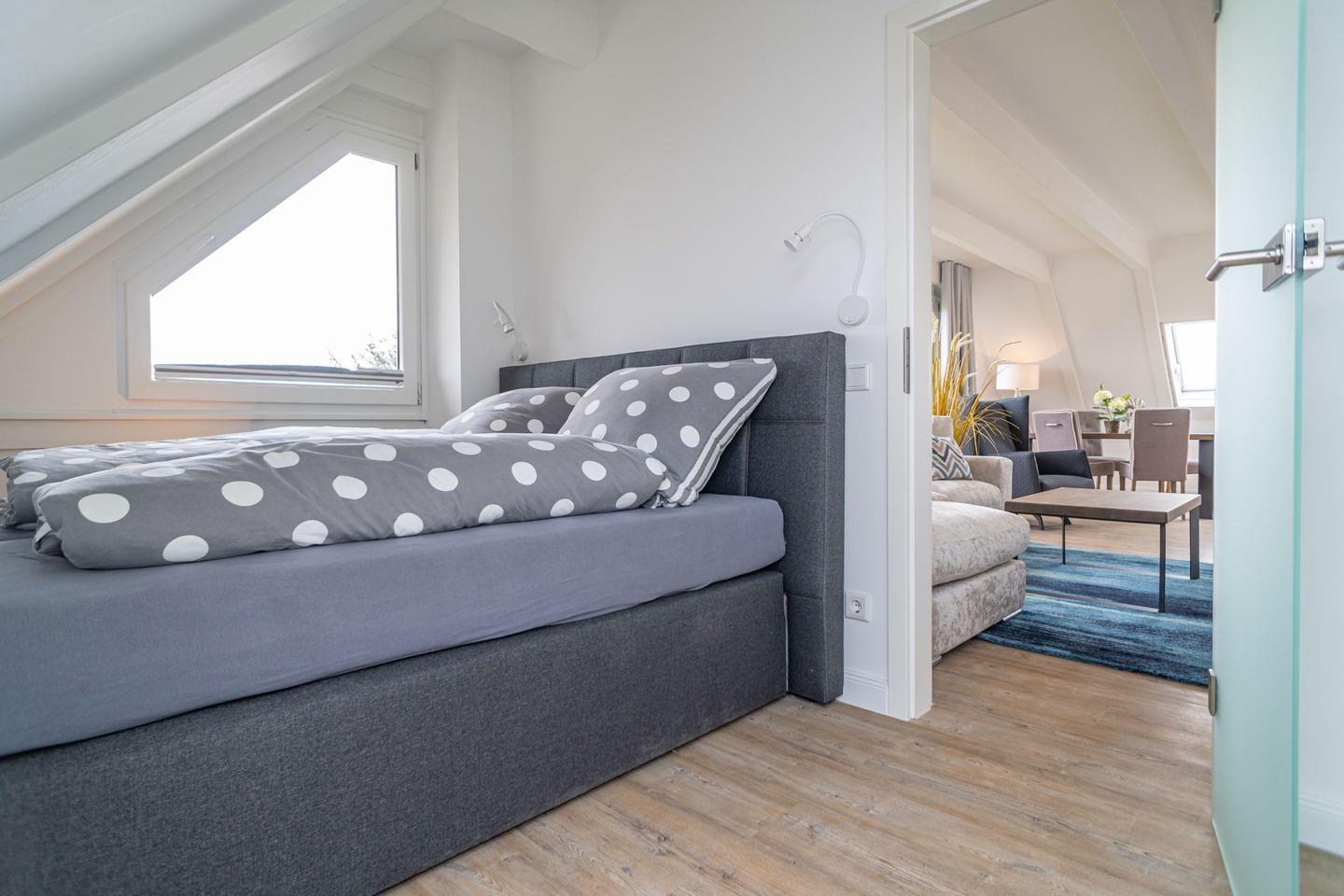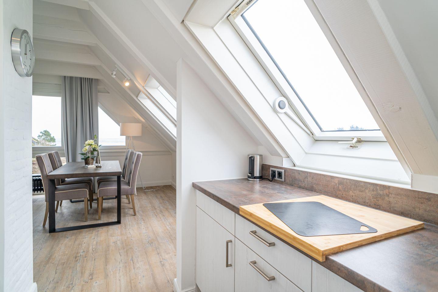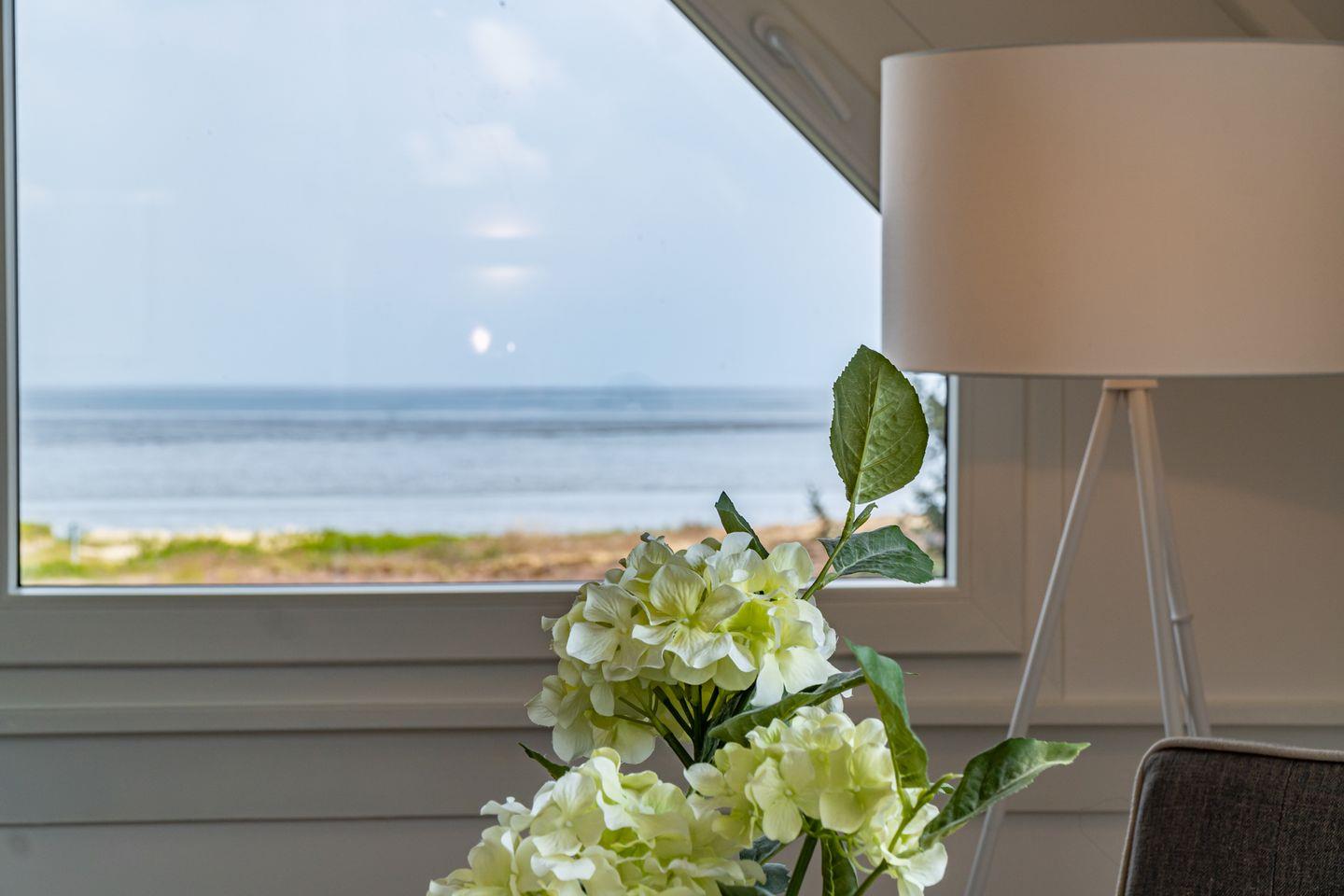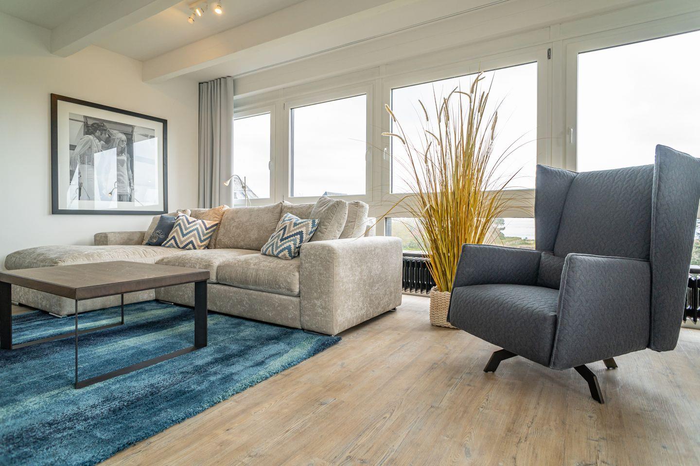 Im offen gestalteten Wohnbereich sorgen moderne Laminatböden, gemütliches Sofa, Sessel, Esstisch und Kommode für eine einladende Atmosphäre. Die großflächigen Fenster bieten einen fantastischen Ausblick auf die Nordsee und lassen viel Tageslicht herein. Besonders hervorzuheben ist der Sichtschutz an allen Fenstern, der Privatsphäre auch bei bester Aussicht gewährleistet.