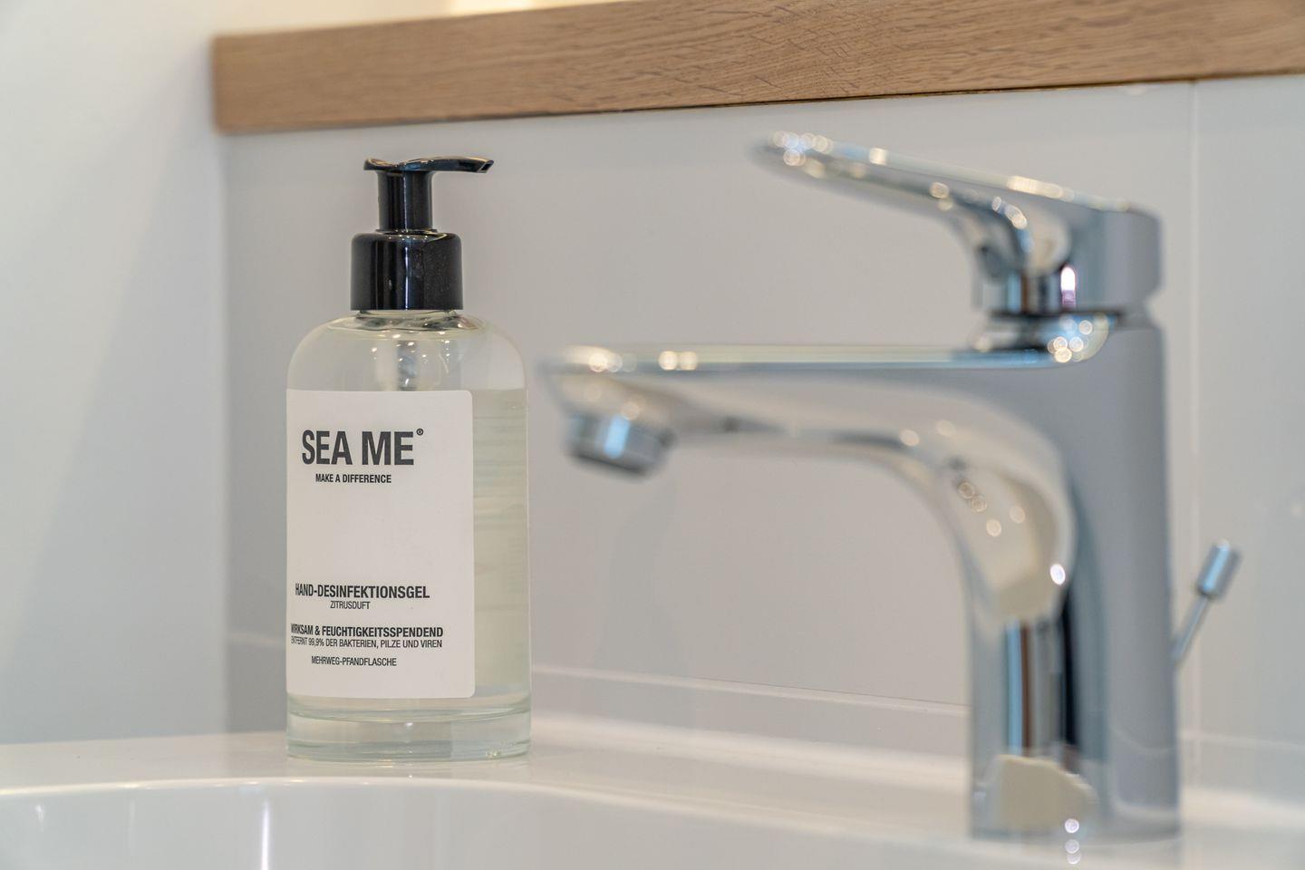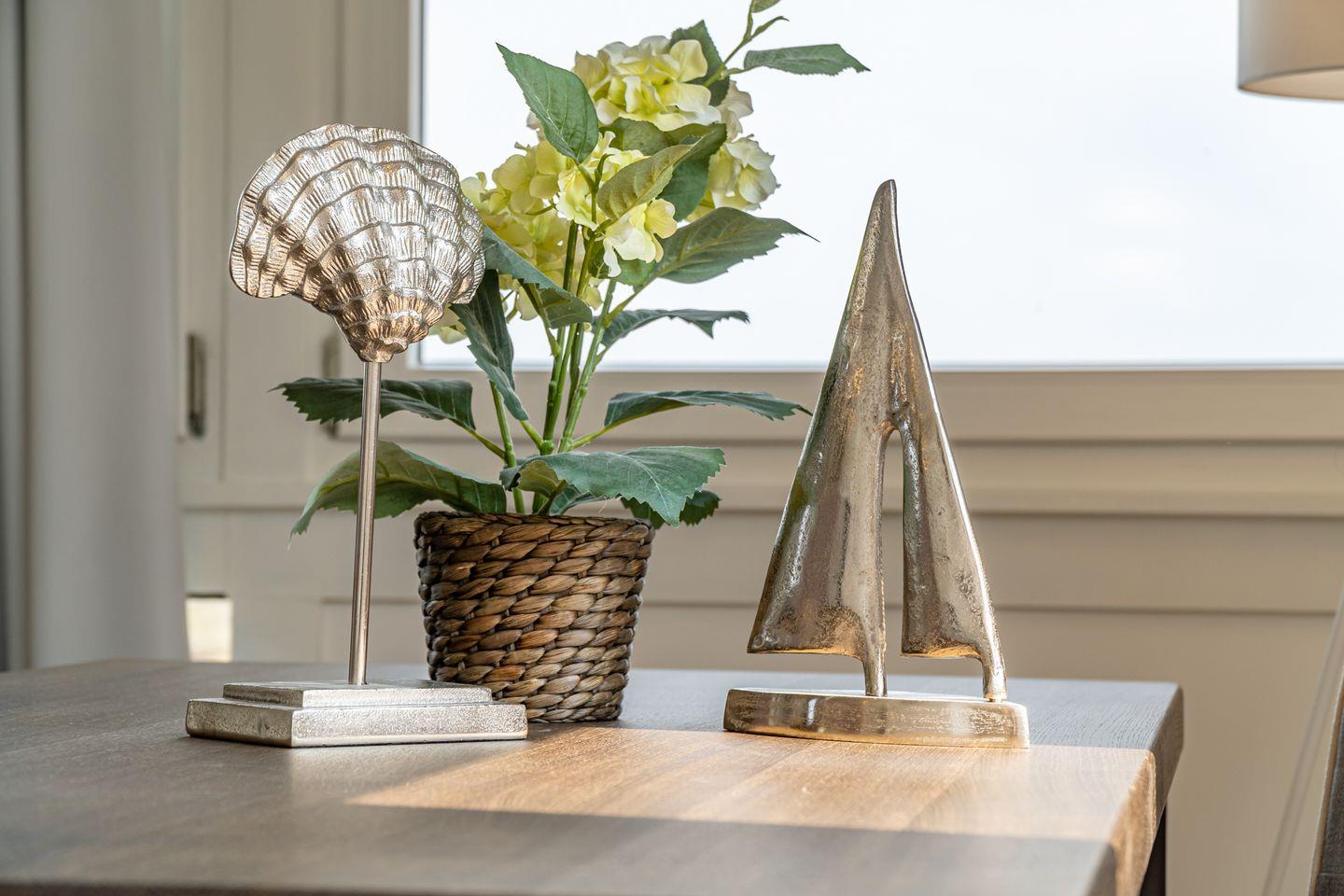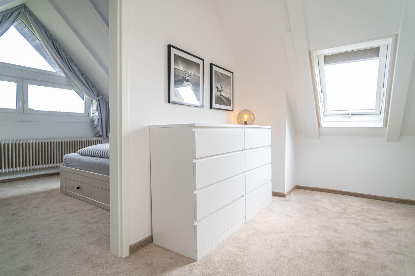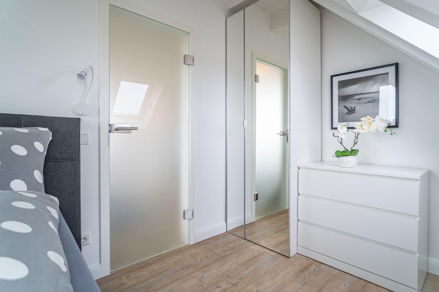 Im offen gestalteten Wohnbereich sorgen moderne Laminatböden, gemütliches Sofa, Sessel, Esstisch und Kommode für eine einladende Atmosphäre. Die großflächigen Fenster bieten einen fantastischen Ausblick auf die Nordsee und lassen viel Tageslicht herein. Besonders hervorzuheben ist der Sichtschutz an allen Fenstern, der Privatsphäre auch bei bester Aussicht gewährleistet.