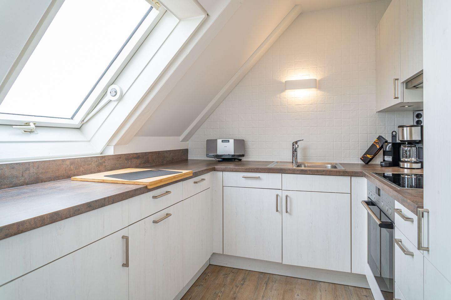 Die offene Küche ist mit zeitgemäßen Geräten wie Ceranherd, Elektro-Backofen, Kühlschrank mit Gefrierfach, Spülmaschine, Wasserkocher, Toaster, Kaffeemaschine und Nespresso-Espressomaschine bestens ausgestattet. Geschirr, Besteck und diverse Küchenutensilien sind selbstverständlich vorhanden, sodass der Zubereitung abwechslungsreicher Mahlzeiten nichts im Wege steht.