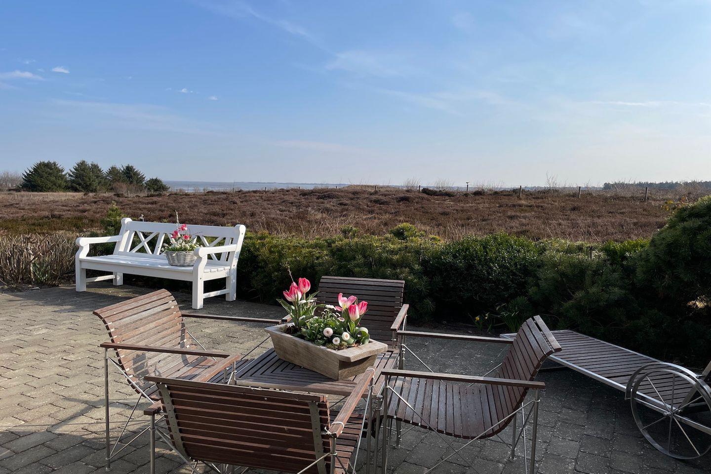 großzügige Terrasse mit Gartenmöbeln. Ein Strandkorb rundet die Terrasse ab.