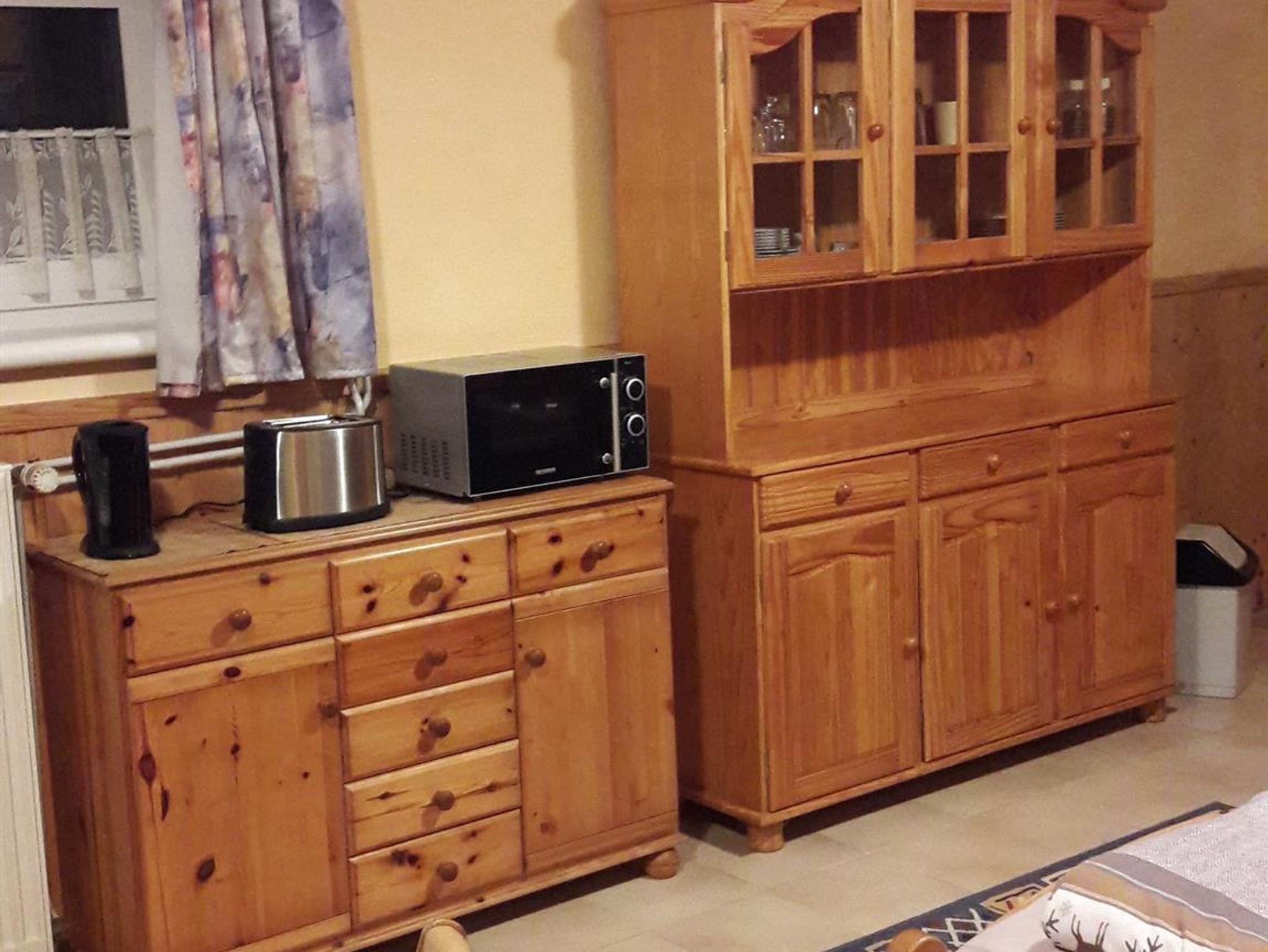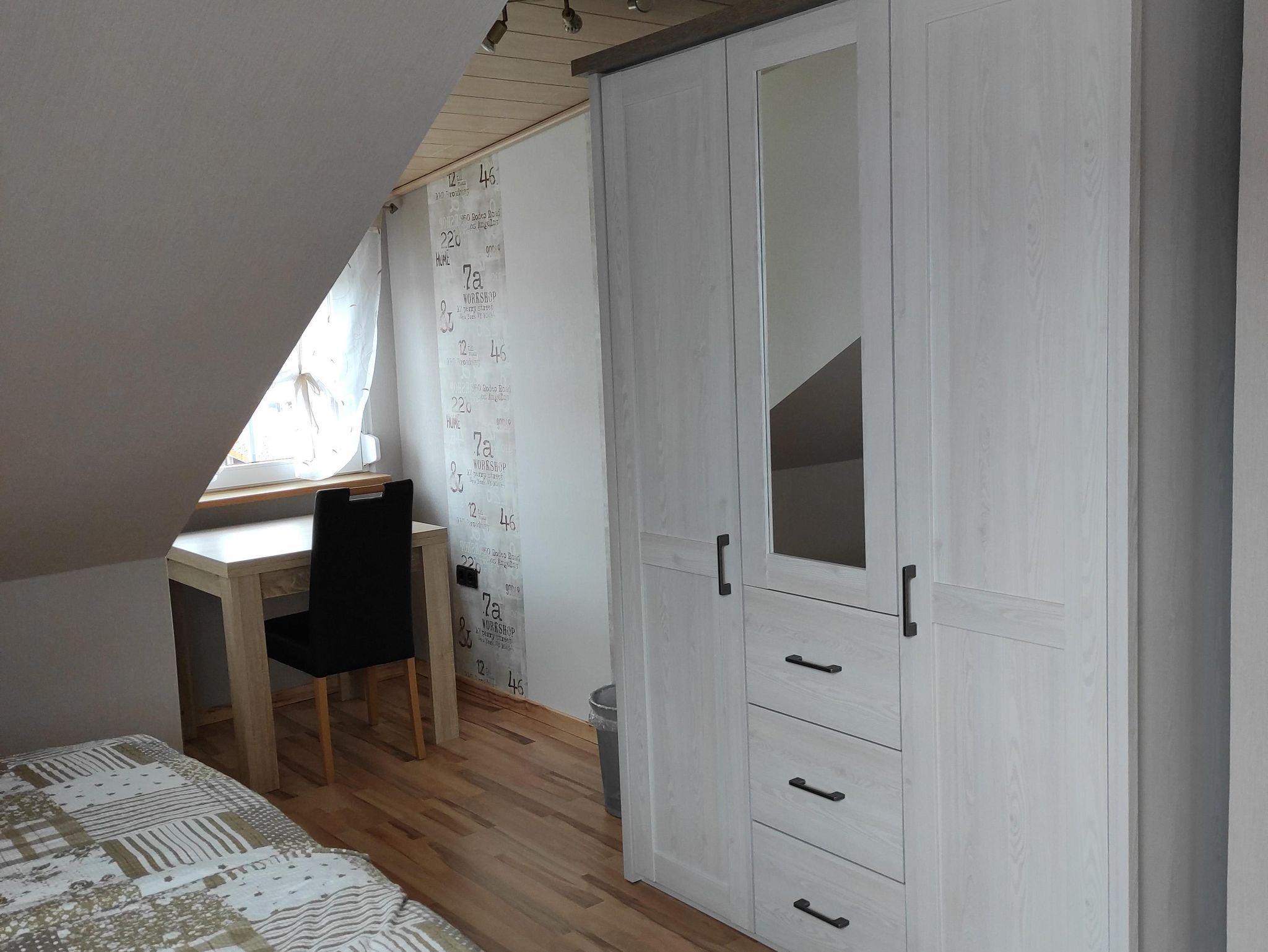Das Zimmer ist mit einem Doppelbett, Nachttischen, Kleiderschrank, Waschbecken, Esstisch, 4 Stühlen, Geschirr, TV, Mikrowelle, Toaster, Kaffeemaschine u. Wasserkocher ausgestattet, Kühlschrank auf dem Flur.