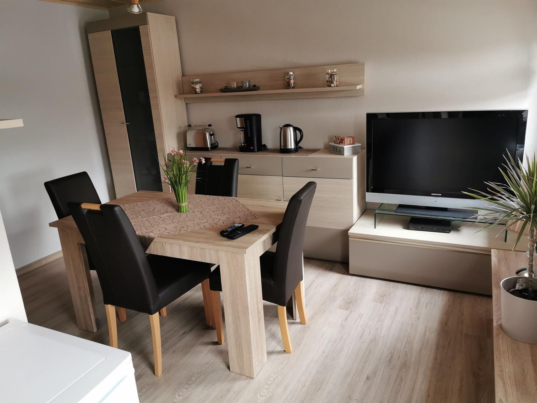 Der Aufenthaltsraum mit Esstisch, 4 Stühlen, TV, Kühlschrank, Kaffeemaschine, Wasserkocher, Mikrowelle u. Toaster befindet sich nebenan.
