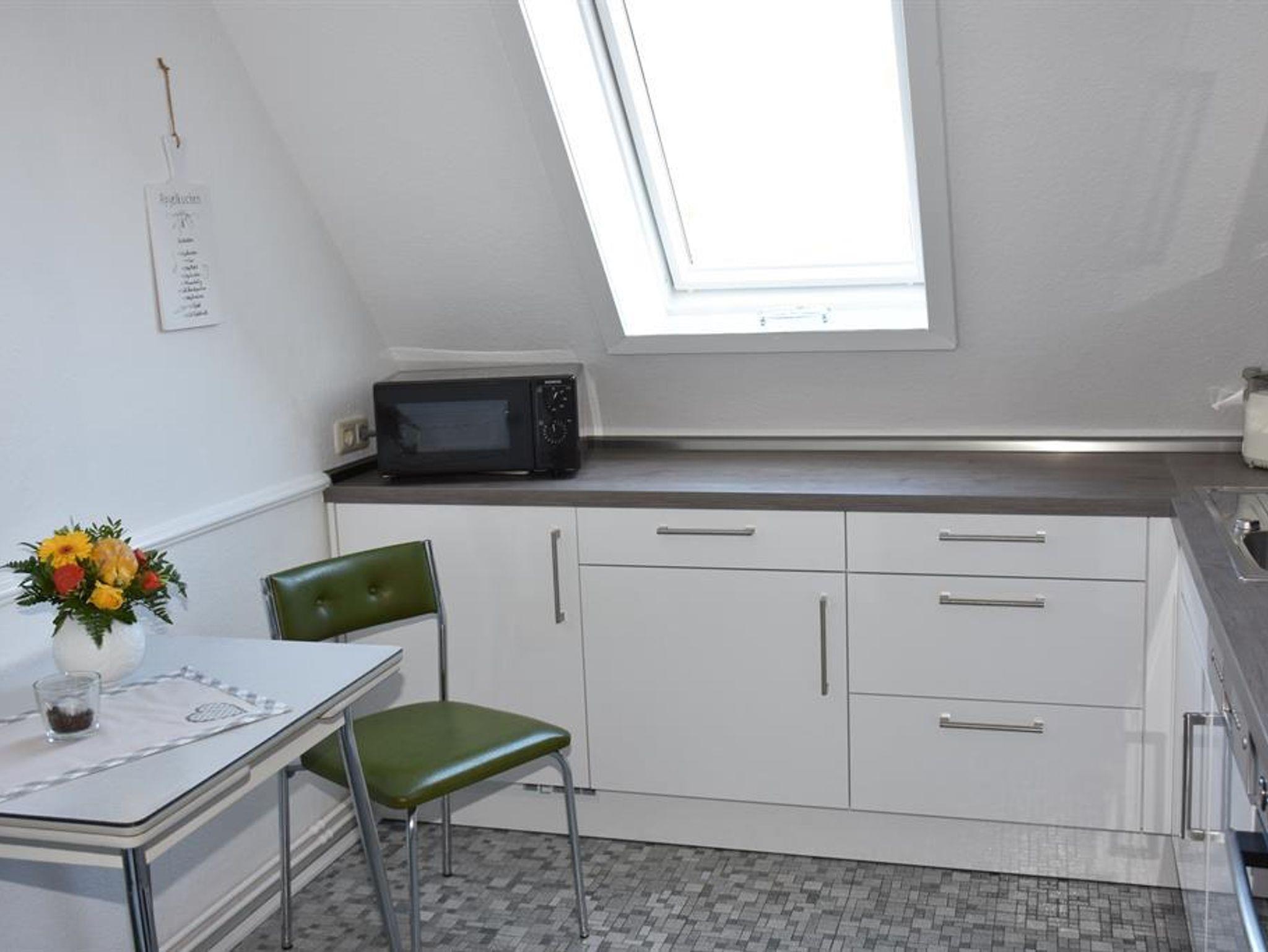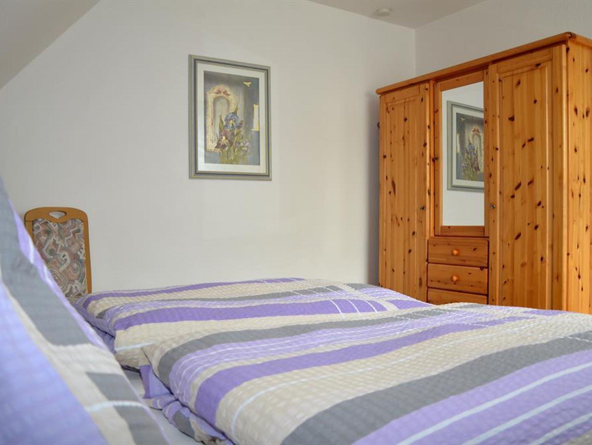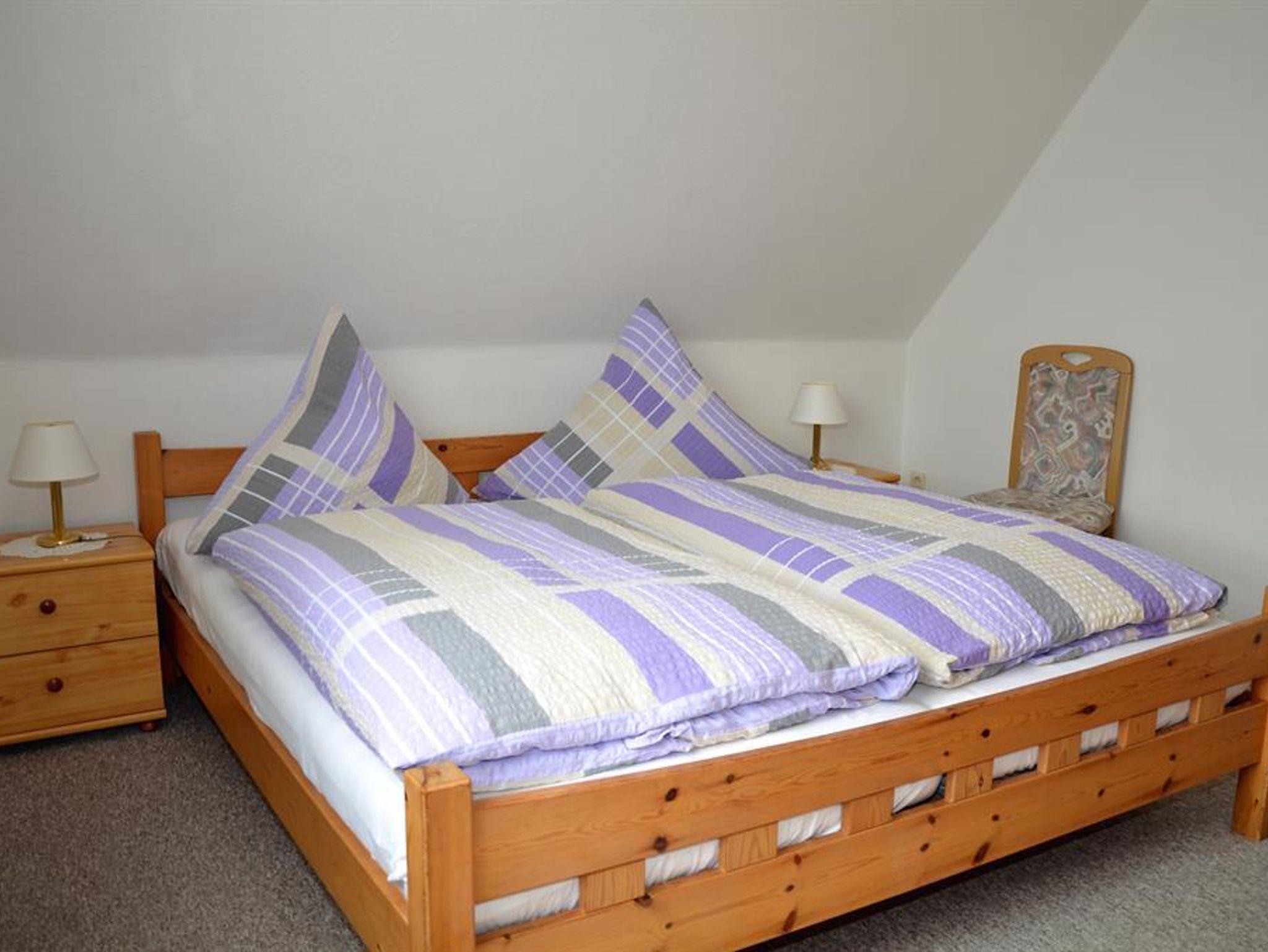 Gemütlich eingerichtete Ferienwohnung in der oberen Etage eines Einzelhauses. Wohnzimmer mit Essecke, 2 Schlafräume jeweils mit Doppelbetten, voll eingerichtete Küche, Badezimmer. Zustellbett ist auf Anfrage möglich. Es steht Ihnen W-Lan zur Verfügung. Diese Wohnung ist eine Nichtraucherwohnung.