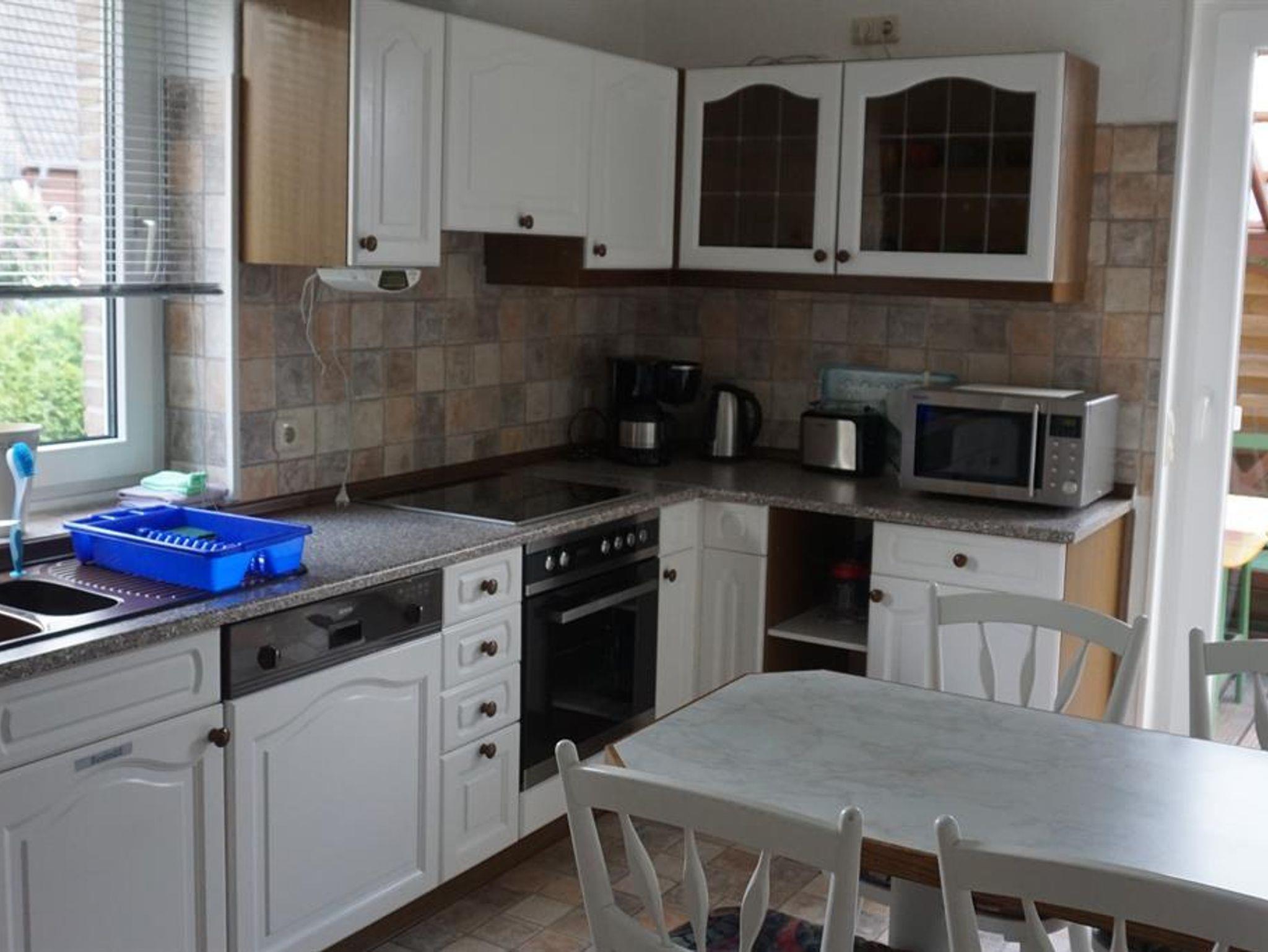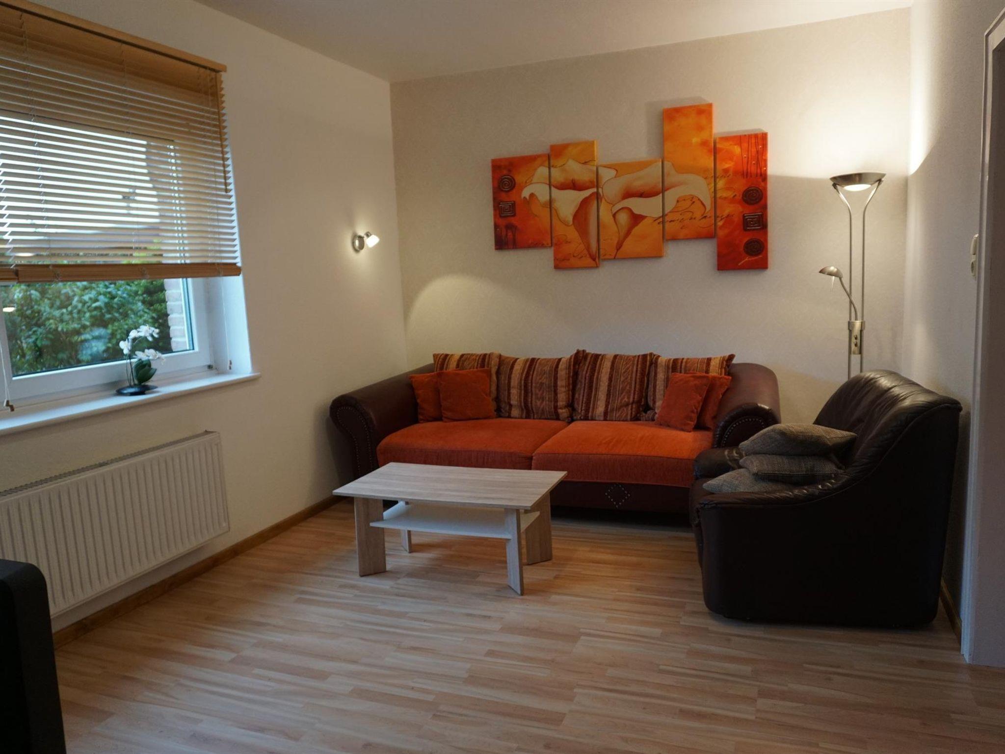 Die großzügige Wohnung liegt im Erdgeschoss unseres Ferienhauses. Über einen kleinen Flurbereich haben Sie Zugang zur Küche, einem Schlafzimmer (Doppelbett) und dem Wohnbereich mit einer gemütlichen Ledercouch sowie dem sich daran anschließenden zweiten Schlafzimmer (Einzelbetten). Von der vollausgestatteten Küche im Landhaustil mit dem bar-ähnlichen Essbereich erreichen Sie die überdachte Terrasse der ebenerdigen Ferienwohnung. Das Badezimmer ist ein modernes Duschbad mit WC.