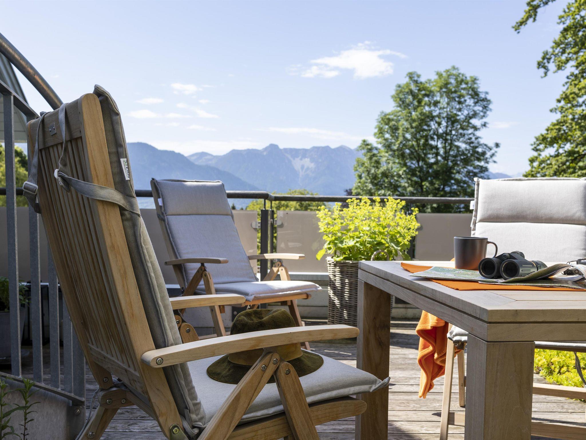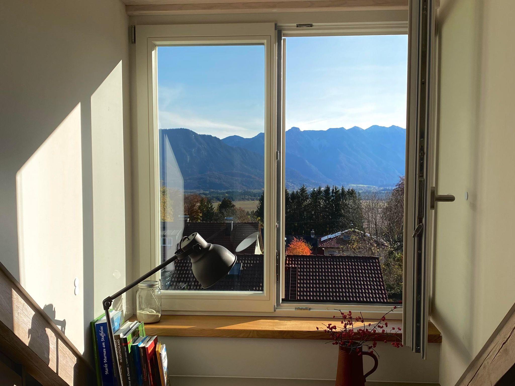 Wir stehen vor einer liebevoll restaurierten Villa und ahnen bereits die Aussicht, die wir aus den großzügigen Gauben der Dachwohnung genießen werden. Mit jeder Treppenstufe öffnet sich der grandiose Blick nach Südwesten bis zur Alpspitze. In wenigen Schritten befinden wir uns auf der begrünten Dachterrasse, die dank wunderbarem Weitblick zum Verweilen einlädt. Doch hier nehmen wir später Platz. Jetzt wollen wir noch höher hinauf. Mit jeder Stufe der Spindeltreppe erweitert sich das Panorama vom Naturschutzgebiet bis zu den Alpen.