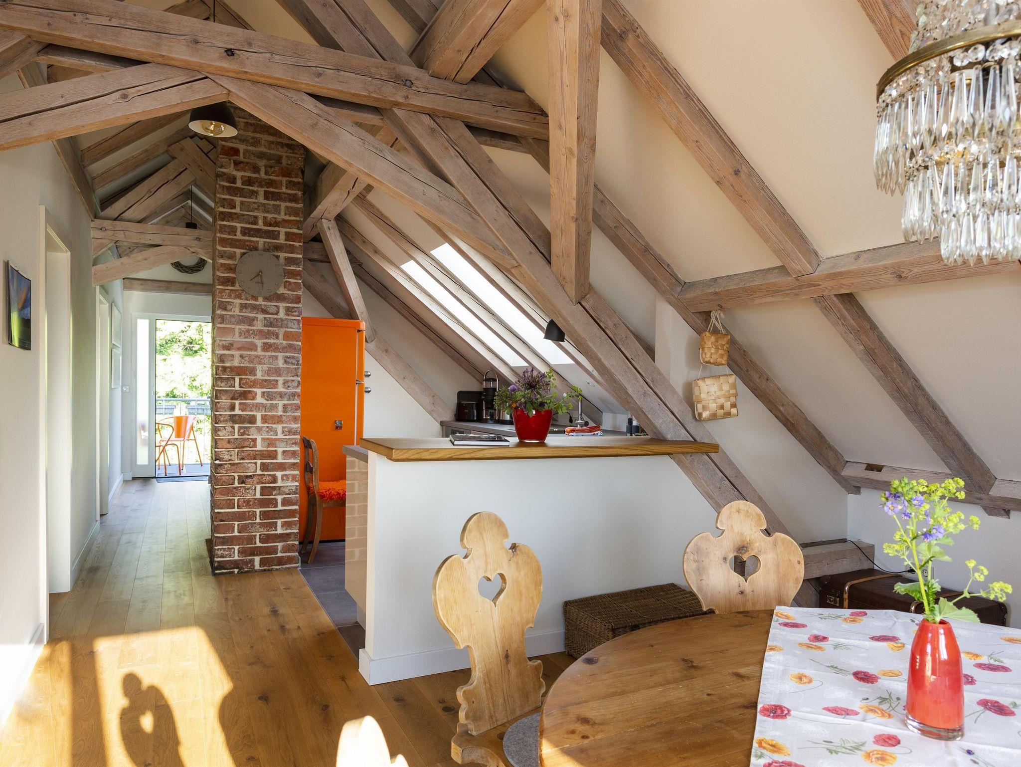 Zwei Schlüsselumdrehungen weiter öffnet sich die Wohnungstür und der unerwartete Anblick lässt uns für einige Sekunden innehalten. Die Szenerie wird dominiert von einem durchgängigen Eichendielenboden, der zum Wohnstudio führt, nur unterbrochen von einem Backsteinkamin, der neben dem freigelegten Dachgebälk einen rustikalen und archaischen Akzent in dieses Bühnenbild setzt.