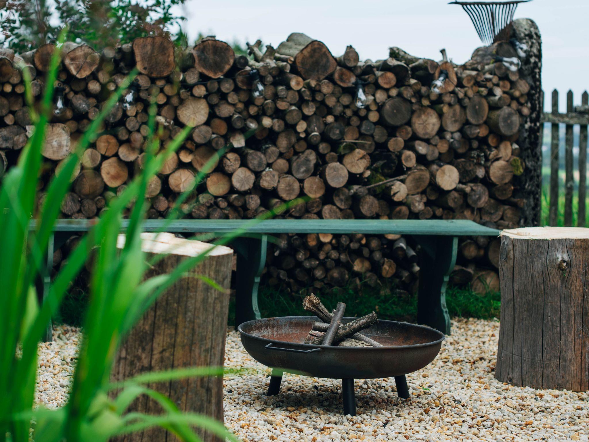 Für entspannte Abende am Lagerfeuer, gibt es in unmittelbarer Nähe der Terrasse eine Feuerstelle mit Sitzmöglichkeiten und einer Feuerschale.