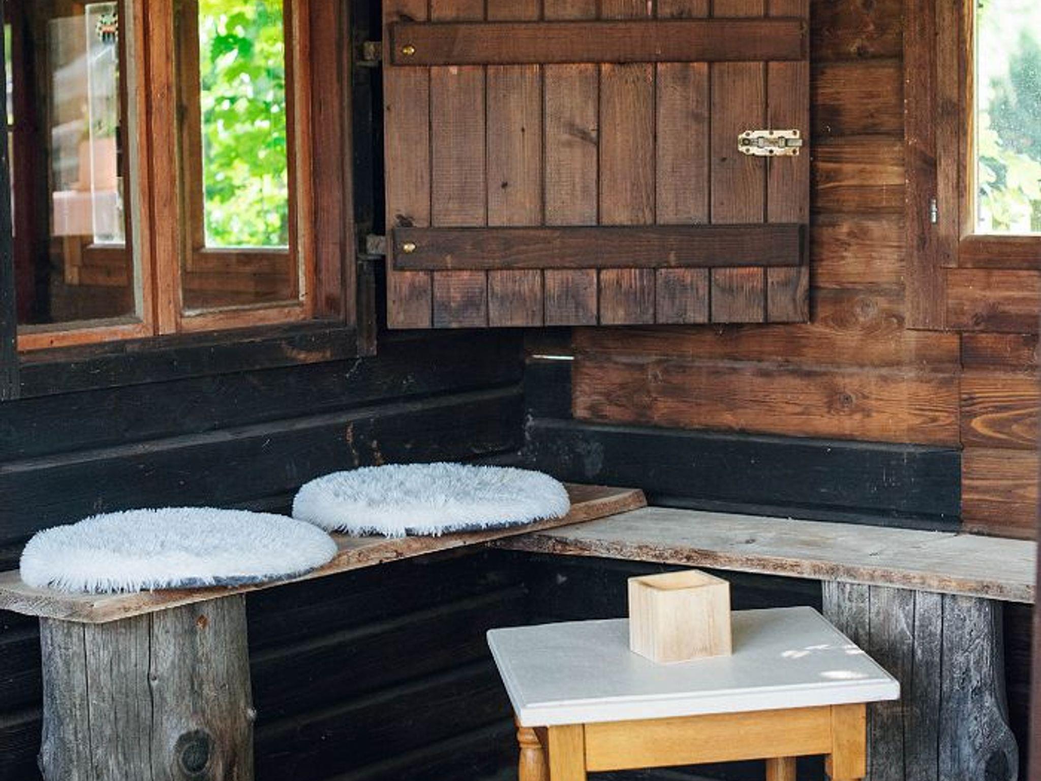 Auch die Veranda des Gartenhauses bietet eine urige Sitzgelegenheit aus Holz, hier kann man auch an Regen-Tagen Zeit im Freien verbringen.