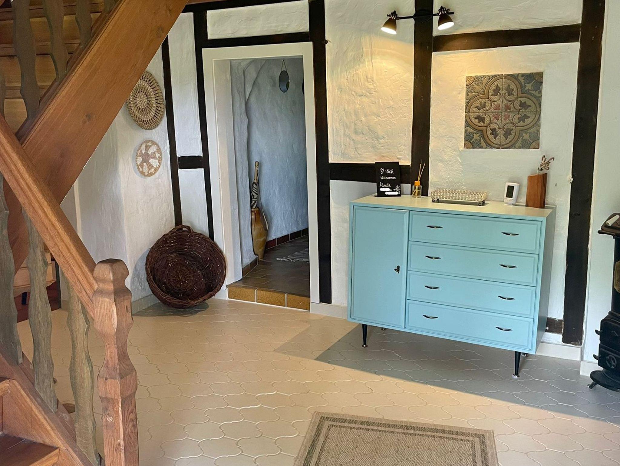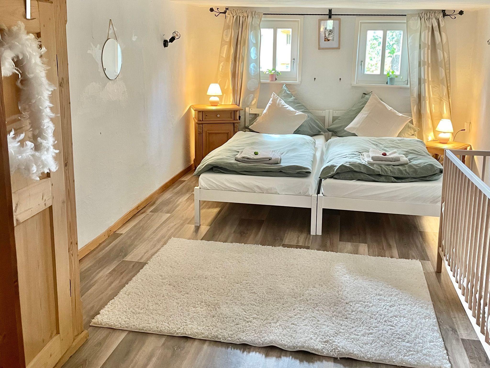 Durch die wunderschöne Holztreppe gelangen Sie in das OG des Hauses. Über einen großen Flur mit Sitzmöglichkeiten und einer Spielecke für Kinder, sowie einem Kicker geht es in das erste Schlafzimmer mit Doppelbett und einem Kinderbett. Hier sorgt das alte, gemütliche Fachwerk für Ruhe und Entspannung.