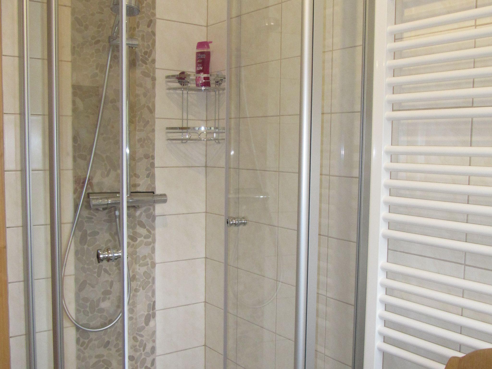 Das geräumige Badezimmer mit Dusche, Waschbecken und WC rundet das Gesamtbild ab.