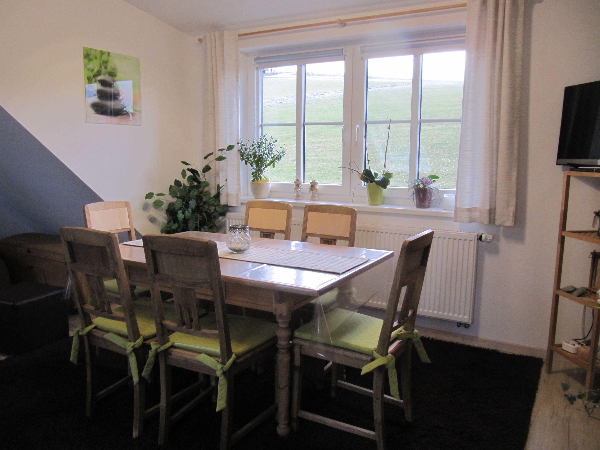 Das gemütliche Wohnzimmer verfügt über einen Flachbildfernseher, einen Esstisch, eine Schlafcouch sowie einen Sitzsack.
