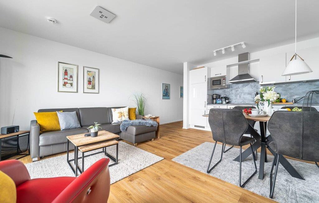 Denne skønne, lyse ferielejlighed med sine 56 m 2 ligger på 2. sal på havnepromenaden direkte i første række til vandet og byder på en hyggelig atmosfære til jeres luksusferie med sin eksklusive indretning og udstyr. Beliggenheden er perfekt, centralt men roligt, lige ved havnepromenaden med korte afstande til indkøb og de bedste muligheder for slentretur. Ferielejligheden imponerer også med den vellykkede rumlige forbindelse af det moderne, fuldt udstyrede tekøkken og den eksklusive opholdsstue. Heri finder I et highboard med TV, lædersofa med lang stol, som kan laves om til en ekstra seng (120 x 200 cm) på få trin. En behagelig lænestol inviterer jer til at slappe af, og mange andre tilbehør giver jer mange muligheder for at føle jer godt tilpas.