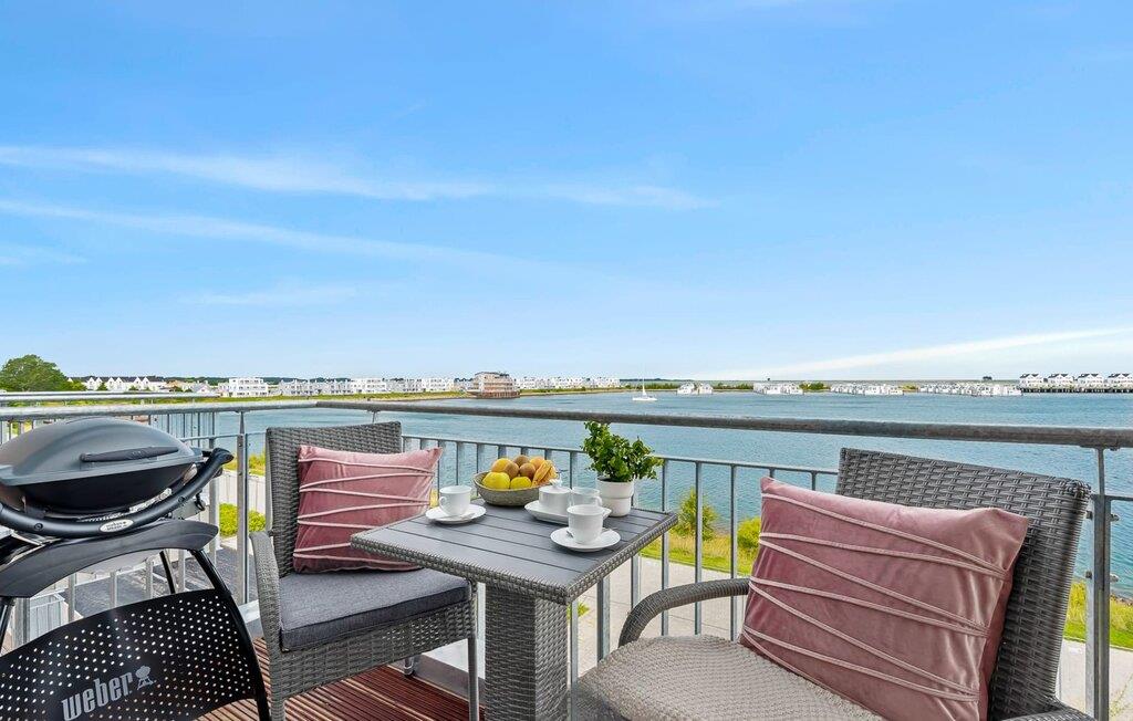 Fra balkonen kan man med sine moderne udendørsmøbler iagttage hele sejl- og sportsbådsområdet op til fyrtårnet ved slimets udmunding og opleve og nyde Østersøhavnen. Ferielejligheden kan nemt nås via elevator fra den helt tætte, separate parkeringsplads.