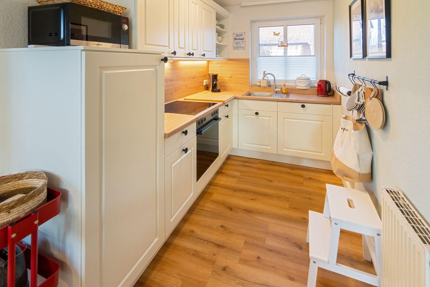Die Küche ist hochwertig ausgestattet mit Induktionsherd, Backofen, Spülmaschine, Mikrowelle, Kühlschrank mit Gefrierfach sowie Kaffeemaschine, Senseo-Kaffeepadmaschine, Toaster, Wasserkocher und umfangreichem Küchenzubehör. Vom Wohn- und Essbereich aus gelangen Sie direkt auf die Terrasse.
