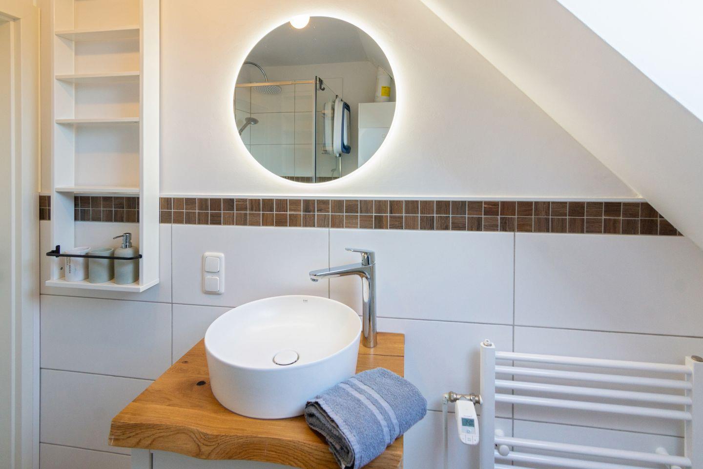 Im Obergeschoss befinden sich zwei Schlafzimmer, jeweils mit eigenem Fernseher, sowie ein modernes Duschbad mit bodengleicher Dusche und WC.